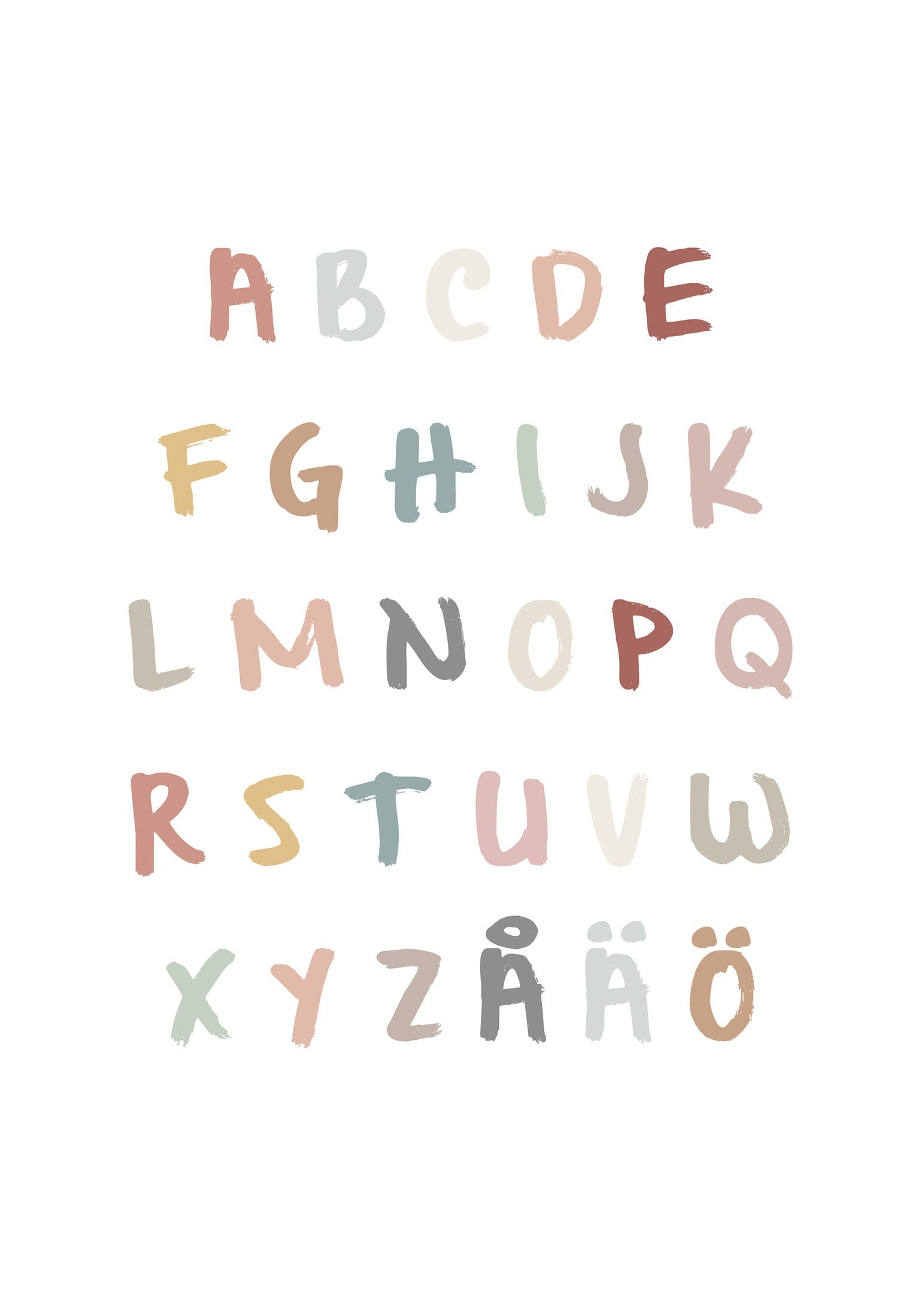Ge barnrummet en lekfull och pedagogisk inredningsdetalj med denna stilrena alfabetsposter i mjuka, harmoniska färger. Ett inspirerande sätt att göra bokstäver till en naturlig del av vardagen! Passar perfekt över skrivbordet eller sängkanten och är en uppskattad present till födelsedagar eller skolstart.