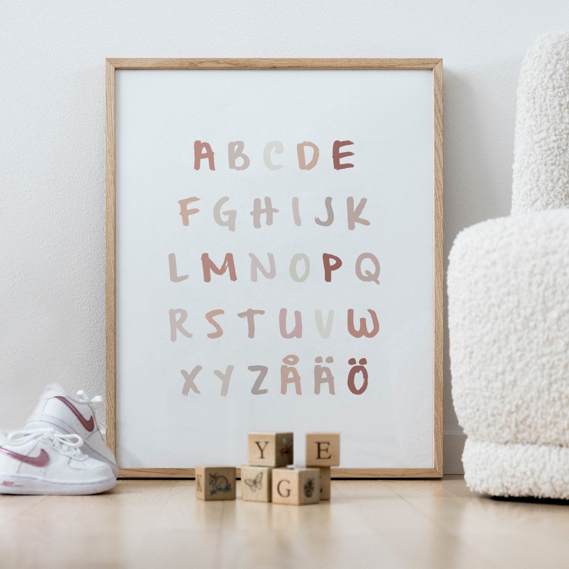 En pedagogisk och dekorativ alfabetsposter i mjuka rosa nyanser. Perfekt för barnrummet, denna ABC-poster gör lärandet roligare samtidigt som den blir en fin inredningsdetalj. De handmålade bokstäverna i varma toner skapar ett harmoniskt uttryck som passar lika bra i en lekfull miljö som i ett mer stilrent rum. En inspirerande barnposter som kombinerar lärande och design på ett vackert sätt.