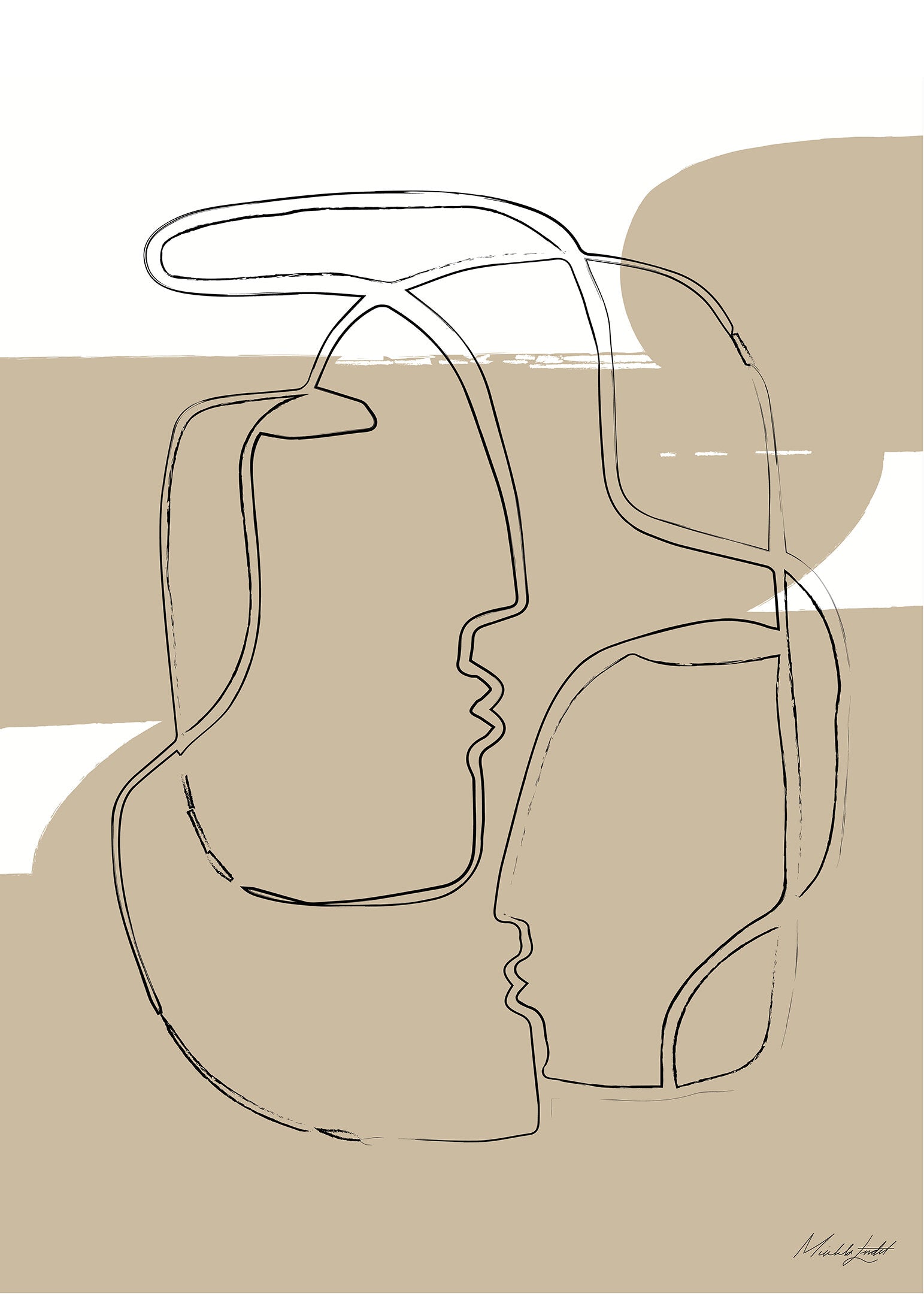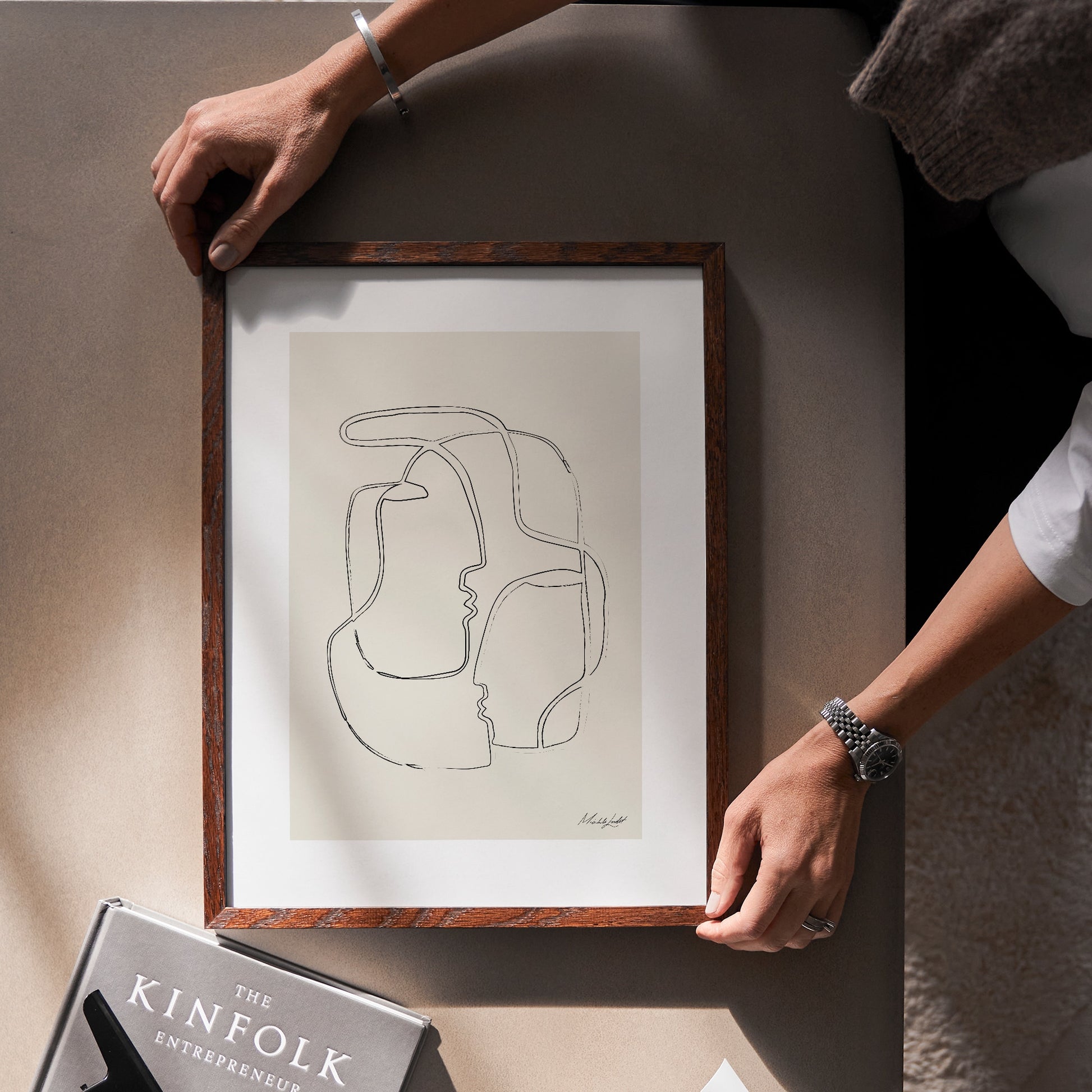 En grafisk illustration av två ansikten i ett sammanflätat linjemotiv. Den minimalistiska designen och de mjuka formerna ger ett modernt uttryck som passar i alla typer av inredningsstilar. En tidlös poster som fungerar lika bra ensam som i en kombination med andra motiv.
