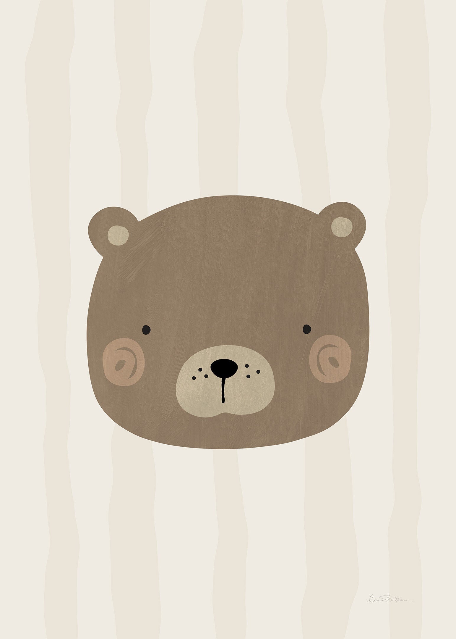 Barnposter med en mjuk och rosig björn, mot en lekfullt randig bakgrund.