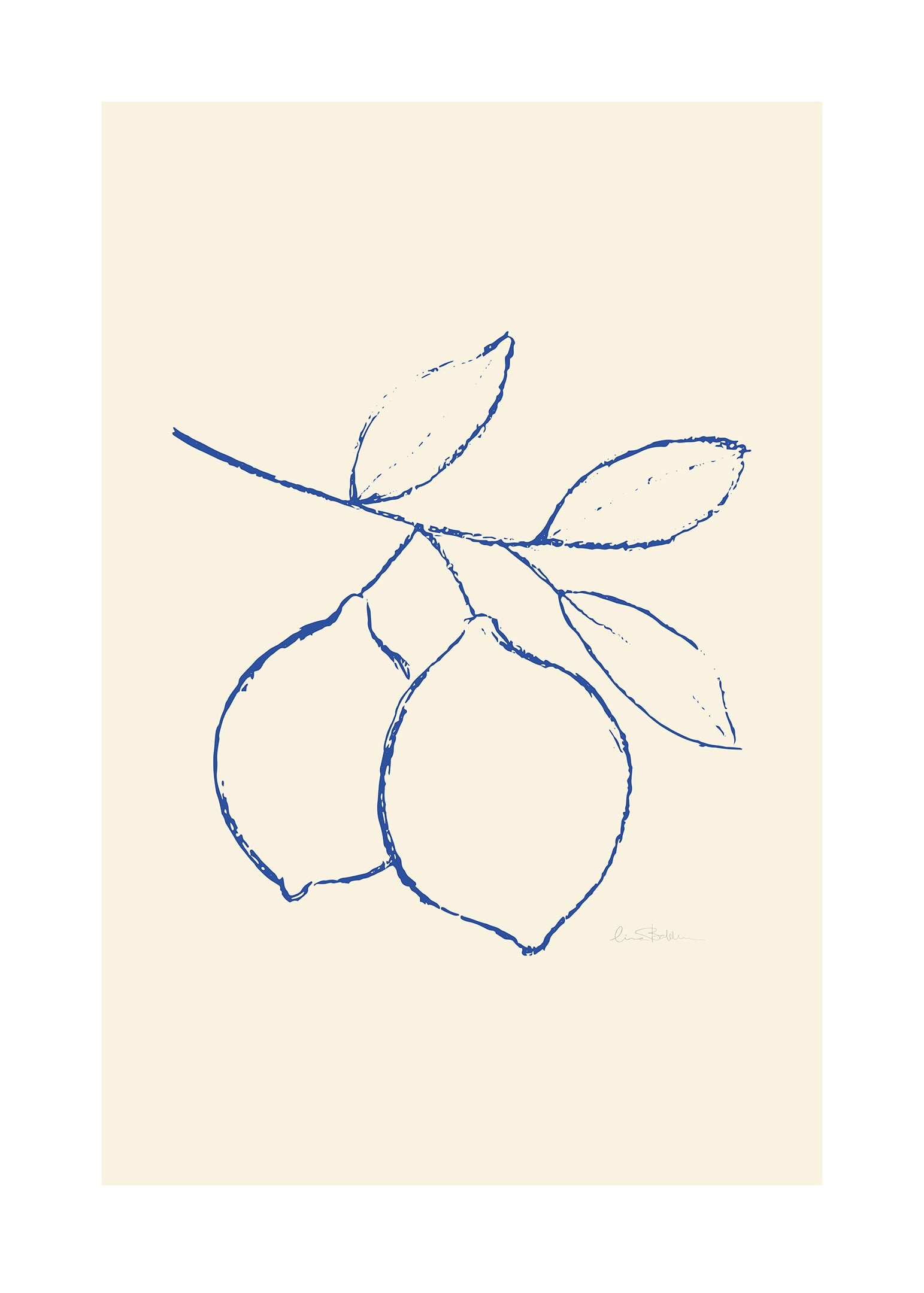 Illustration av två citroner hängande från en gren, i stilrena blå linjer mot en mjuk beige bakgrund. Perfekt som en poster i köket eller i anslutning till middagsbordet.