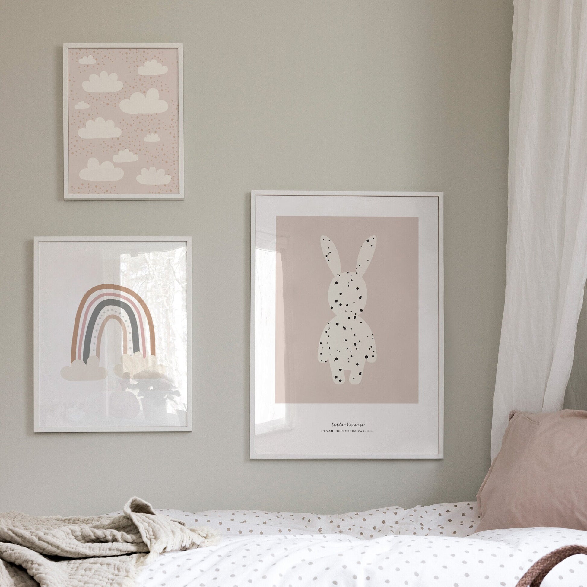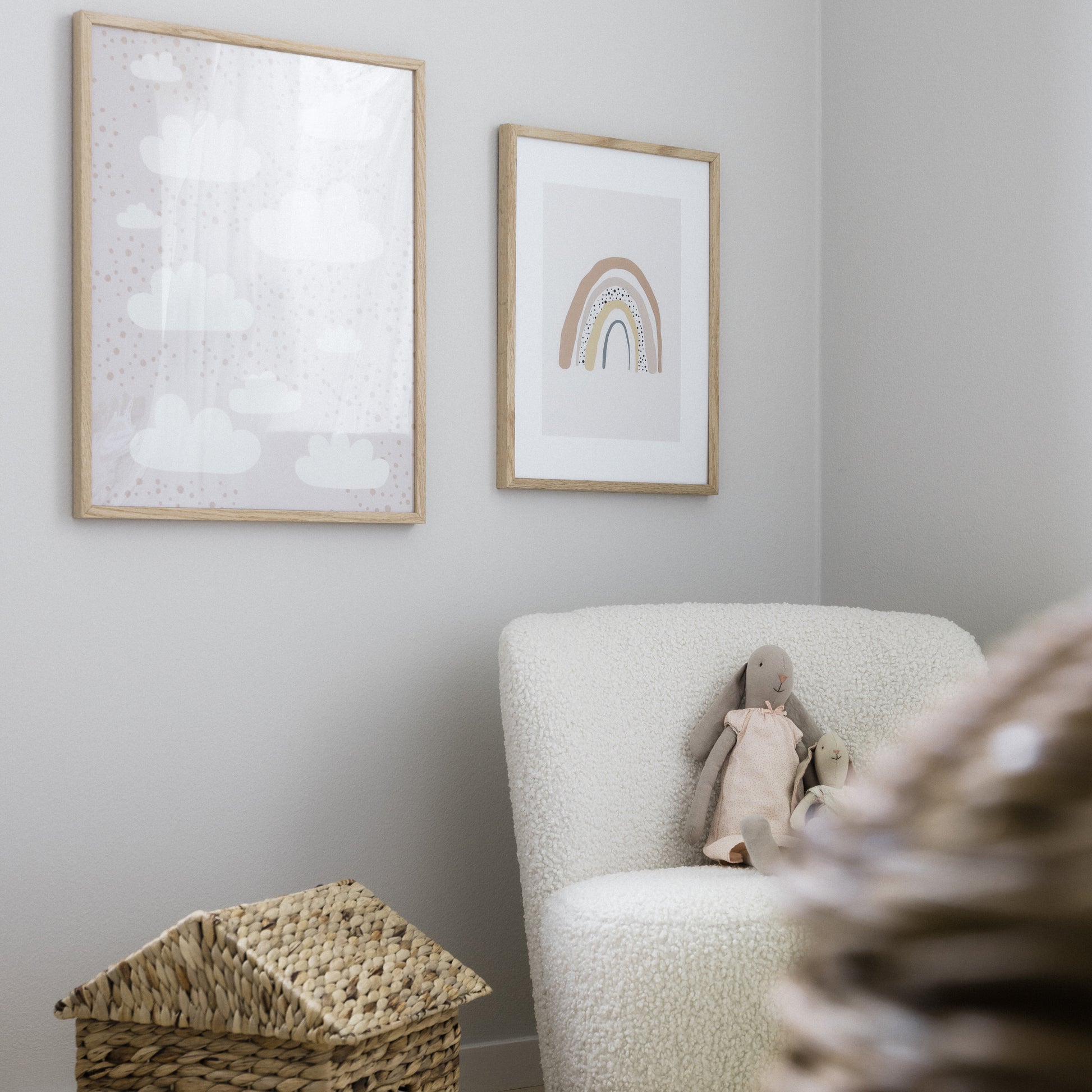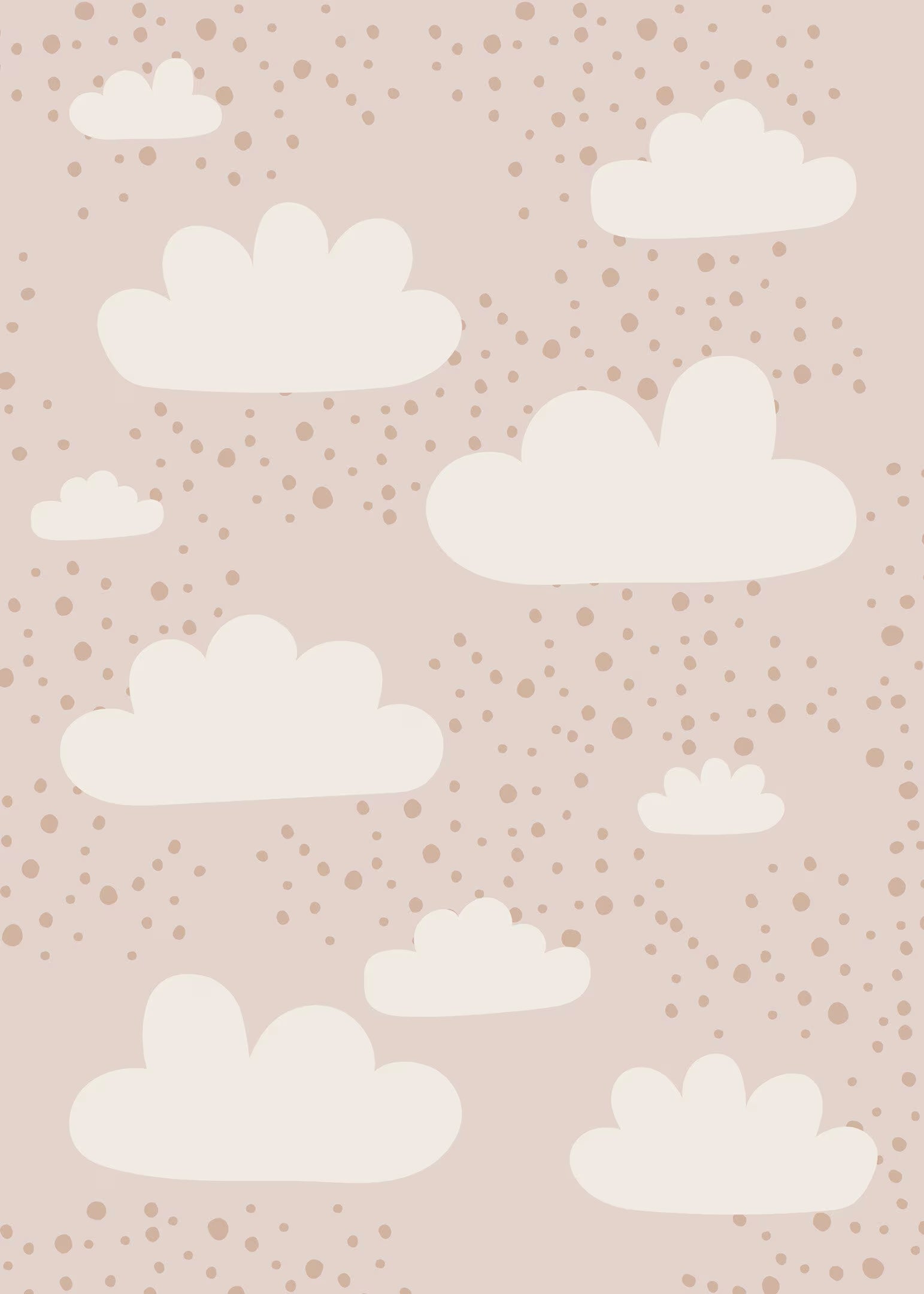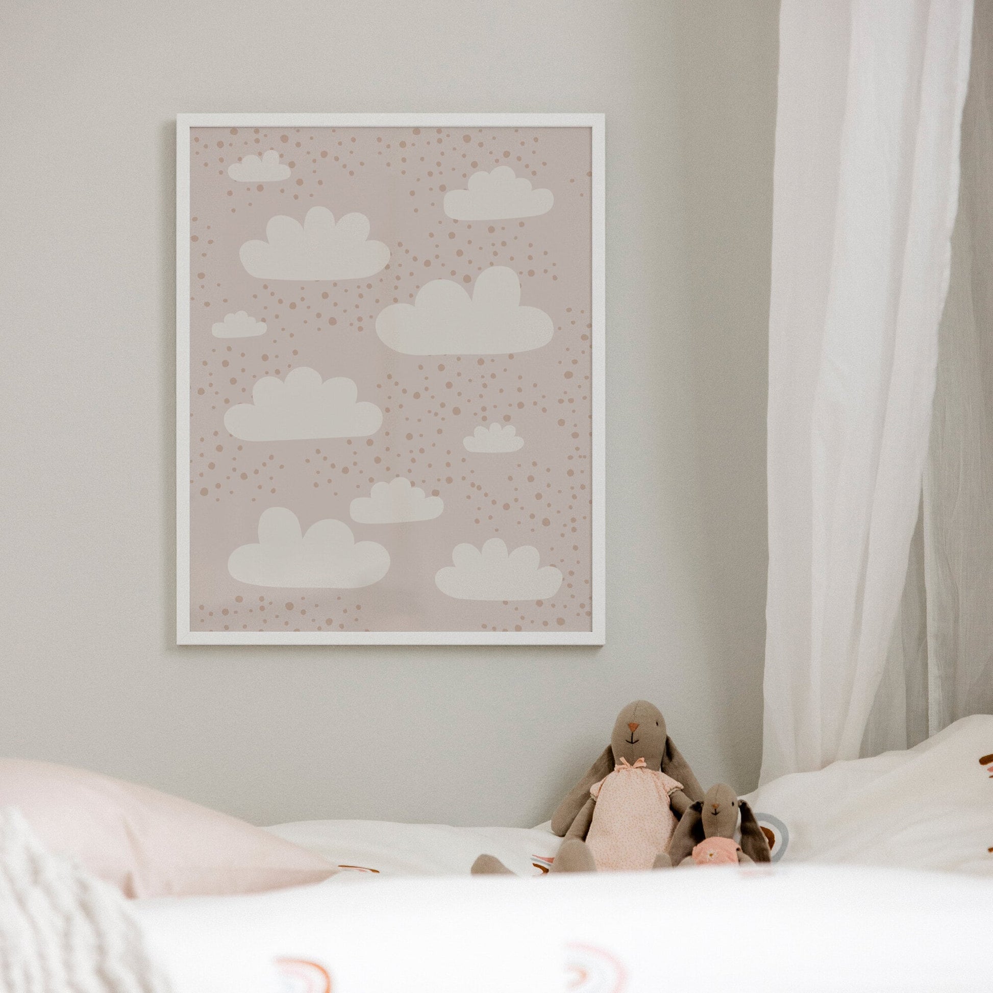 Moln och regn illustreras mjukt och inbjudande i detta motiv. Fint i barnrummet, antingen i en lekfull tavelvägg eller i stilren avskildhet.