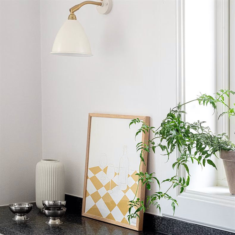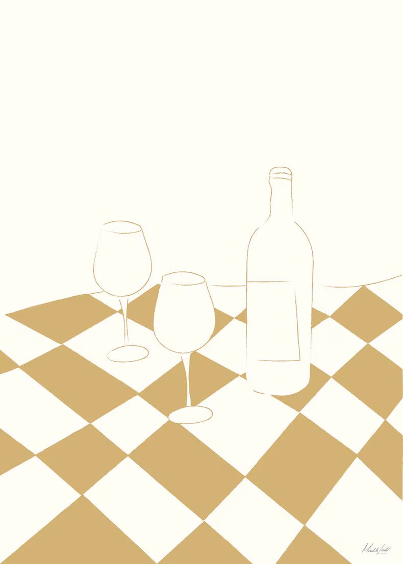 Grafiskt motiv av två glas, en flaska och en rutig duk. Motivet är en del i vår köks- och matplatskollektion, som är lika fina separat placerade som i en tavelvägg.