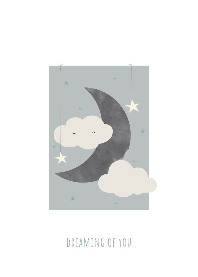 Skapa en rogivande atmosfär i barnrummet med Dröm sött blå – en harmonisk poster med en sovande måne, mjuka moln och glimrande stjärnor. De dämpade blå nyanserna och det lugna motivet gör den perfekt att hänga ovanför sängen för att ge en trygg och mysig känsla vid läggdags. Passar lika bra i det första barnrummet som en fin present till en liten drömmare.
