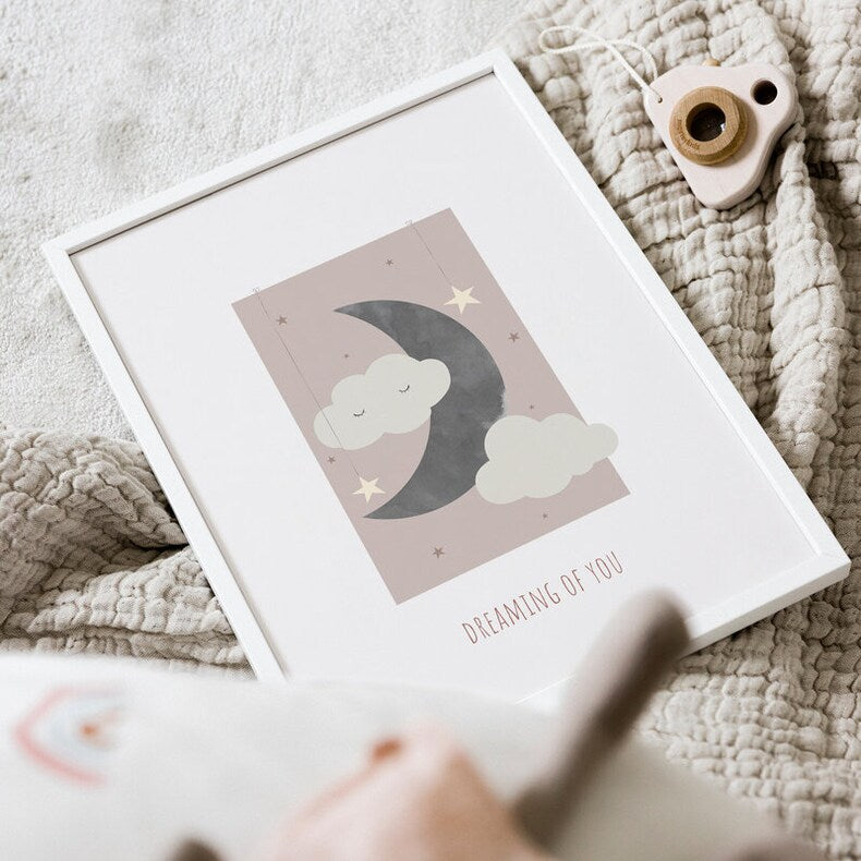 Låt ditt barn drömma sött med detta gulliga motiv över sängen. Bland månen, stjärnor och moln i mjuka färger tar drömmarna form – och allting är möjligt.