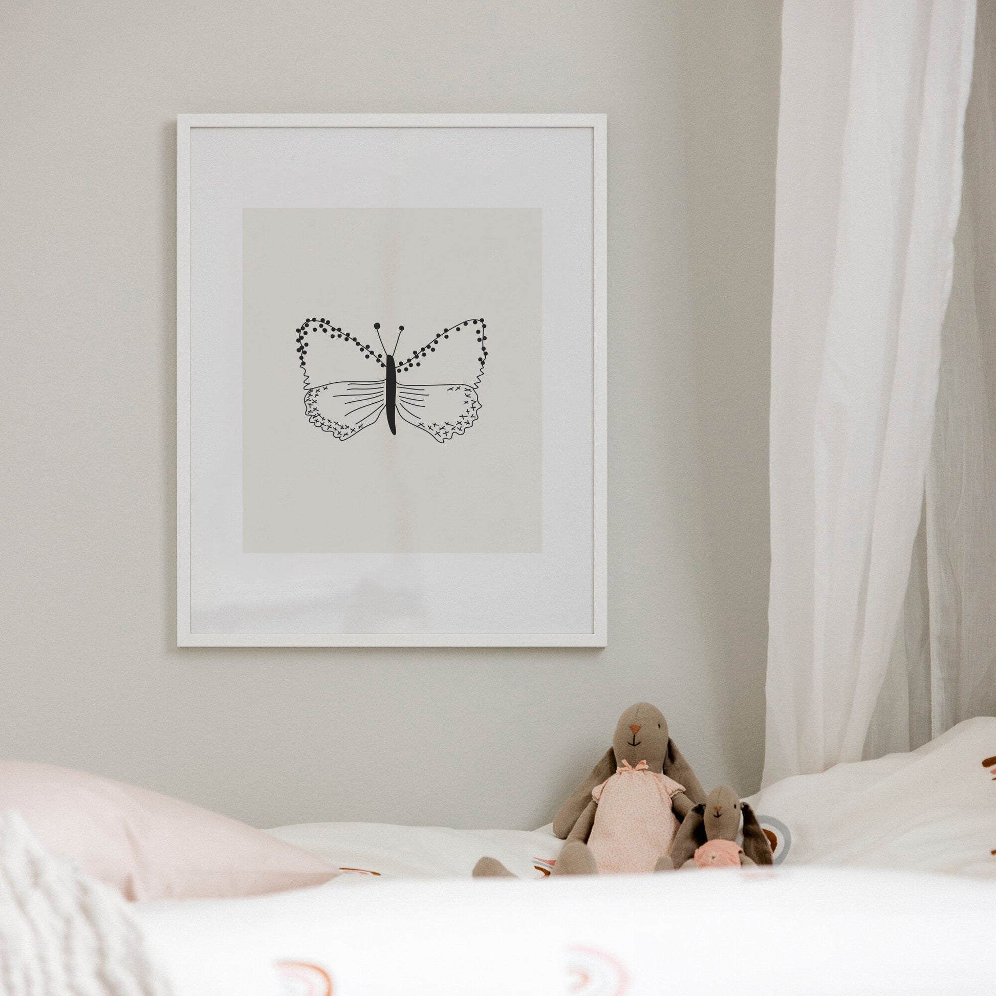Poster med fjäril på beige bakgrund som tack vare sin avskalade, lugna framtoning passar lika fint i barnrummet – som i ett helt annat rum i hemmet.