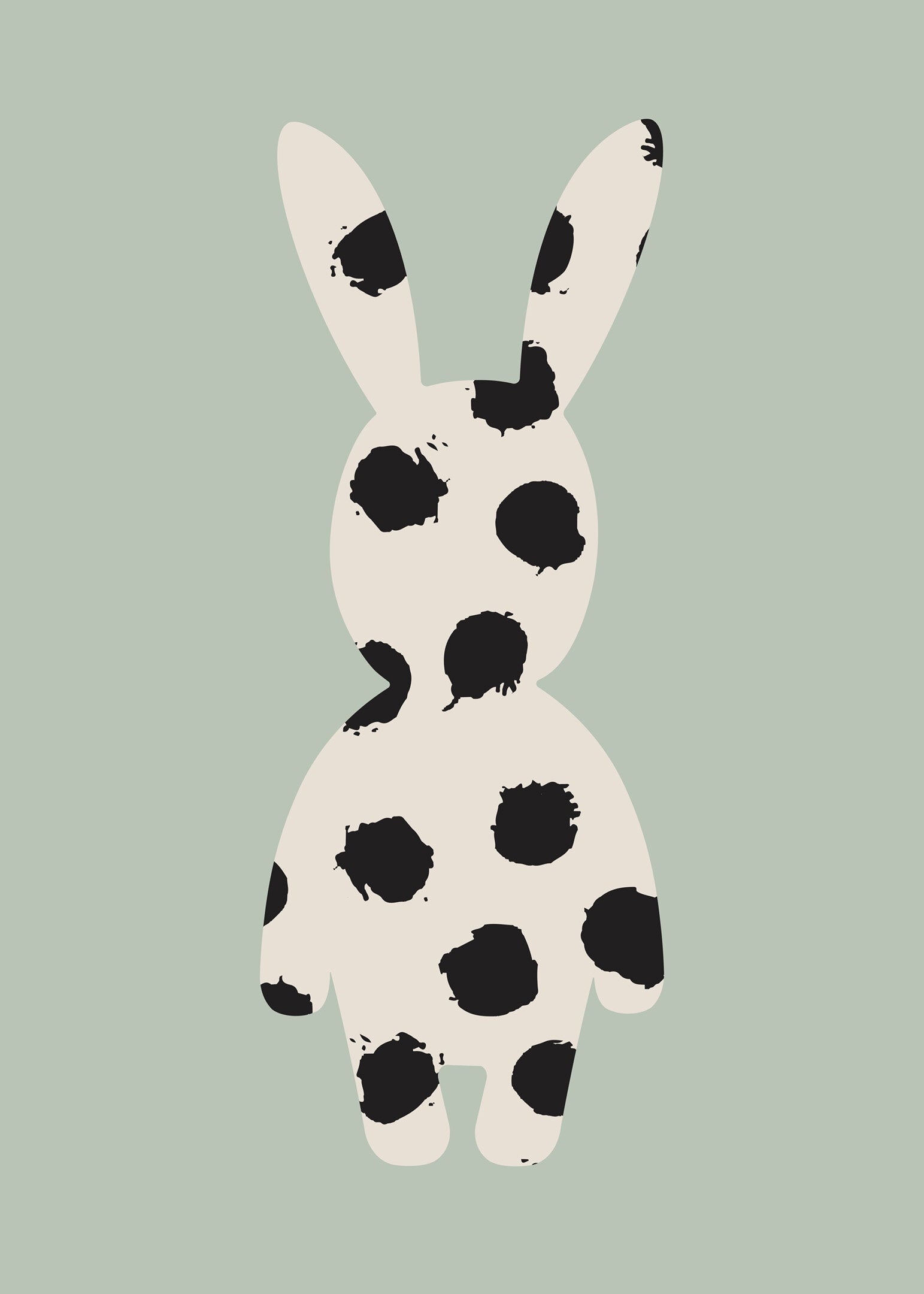 En liten fläckig kanin tar plats i denna gröna poster som passar väl in i ett avskalat barnrum, eller som ett lugnt inslag i den busiga tavelväggen. Missa inte Kaninkompisar och Små kaninkompisar, som porträtterar fler små kaniner!