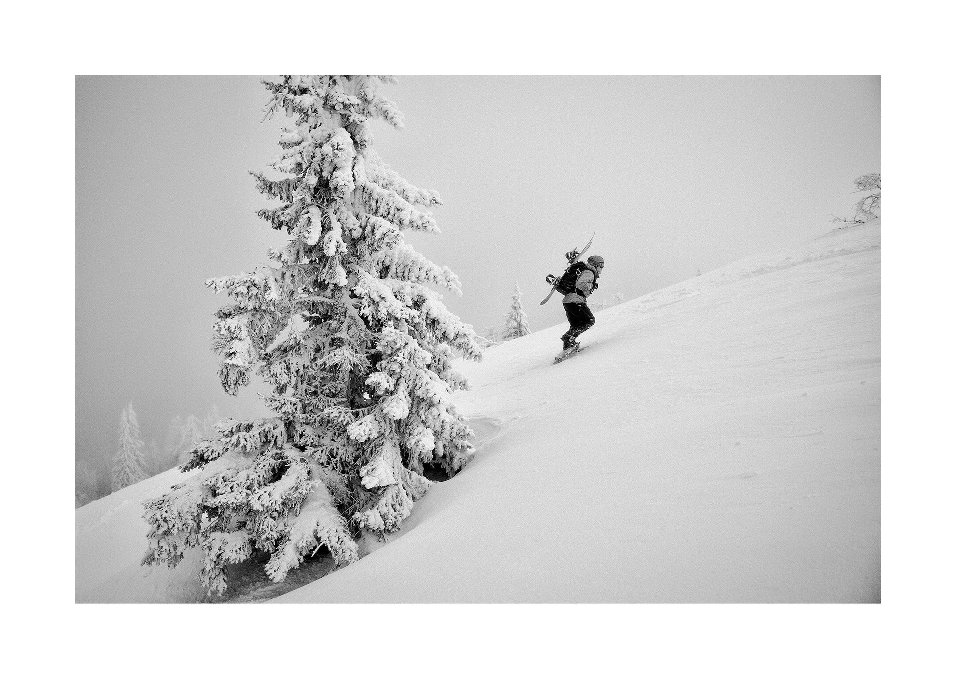 Svartvitt fotografi av en skidåkare som tar sig fram i svenskt vinterlandskap. Fotografiet är taget i norra Sverige.