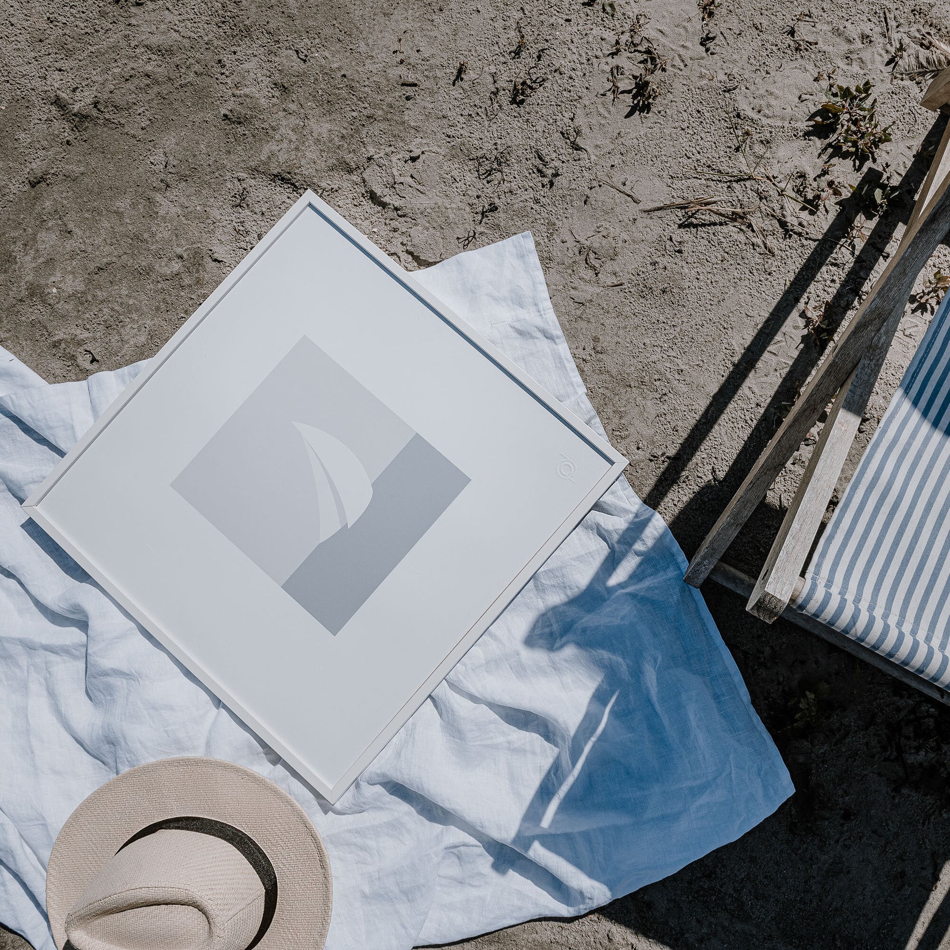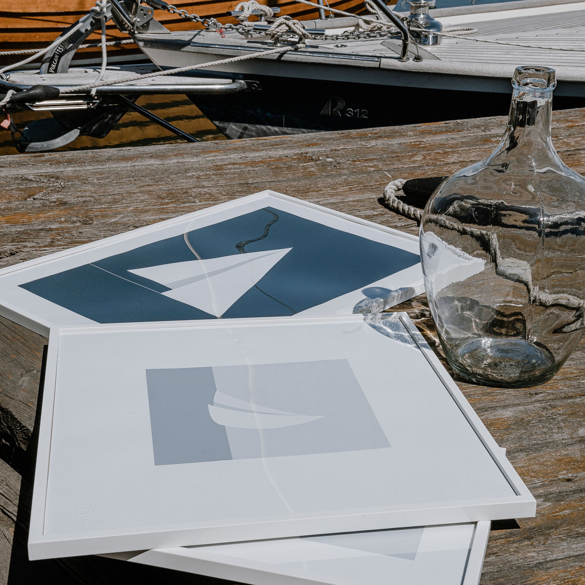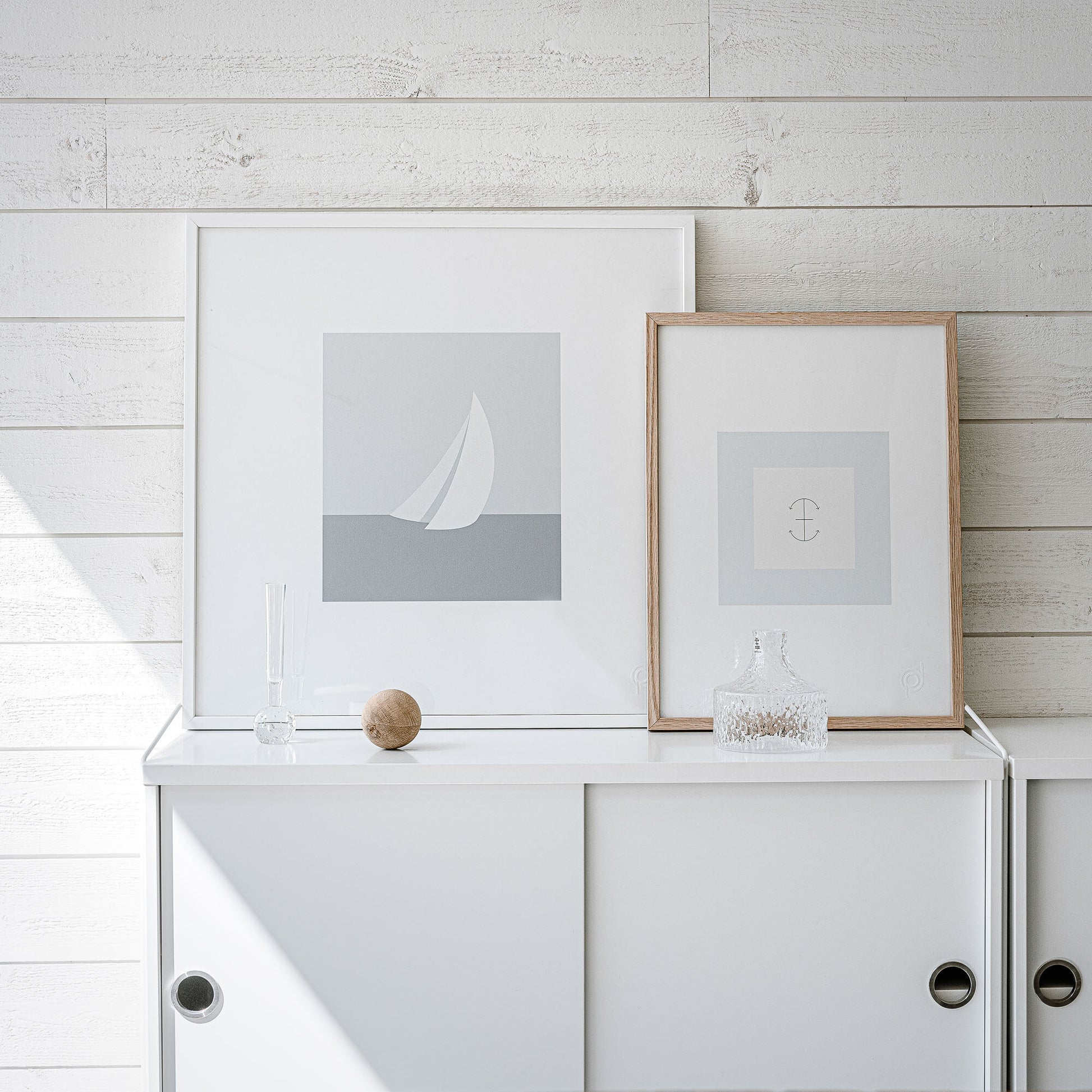 En stilren grafisk poster av en segelbåt som glider fram över havet. De mjuka blå tonerna skapar en känsla av lugn och frihet – perfekt för sommarstugan, skärgårdshemmet eller för dig som älskar segling och havets vidder.