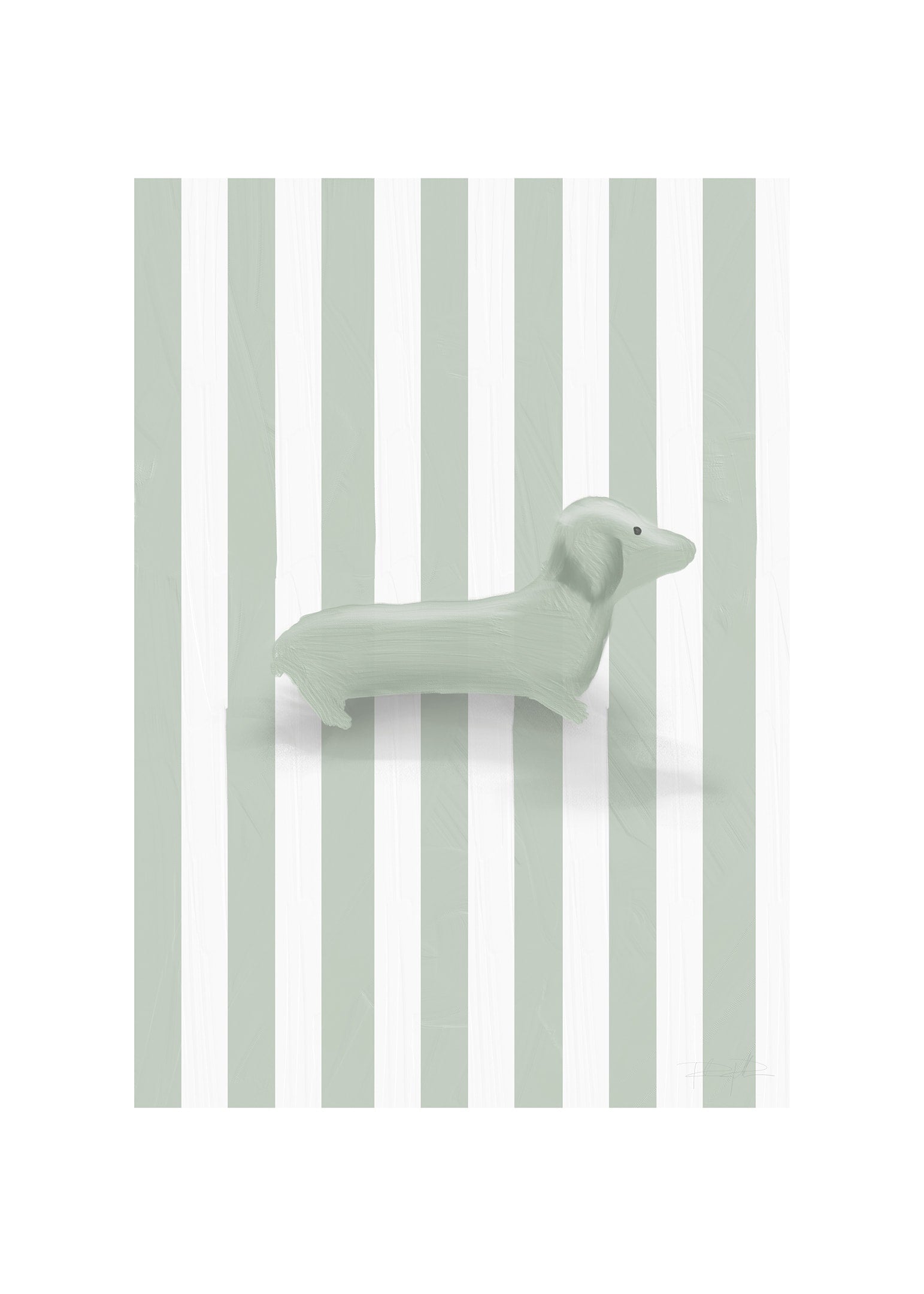 Ge ditt barns rum en söt och färgglad kompis med vår Tax poster i grön pastell. Denna charmiga illustration visar en bedårande grön tax mot en bakgrund av mjuka pastellfärgade ränder. Perfekt för att skapa en mysig och lekfull atmosfär i barnrummet.