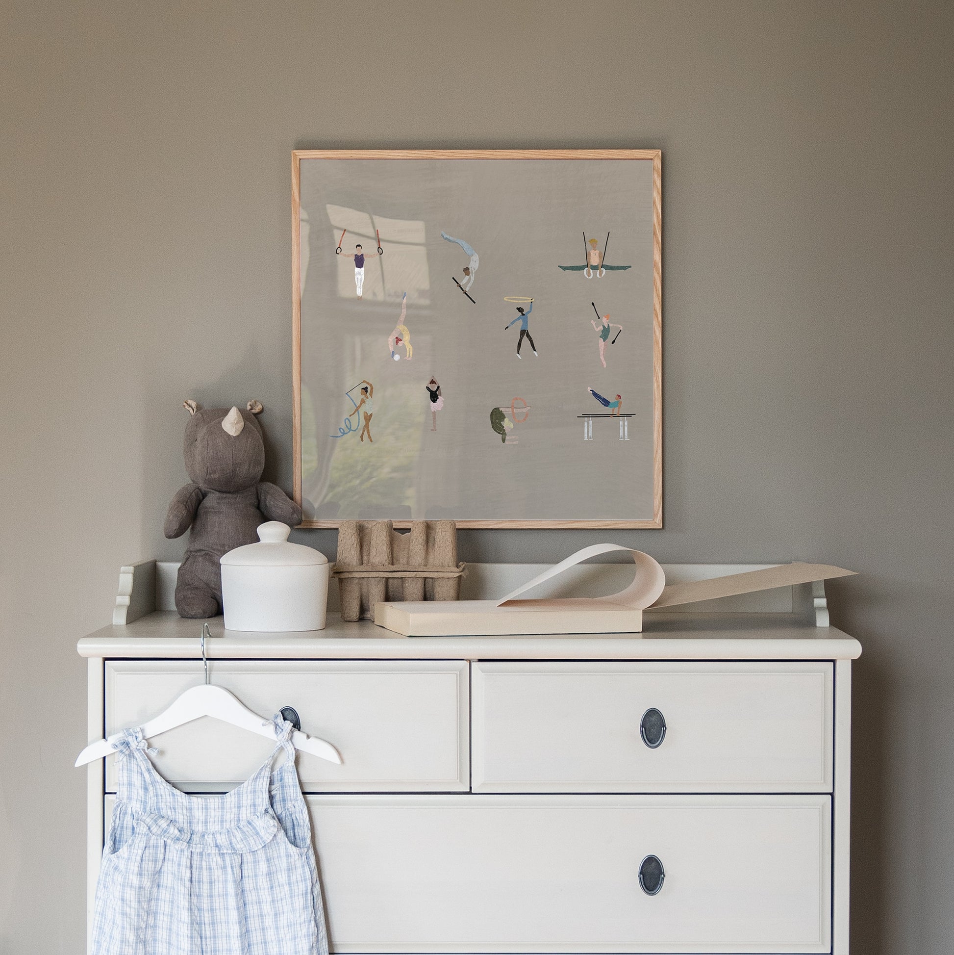 Fånga barnens fantasi och rörelseglädje med vår Gymnaster poster! Motivet visar en livfull samling gymnaster som utför olika övningar, från graciösa balanser till dynamiska akrobatiska moment. Den färgstarka och lekfulla designen är perfekt för att skapa en inspirerande och energifylld atmosfär i barnrummet, lekrummet eller andra kreativa utrymmen.
