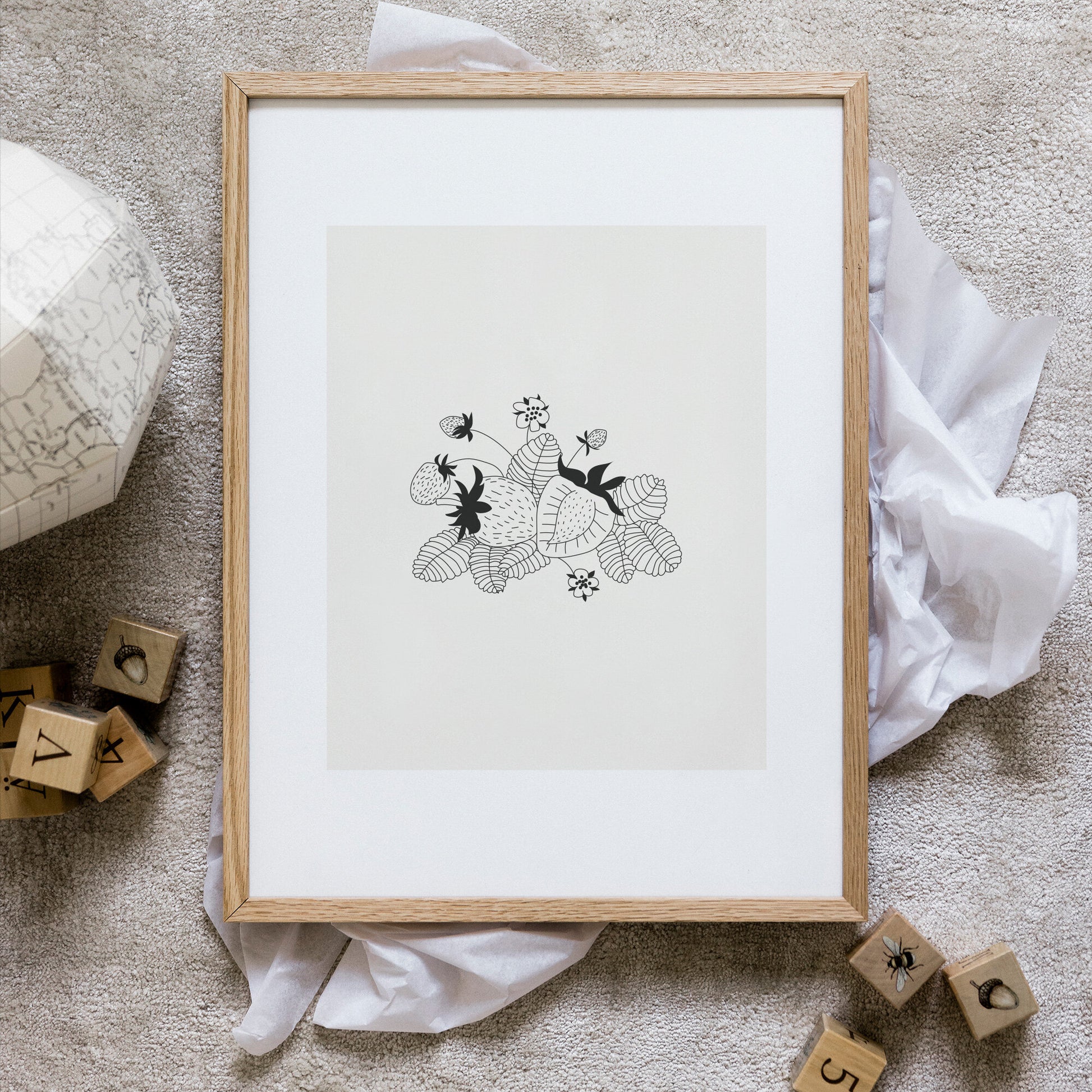 Poster med en jordgubbsplanta i ett avskalat, stilrent formspråk, som fångar det (kanske) somrigaste som finns. Det beige motivet passar lika fint i barnrummet, som i köket _– eller varför inte sommarhuset?