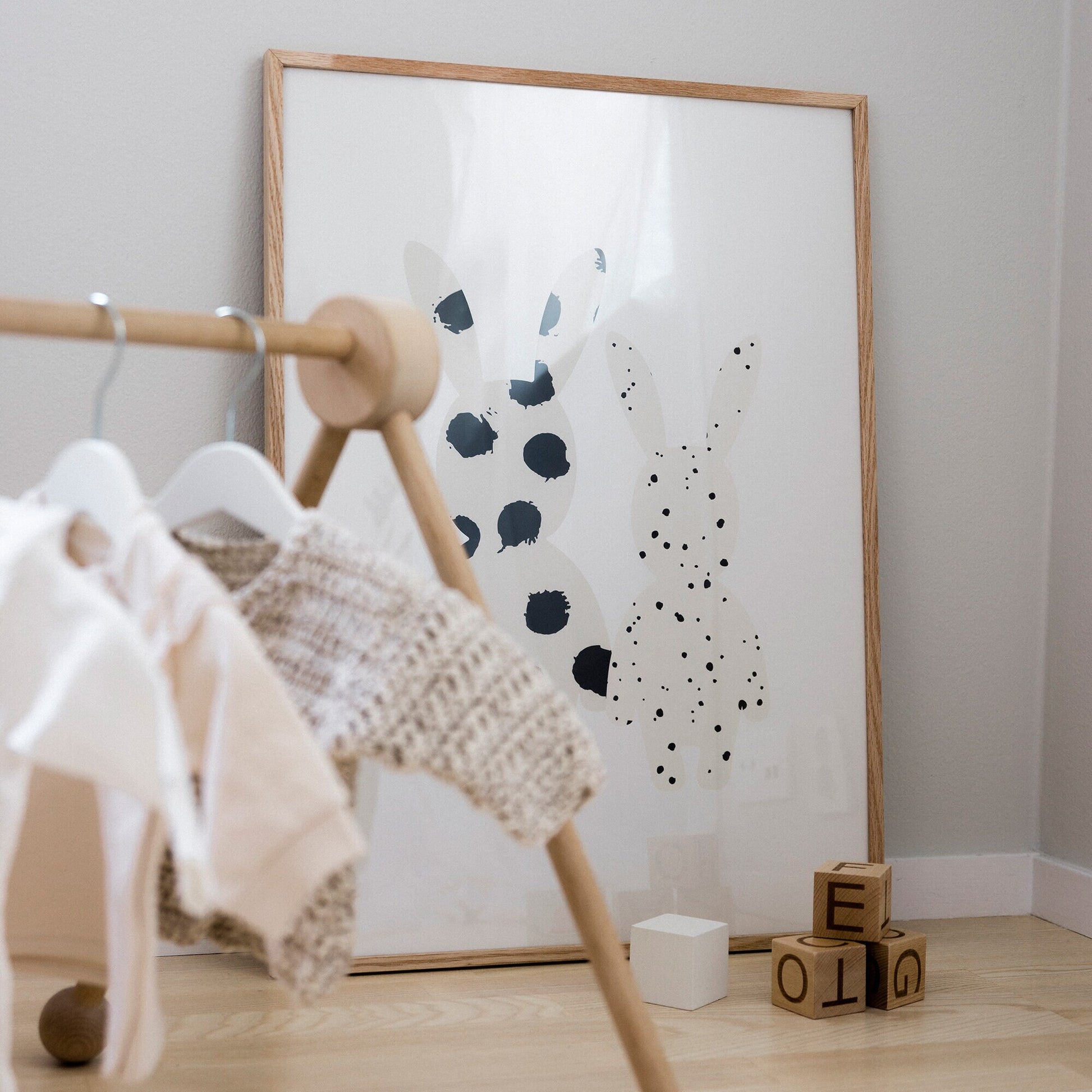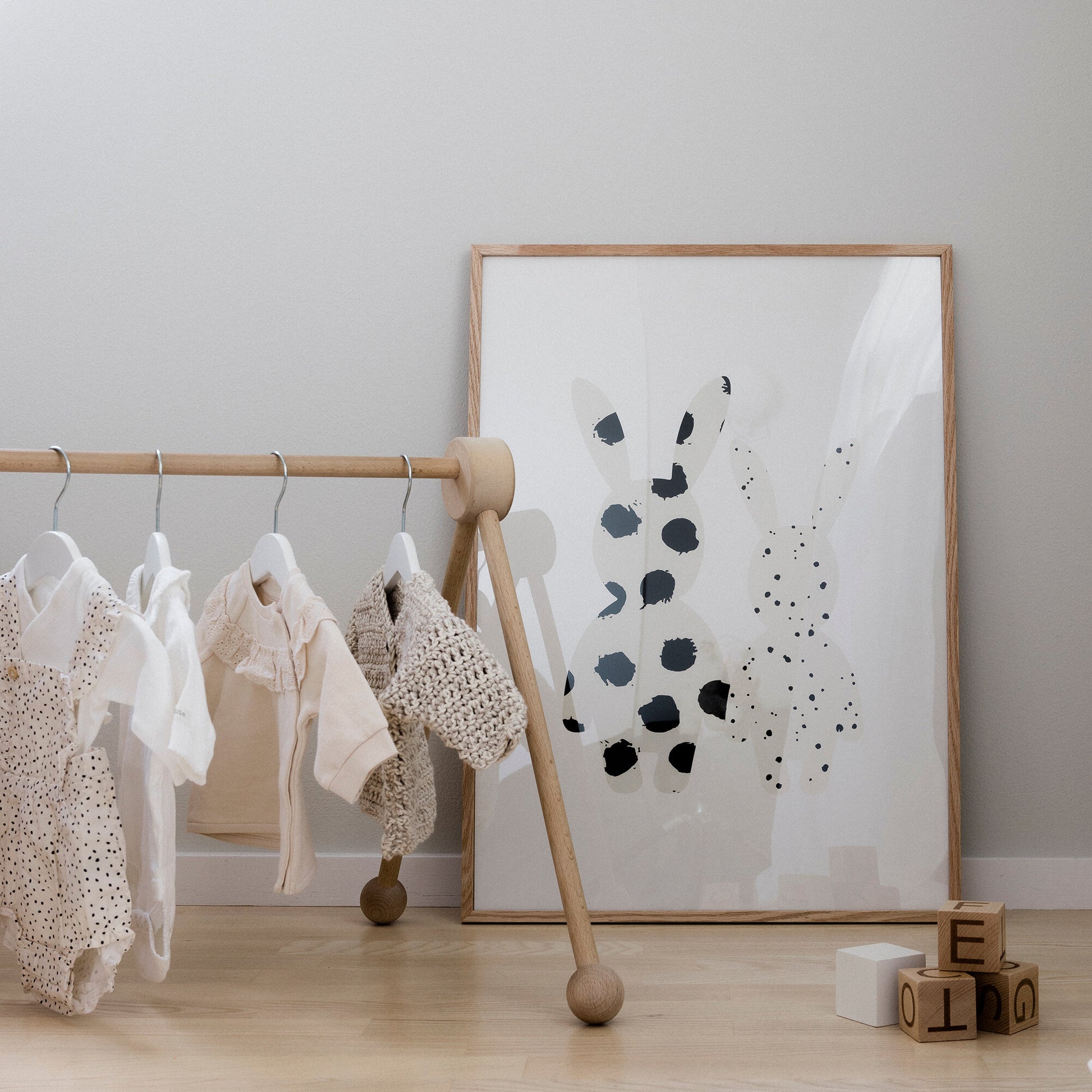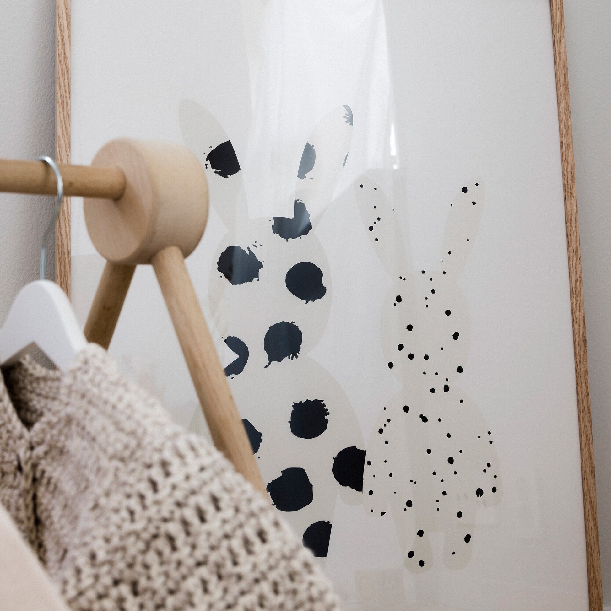 En charmig och lekfull poster med två kaninkompisar i mjuka beige och svarta toner. Prickarna ger motivet en lekfull känsla och gör den till en av våra mest älskade barnposters. Perfekt för att skapa en mysig atmosfär i barnrummet. Passar lika bra ensam som i en tavelvägg med andra gulliga motiv.