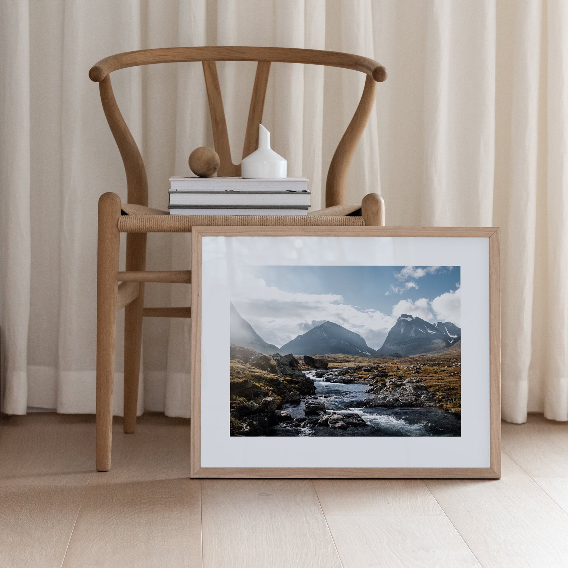Fotografi av bäck ringlandes nerför det storslagna Kebnekaise. Stillsamt uttryck med extra djup, delvis tack vare bergstopparna i bakgrunden.