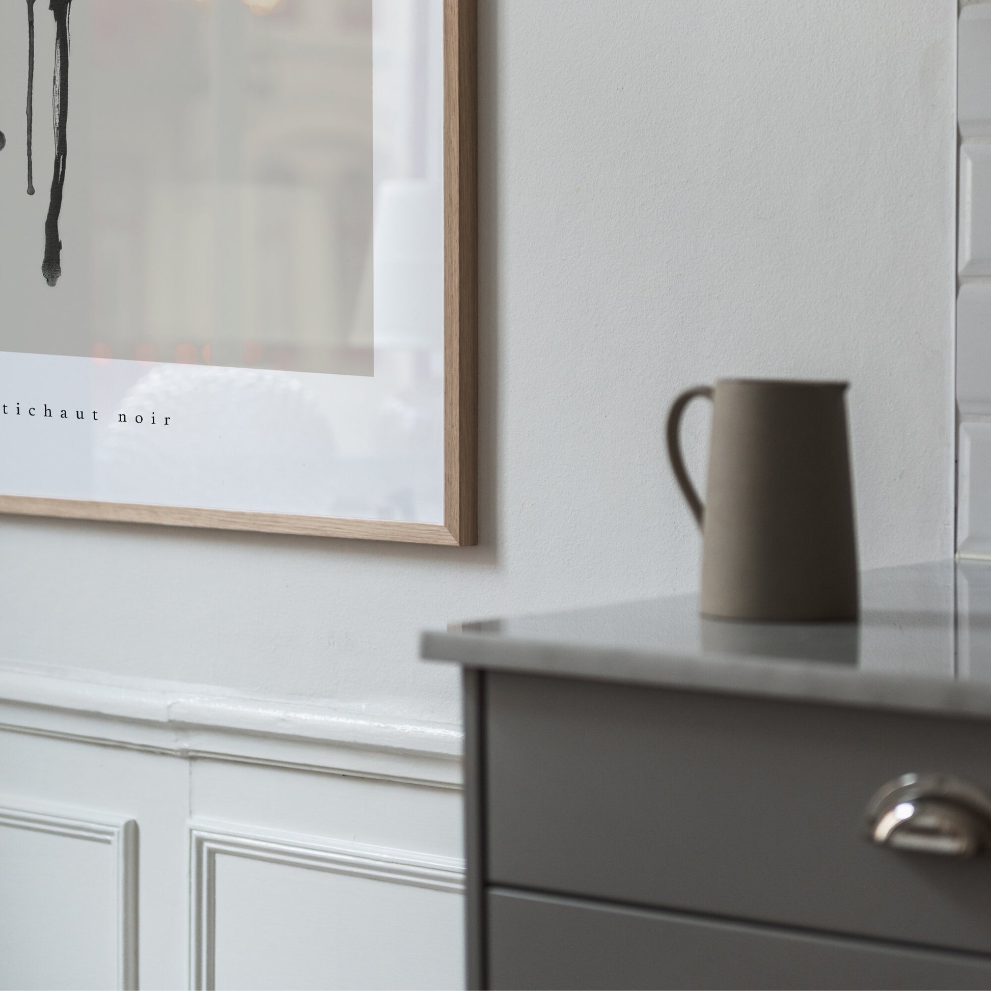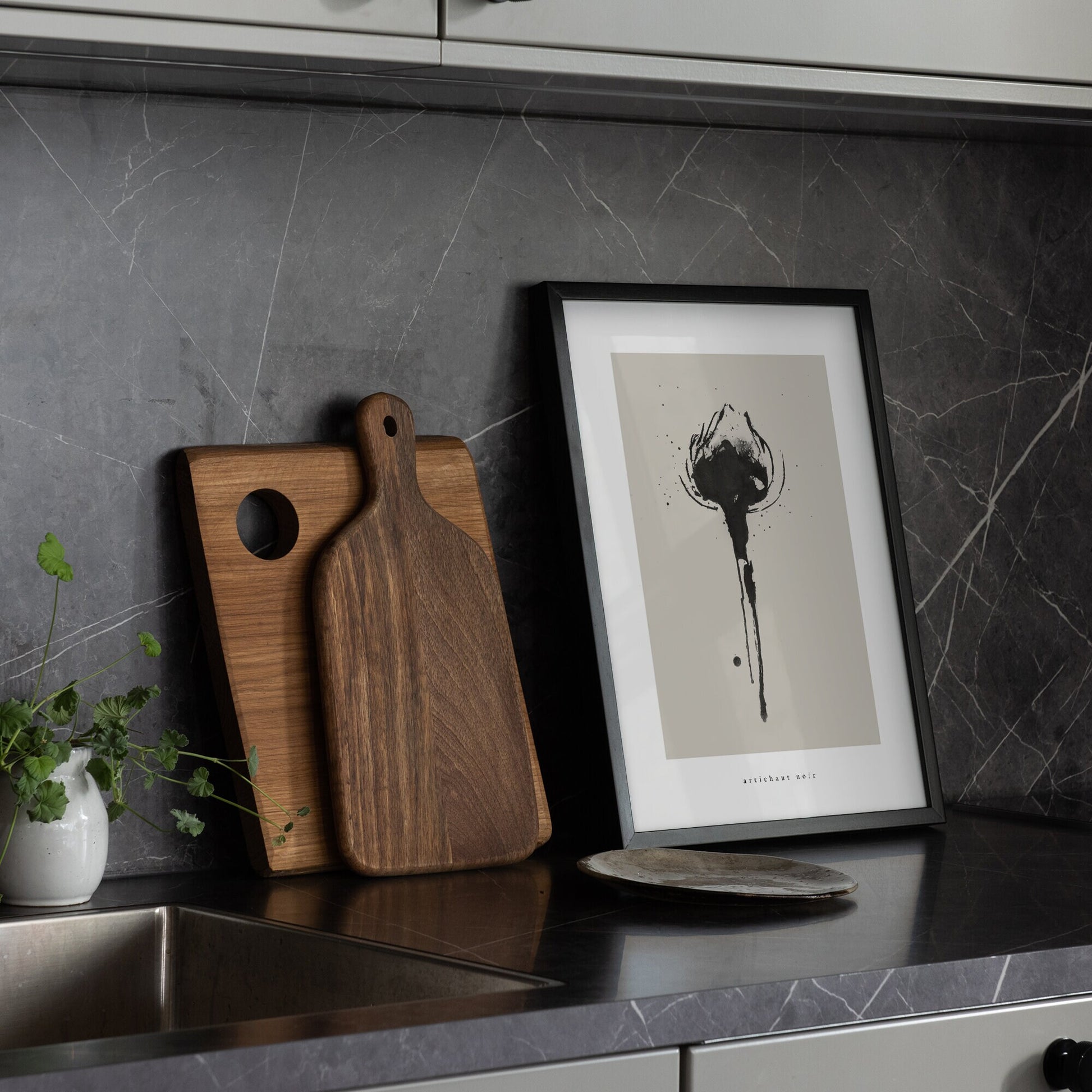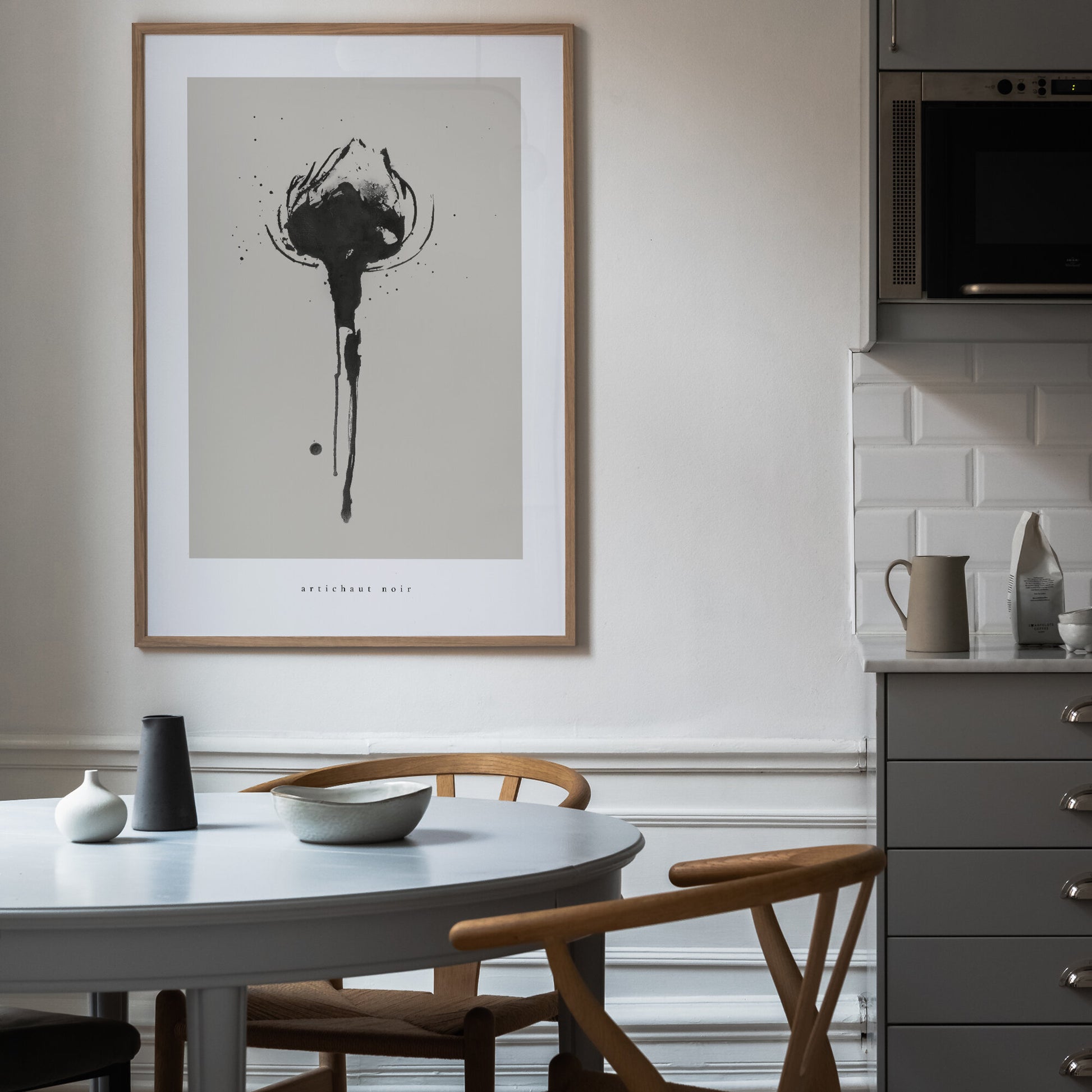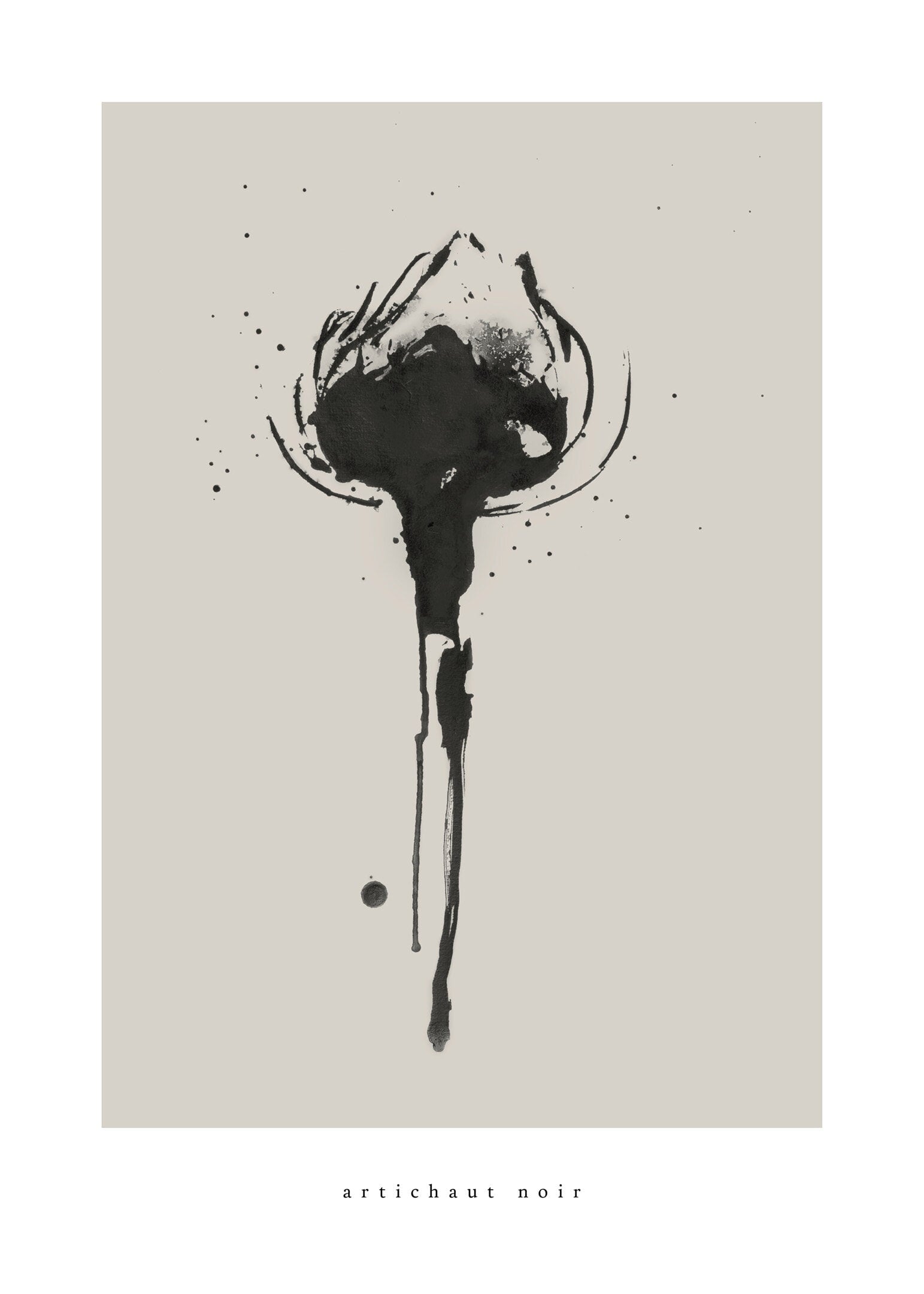 Ett stilrent och uttrycksfullt grafiskt motiv av en kronärtskocka, illustrerad med tusch. De distinkta detaljerna – från den långa stjälken till kronans vackra form – framhävs med hjälp av oregelbundna stänk som ger en levande och unik känsla. Denna poster är ett perfekt val för köket, där den bidrar med en elegant och samtidigt avslappnad atmosfär. En modern touch för det designmedvetna hemmet.