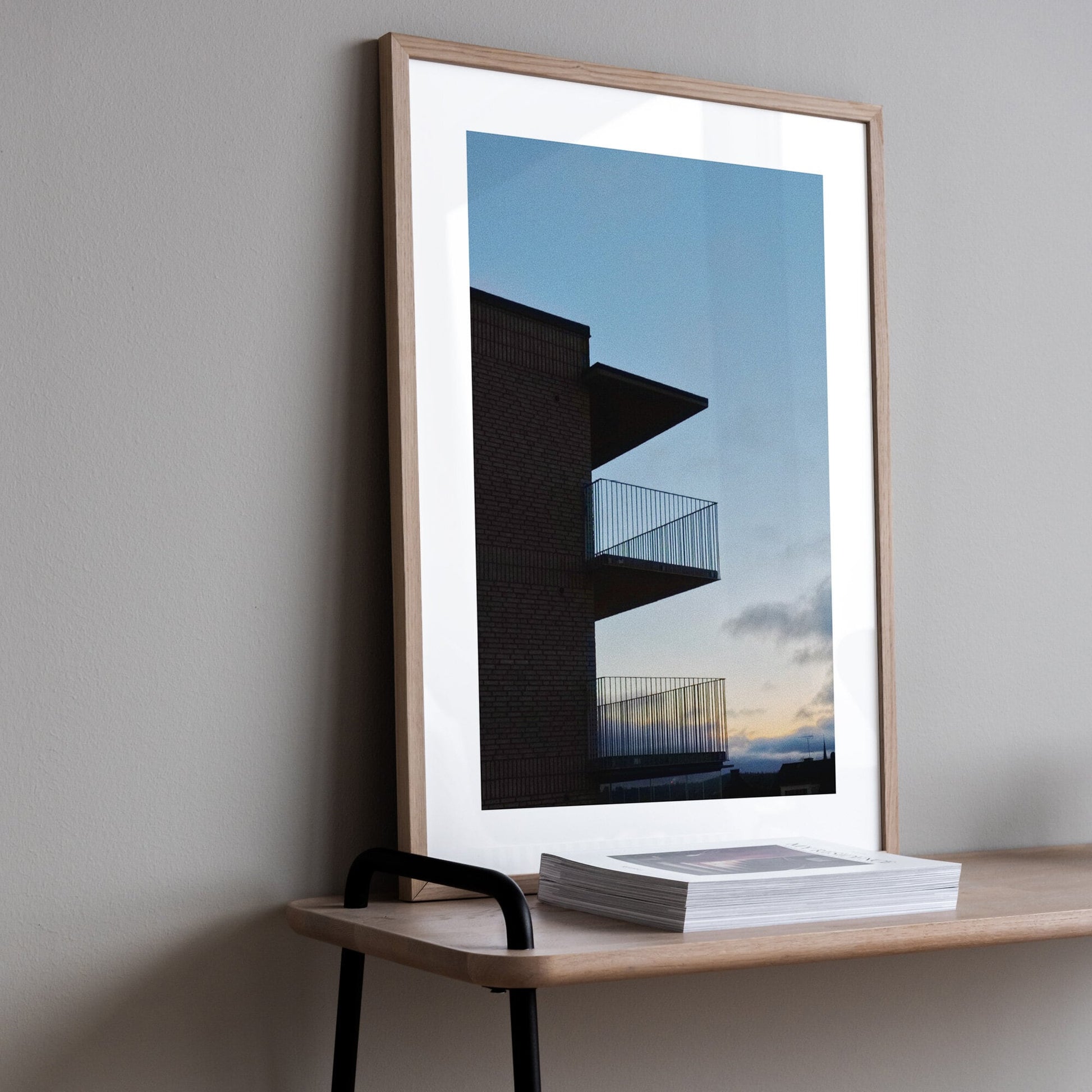 Kvällsvy poster fångar en modern siluett i skymningsljus. Ett stilrent fotografi som tillför en harmonisk och urban känsla till din inredning.