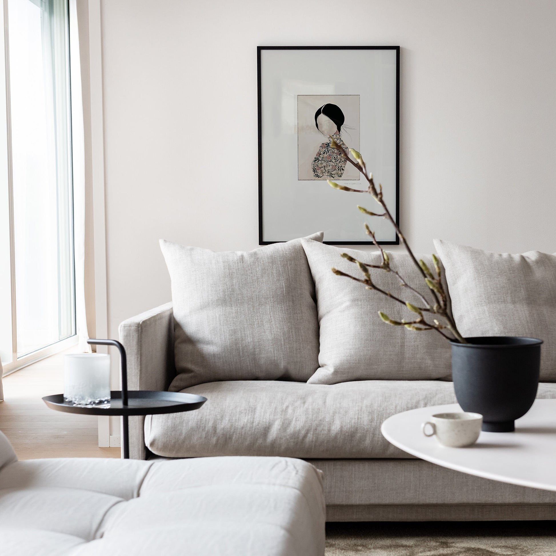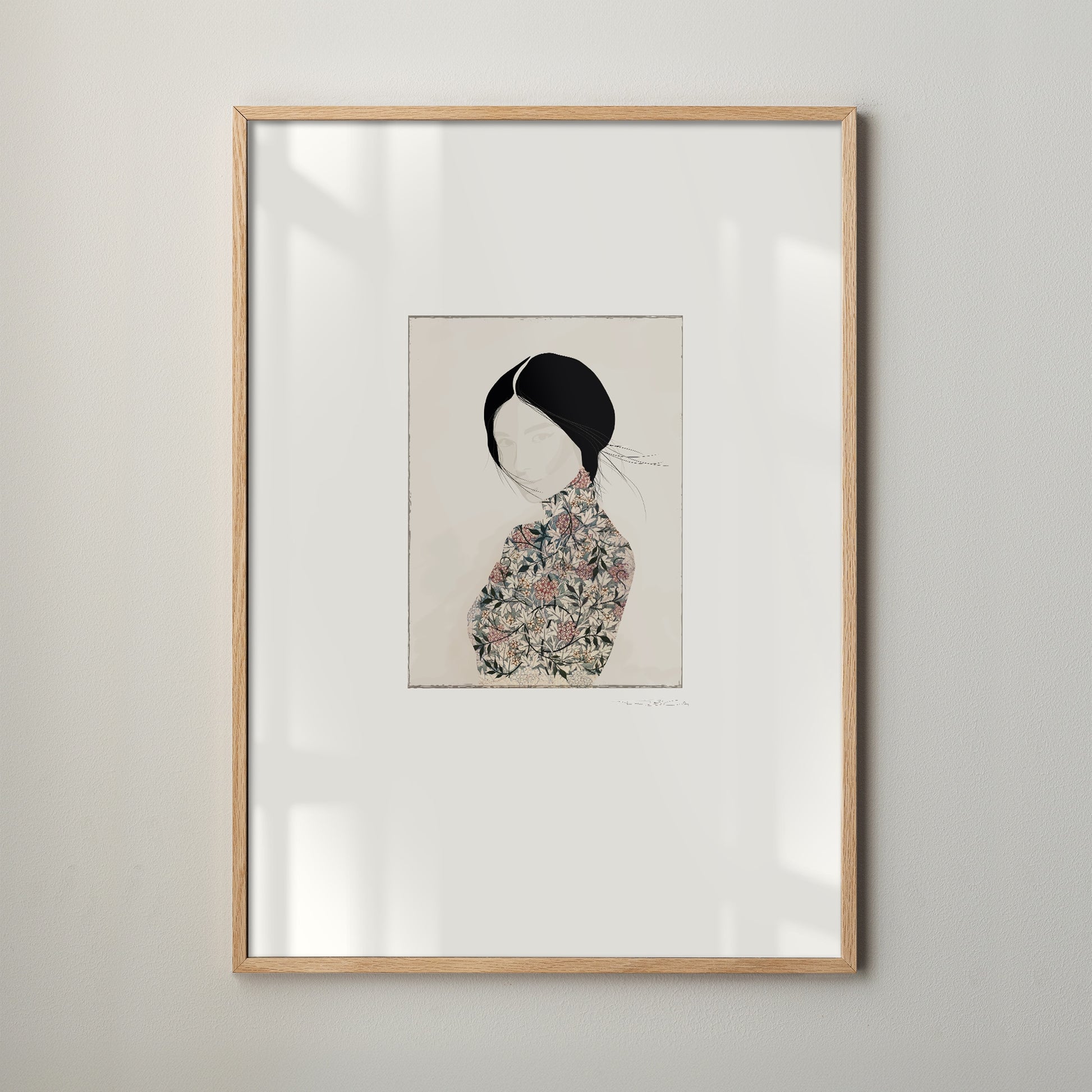 Grafisk poster som porträtterar en kvinna i ett mönstrat plagg, mot beige bakgrund. Motivets uttryck är levande men tidlöst, och passar perfekt in i en minimalistisk interiör.