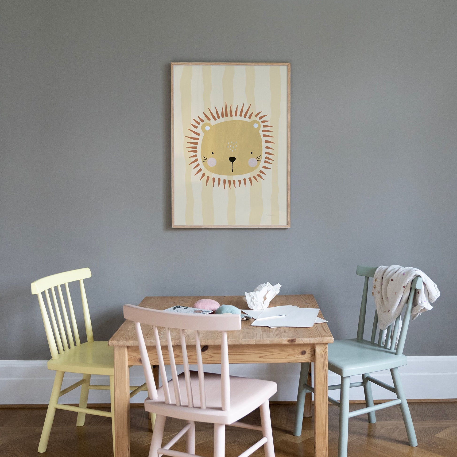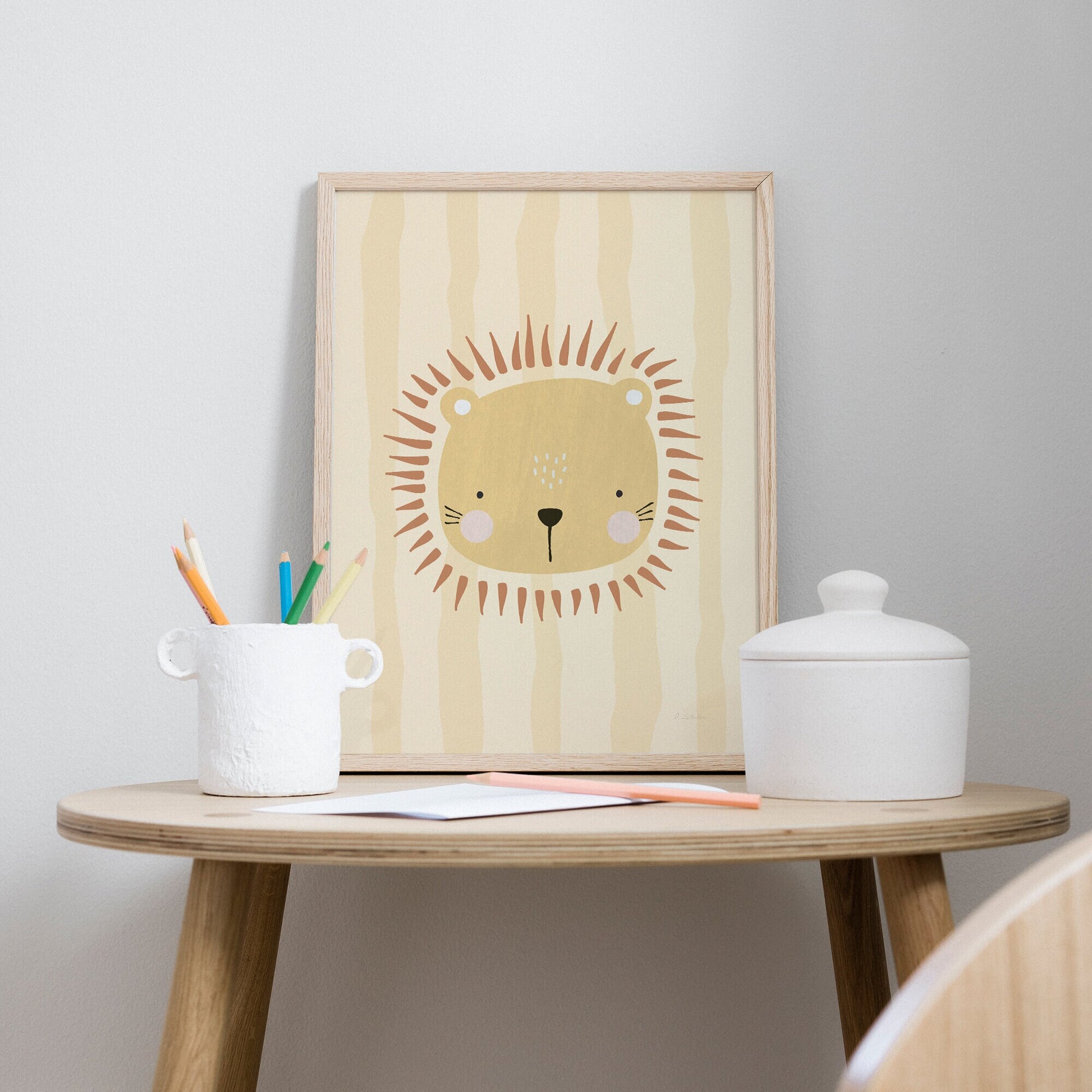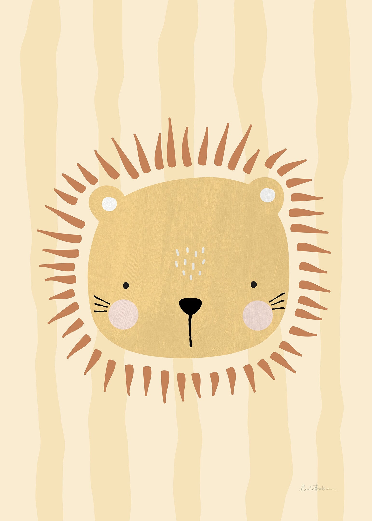 Barnposter med motiv av ett gulligt lejon, mot randig bakgrund. Färgerna går i mjukt gula, beige och röda toner, och det lekfulla uttrycket passar perfekt i sovrum för små hjärtan