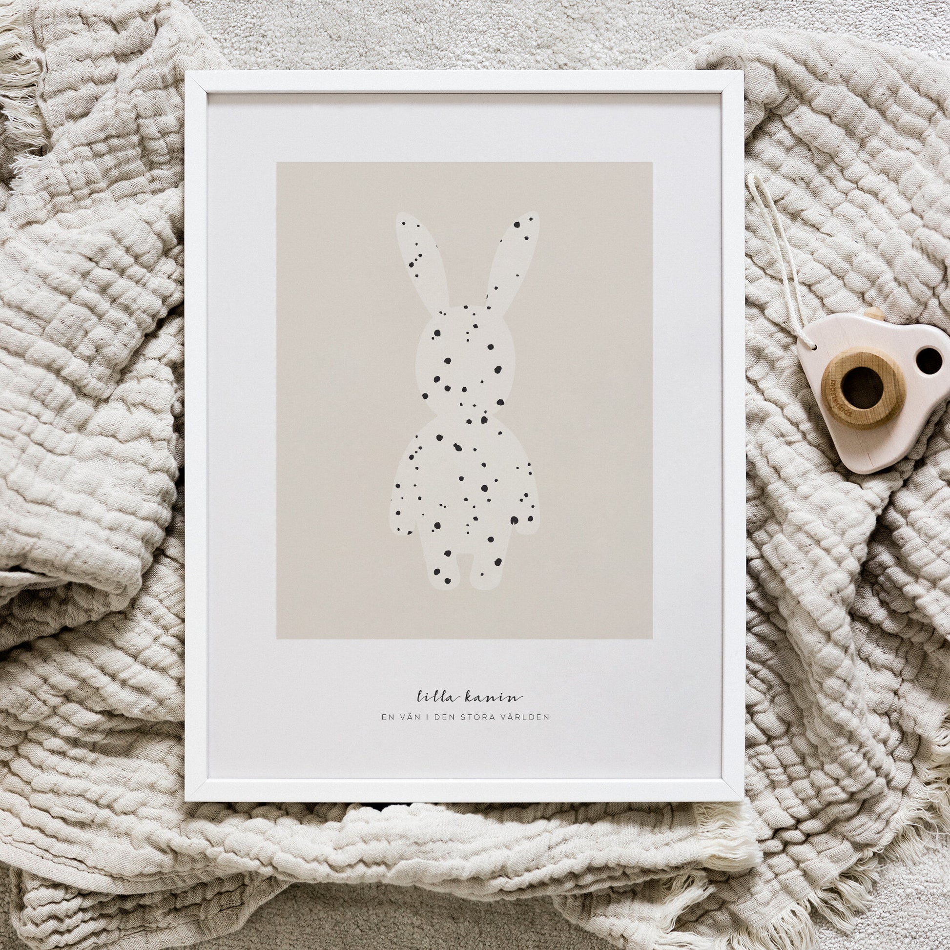 Lilla kanin beige poster – en mjuk och charmig illustration av en liten kanin med lekfulla prickar mot en varm beige bakgrund. Det stilrena motivet ger en lugn och trygg känsla i barnrummet. Perfekt som en söt detalj för de minsta eller som en uppskattad present vid dop, födelsedag eller baby shower.