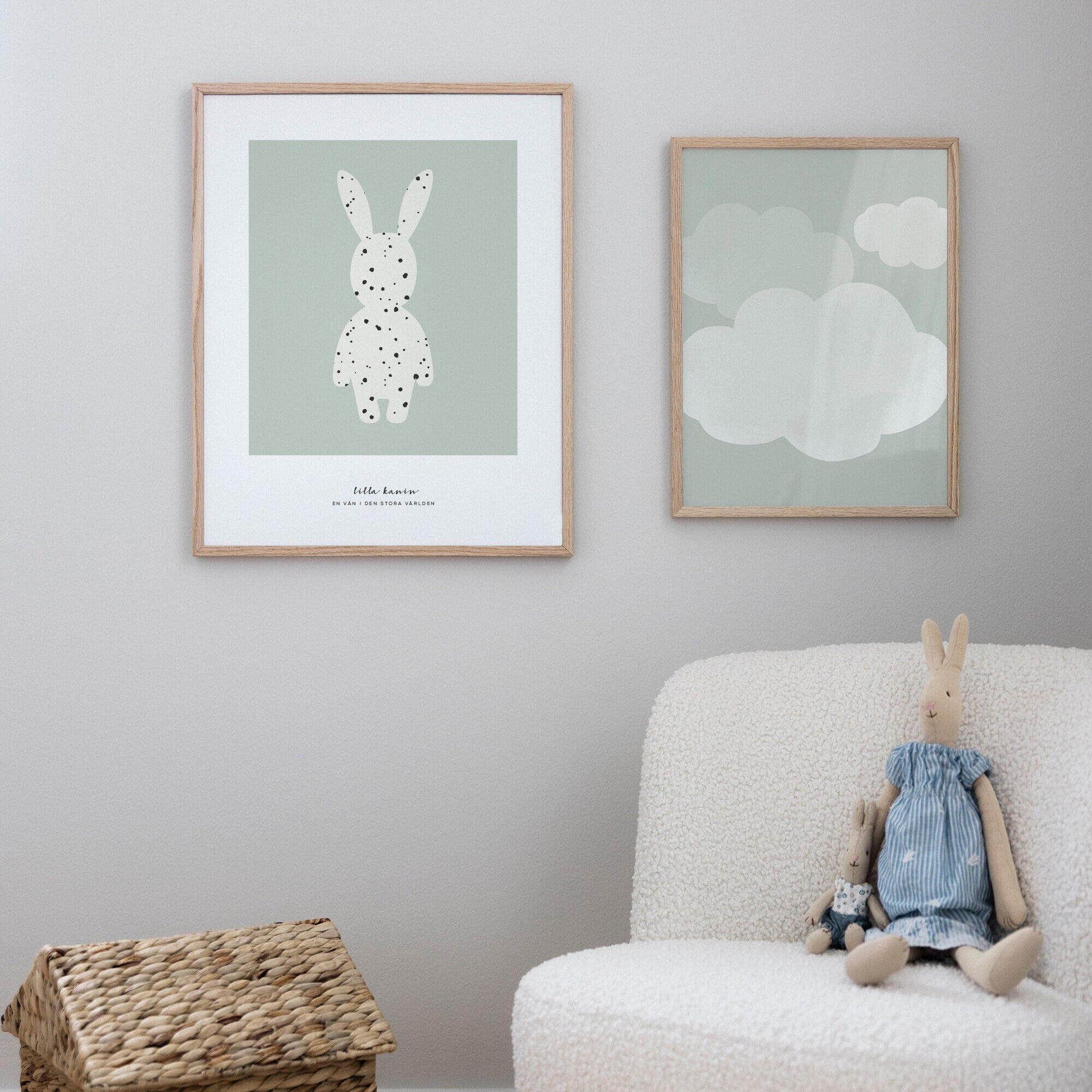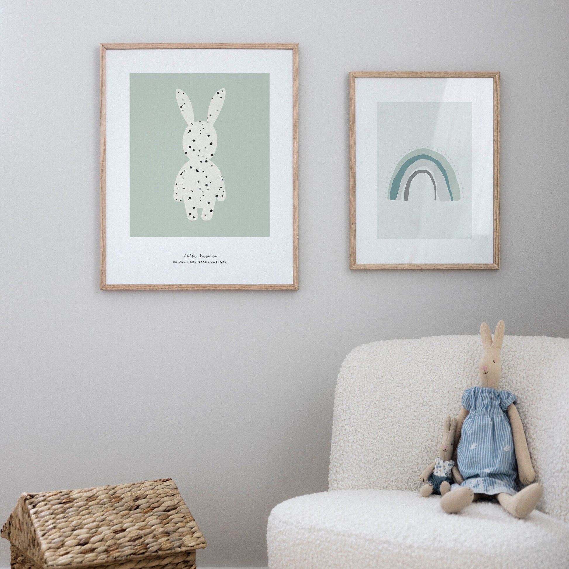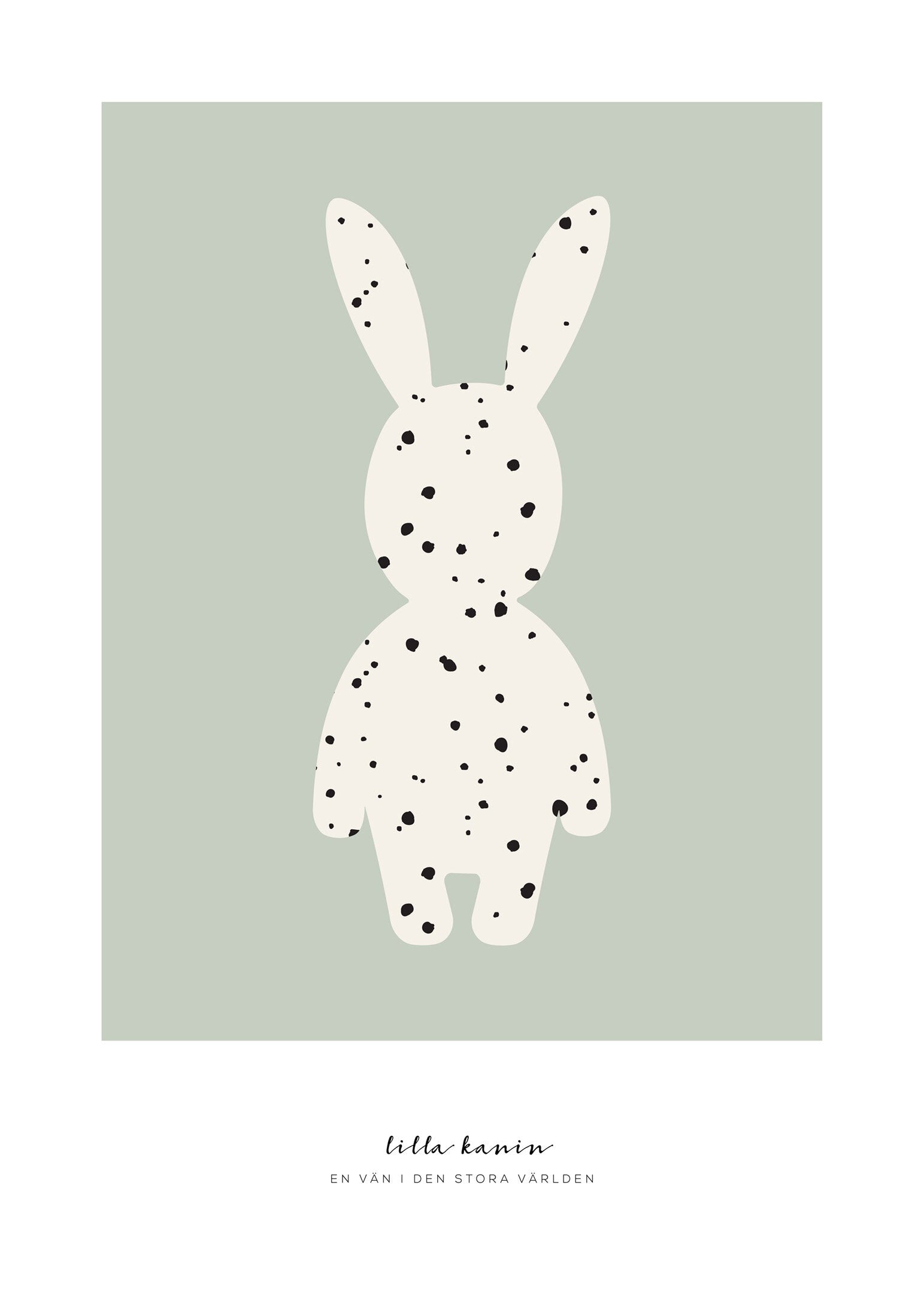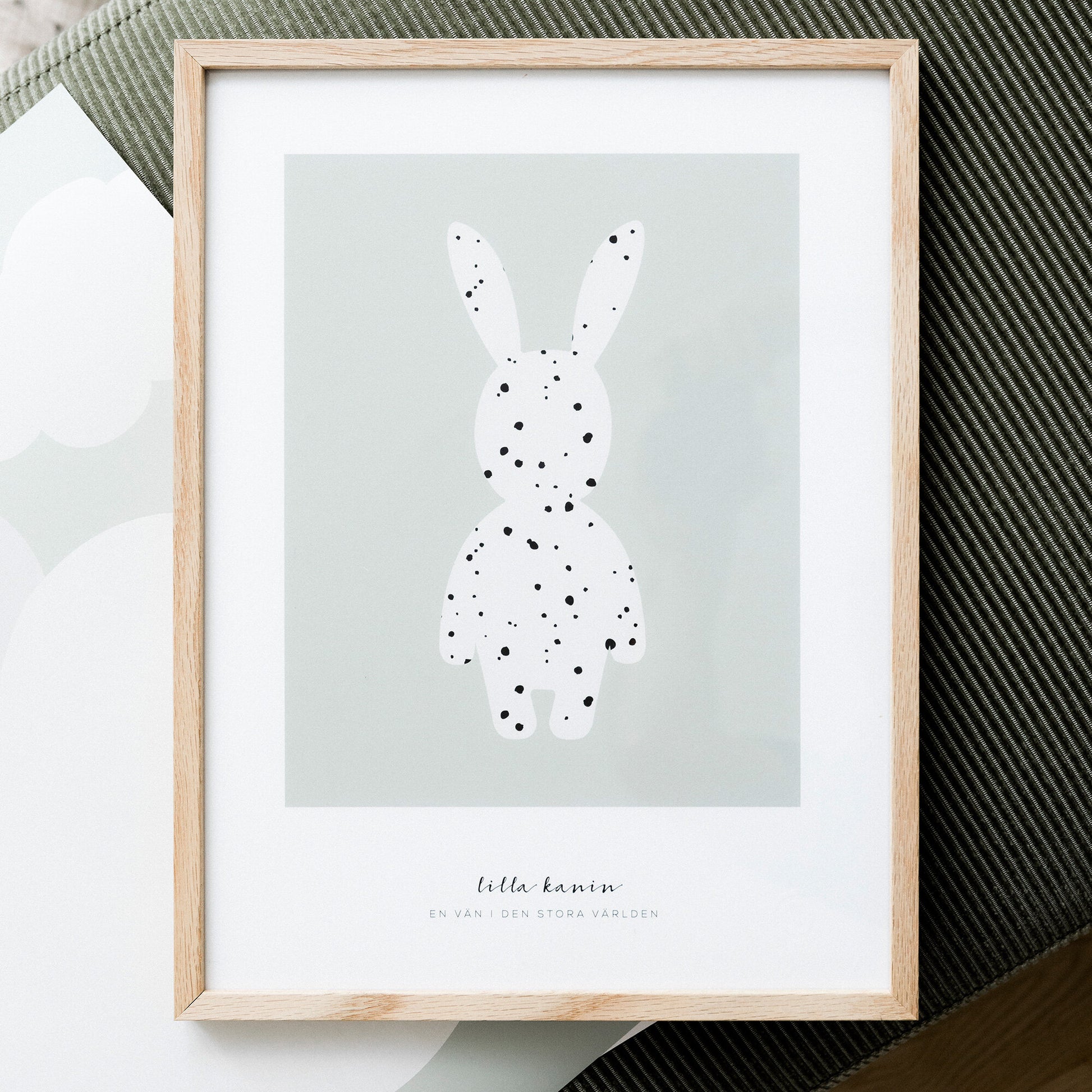 Lilla kanin är en vän i den stora världen. Mjuka färger kompletteras med busiga prickar, perfekt för det mysiga barnrummet. Dessutom är det en fin idé till doppresent, födelsedagspresent – eller gåva till den som väntar bebis.