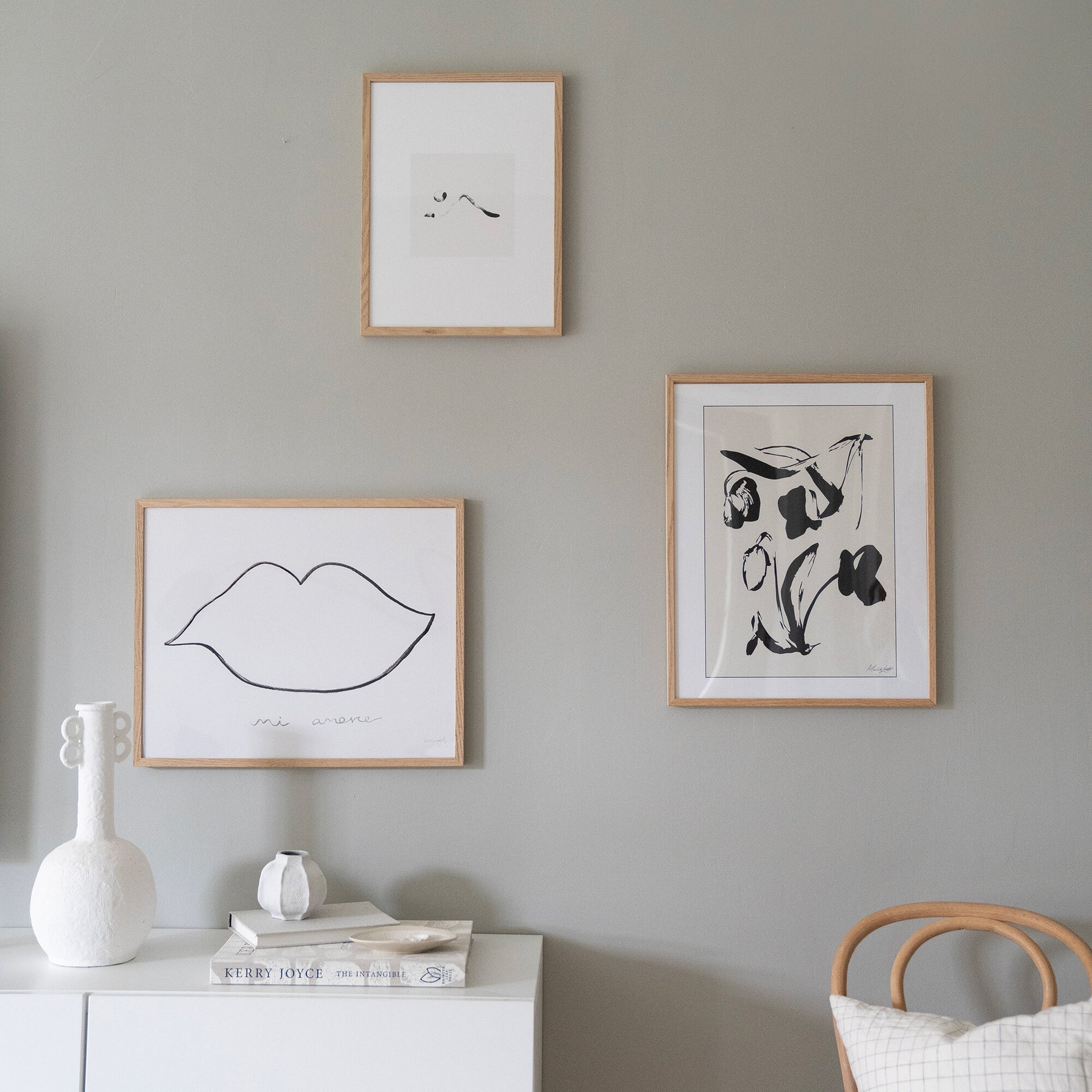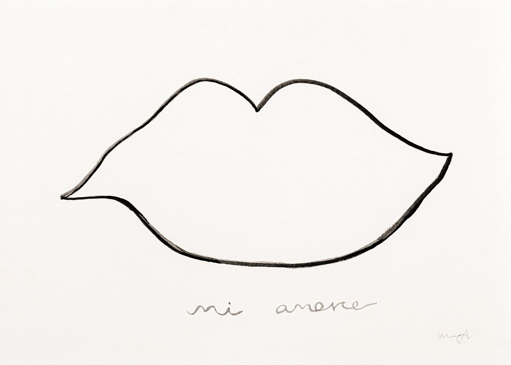 Grafisk poster som illustrerar en mun och texten ”mi amore”. Minimalistisk men ändå uttrycksfull, tack vare dess lekfulla linjer och budskap.