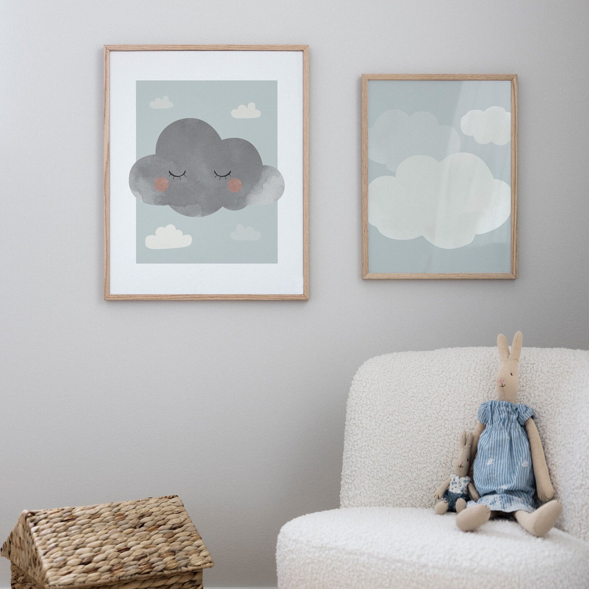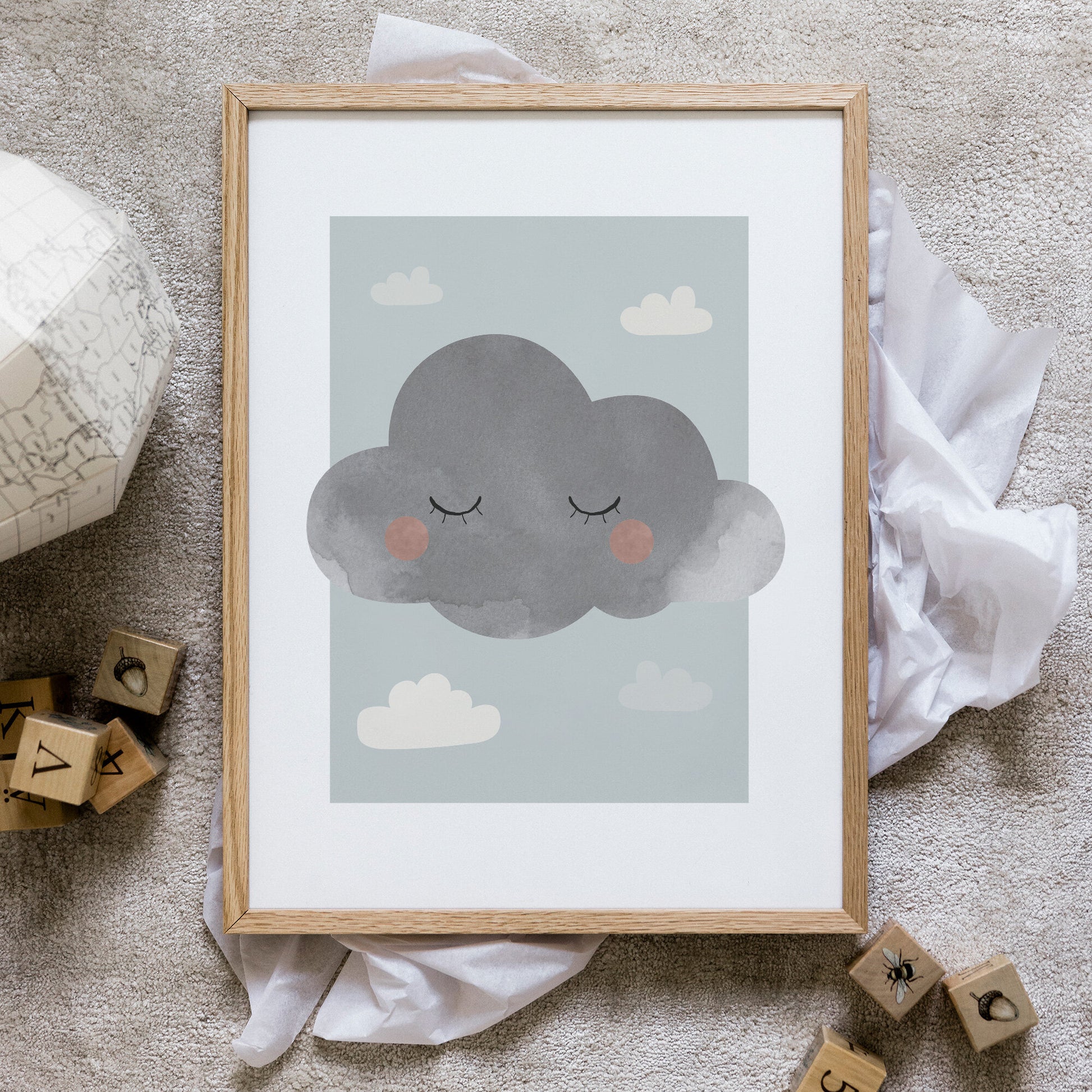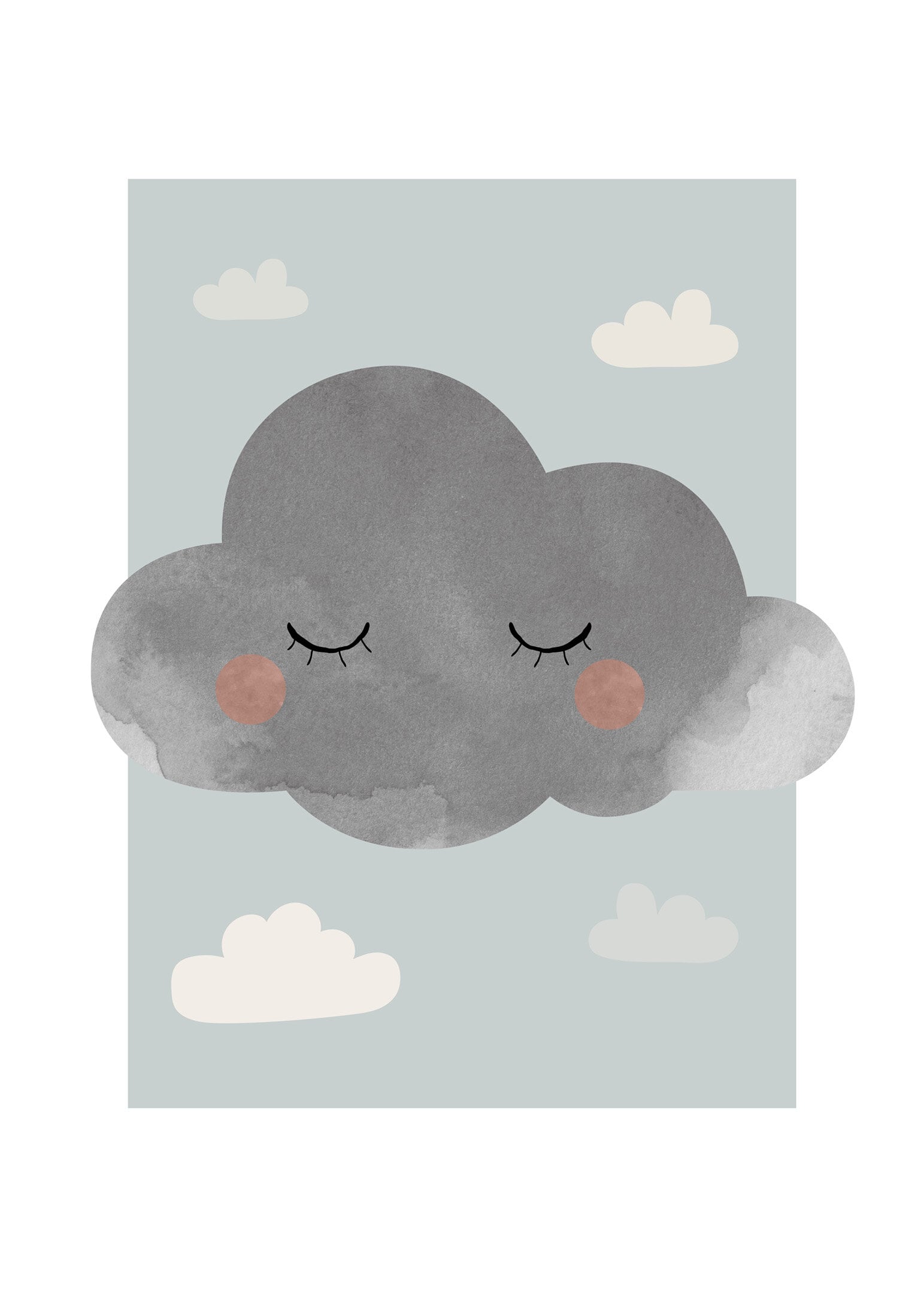 En rogivande poster med ett vilande moln på en dämpad blå bakgrund. De mjuka färgtonerna och det sömniga uttrycket gör motivet perfekt för att skapa en harmonisk känsla i barnrummet. Enkel att matcha med andra posters och en fin detalj för en ombonad och trygg miljö.