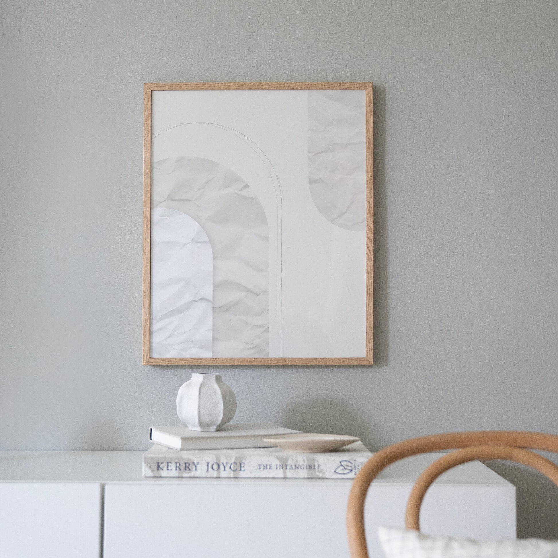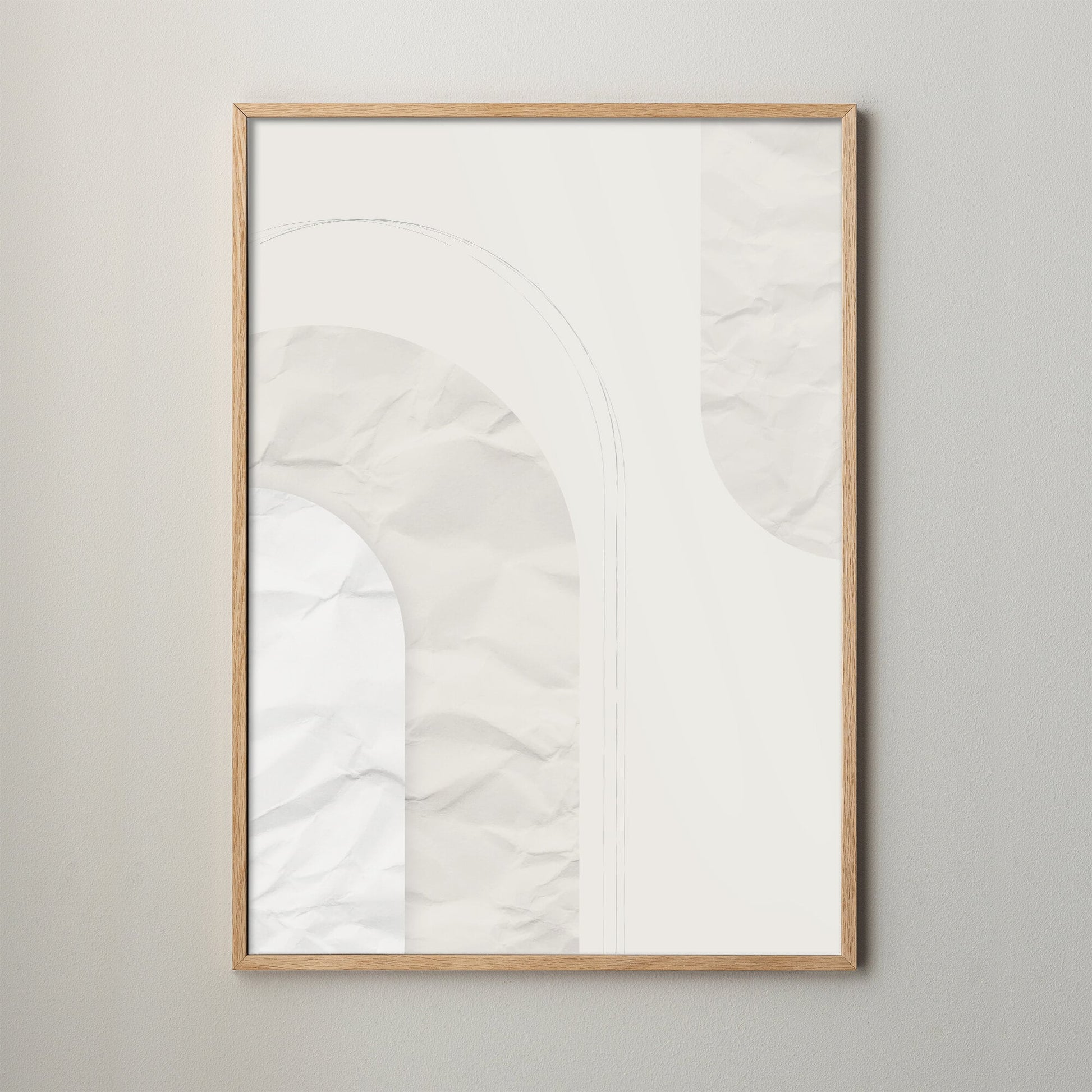 Grafisk poster som illustrerar ovala former i beige, vitt och grå toner, med struktur av både papper och blyerts.
