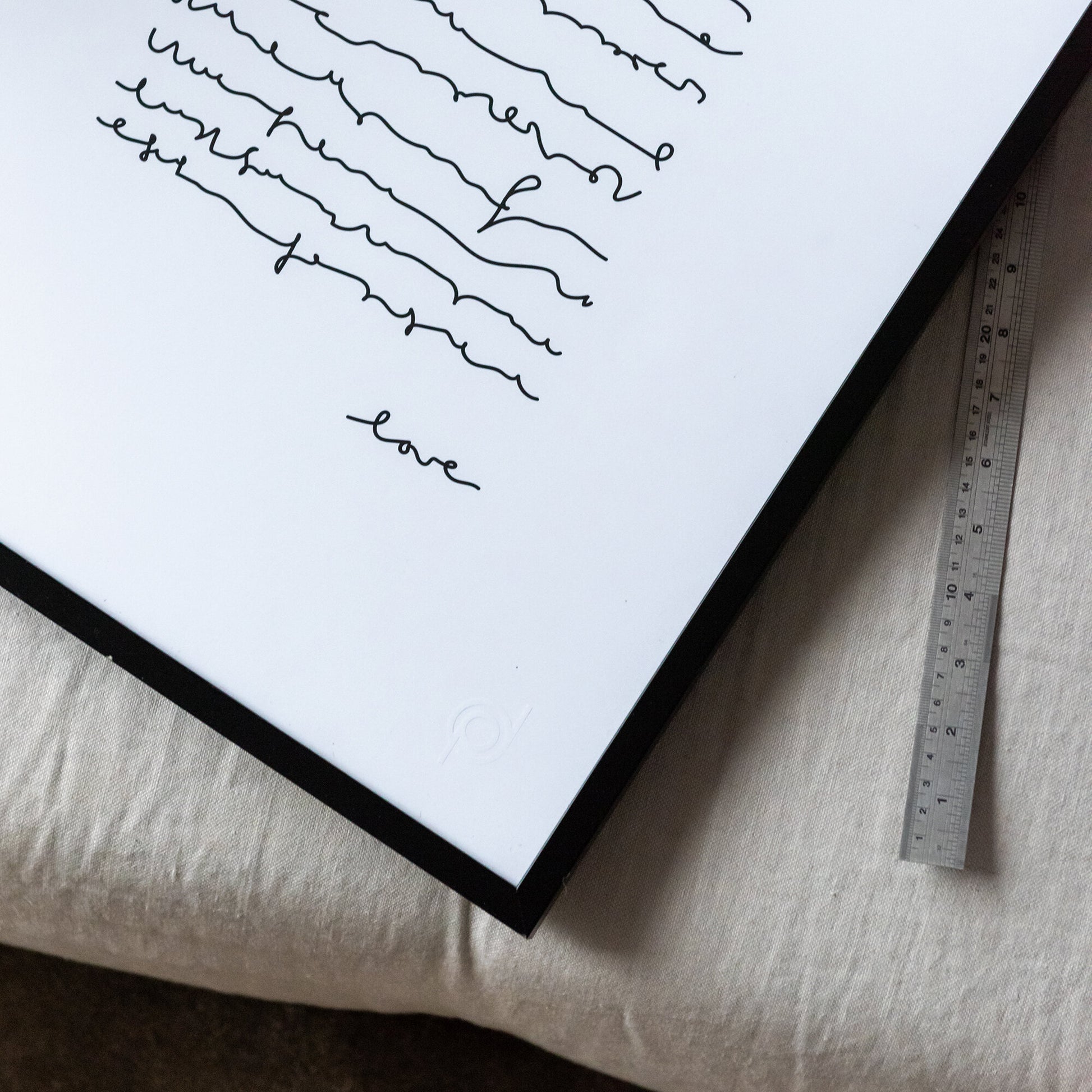 Minimalistisk poster med handskrivna linjer som föreställer ett abstrakt brev, avslutat med ordet "love". Denna konstnärliga design ger en känsla av subtilitet och reflektion, perfekt för ett stilrent och modernt hem. En tidlös tavla som förmedlar kärlek och lugn, idealisk som enskild dekoration eller i kombination med andra posters