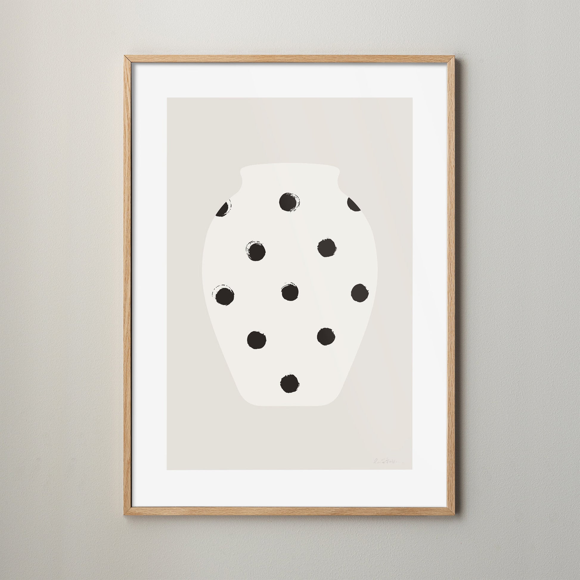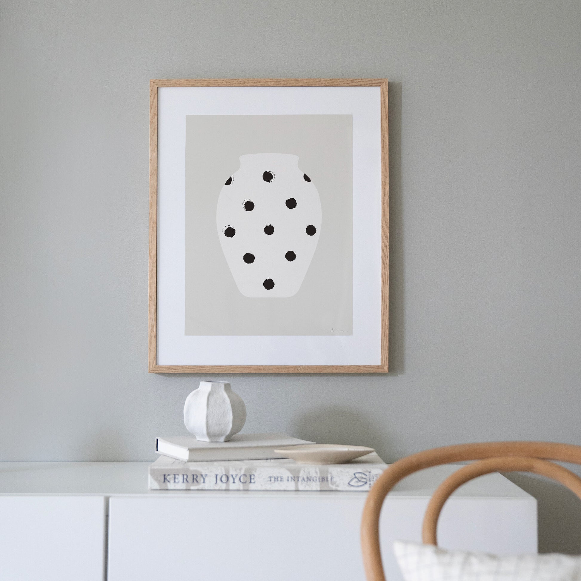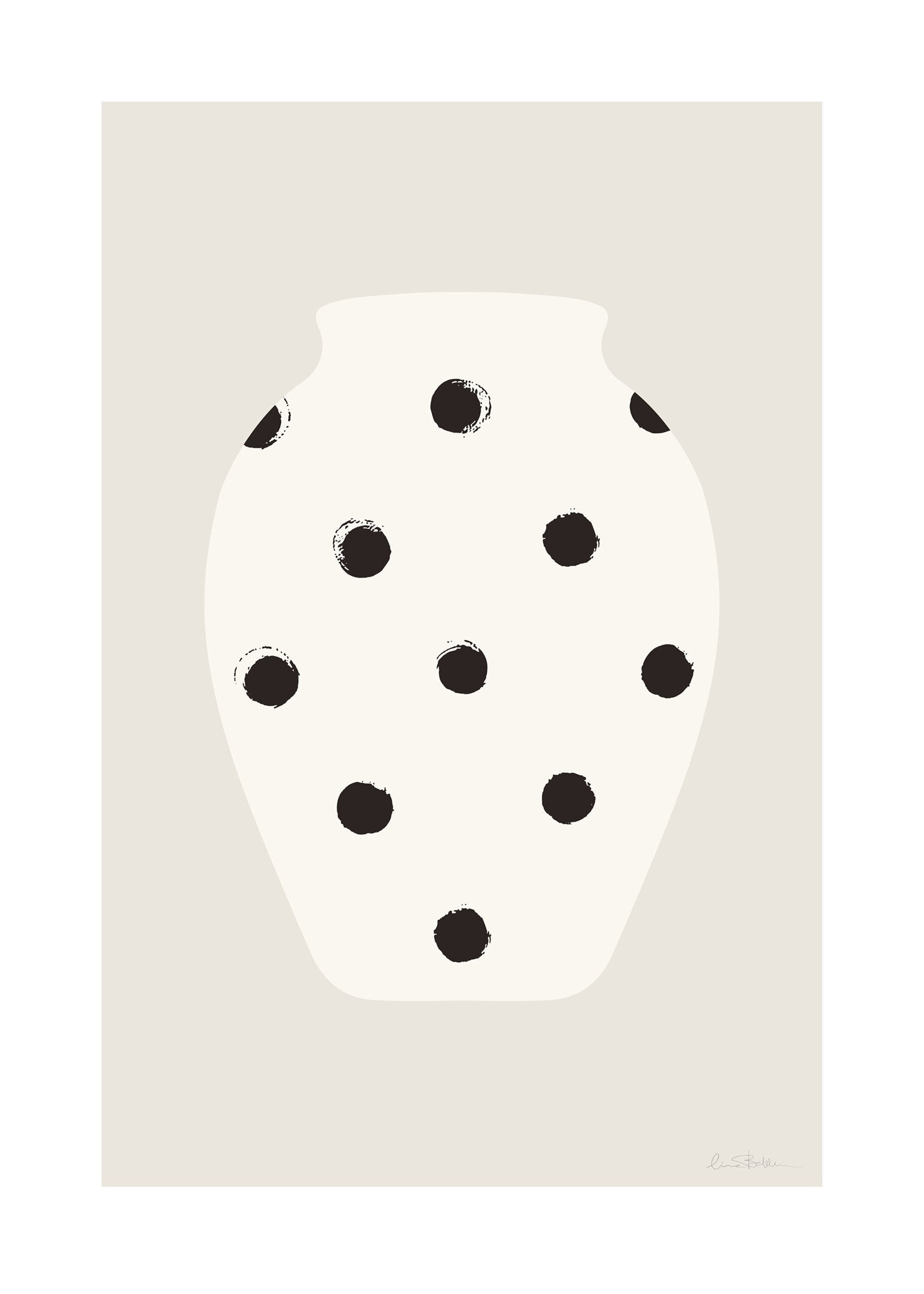 En grafisk poster med en stiliserad vas dekorerad med organiska prickar, skapad i en mjuk och harmonisk färgskala. Motivet har en tidlös och modern känsla som passar lika bra i en skandinavisk inredning som i ett mer lekfullt och eklektiskt hem. Den ljusa bakgrunden ger ett mjukt uttryck och låter de handmålade detaljerna i prickarna komma till sin rätt. Perfekt att kombinera med andra grafiska motiv eller låta stå för sig själv som ett stilrent inslag i hemmet.