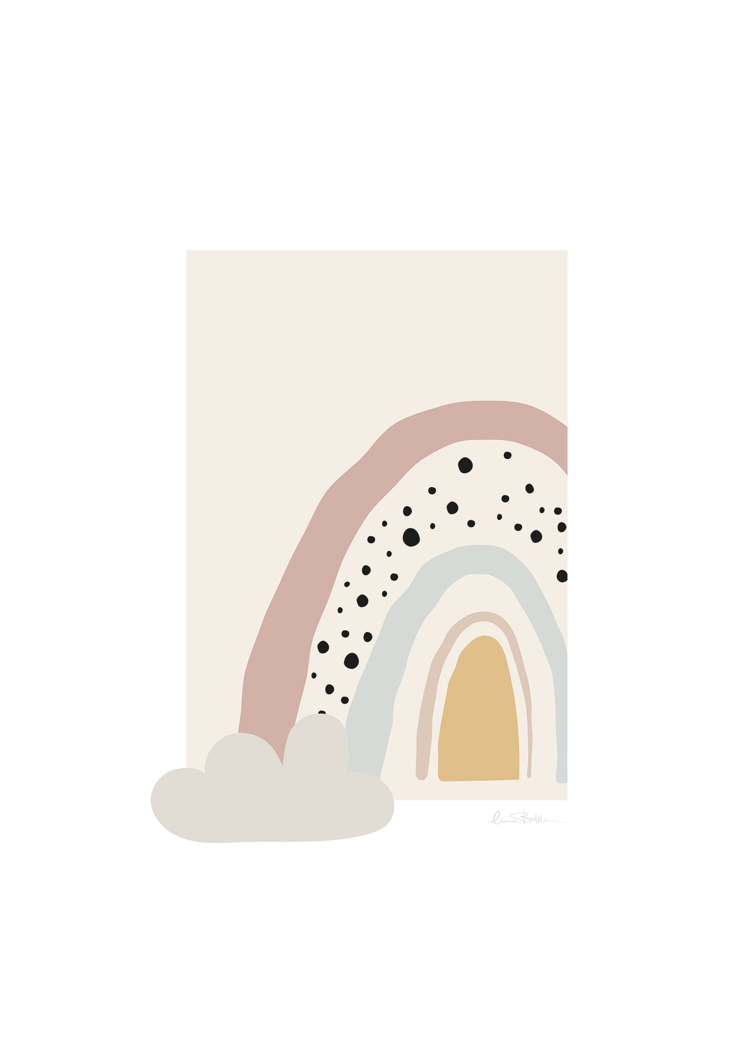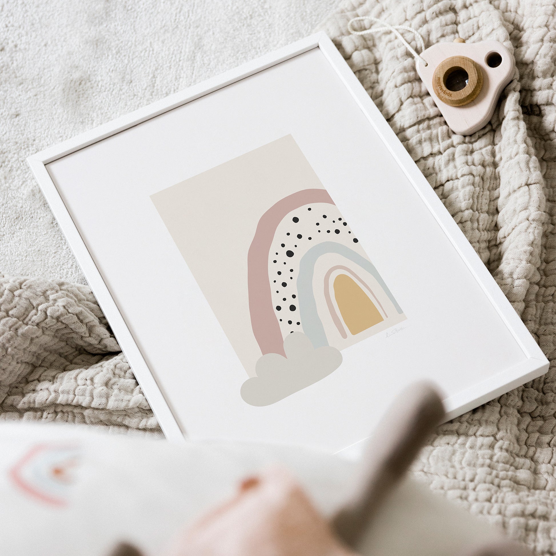 En stilren barnposter med regnbåge i mjuka pastellfärger. Motivet är både lekfullt och harmoniskt – perfekt för att skapa ett lugnt och ombonat barnrum för de allra minsta. Färgskalan matchar våra övriga barnmotiv och gör det enkelt att kombinera till en enhetlig tavelvägg. En perfekt barnposter för dig som söker regnbågsmotiv i en mer stilren form.