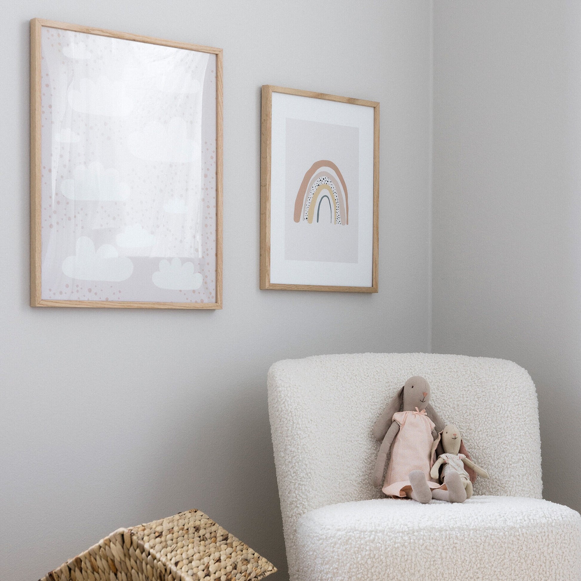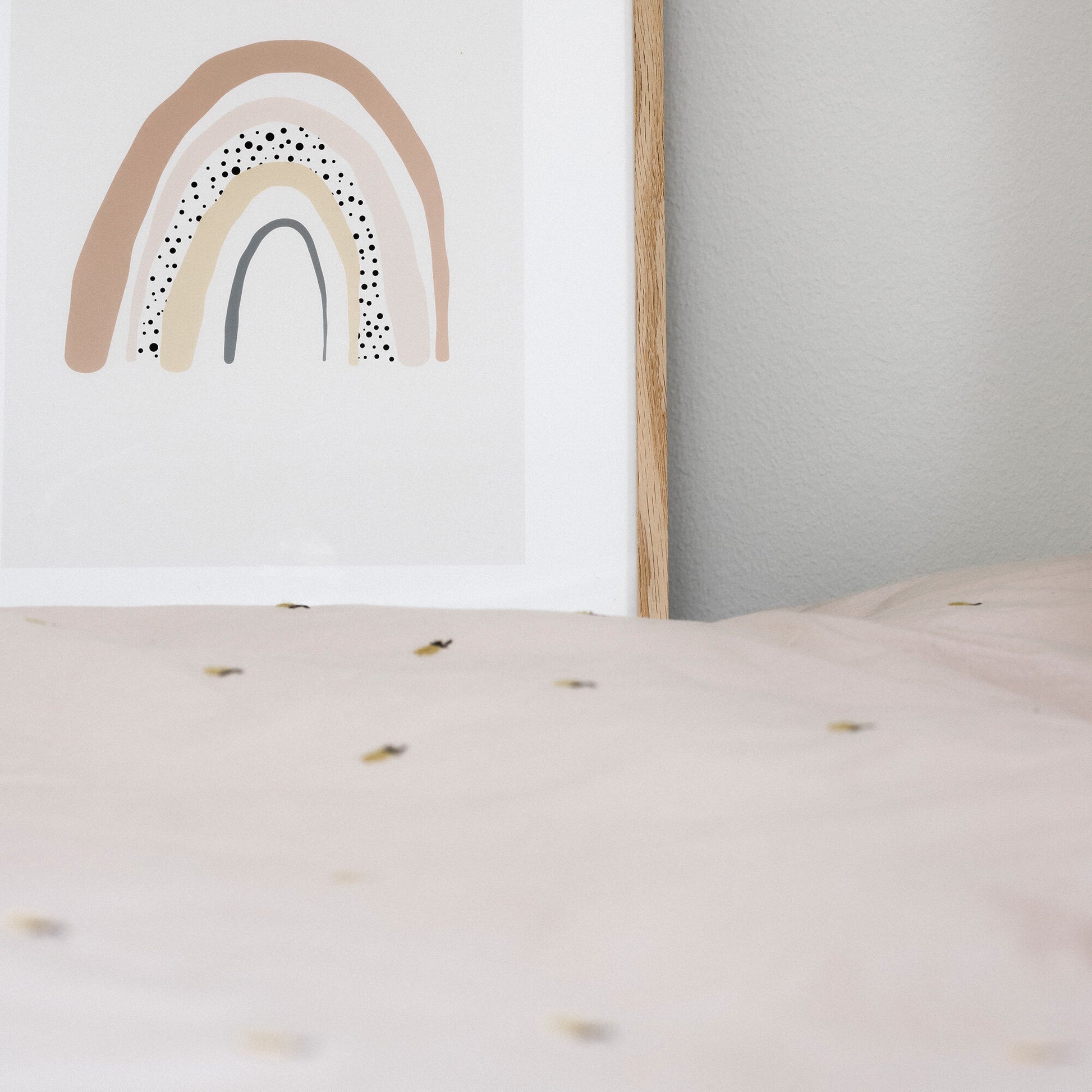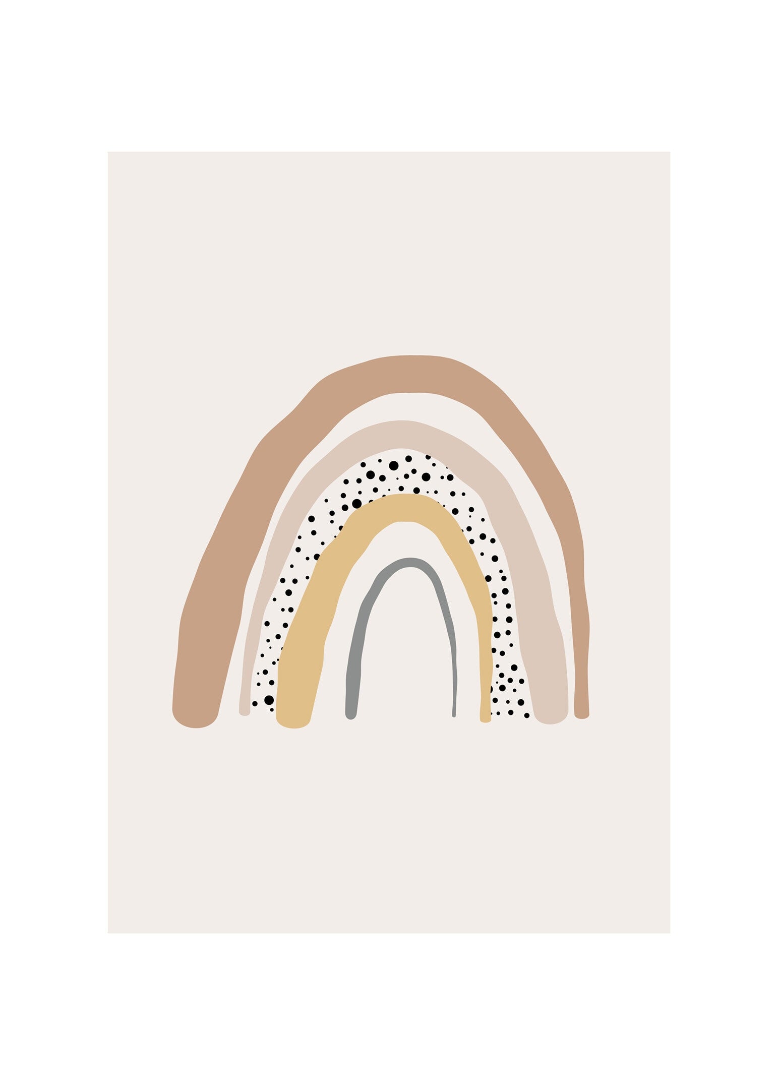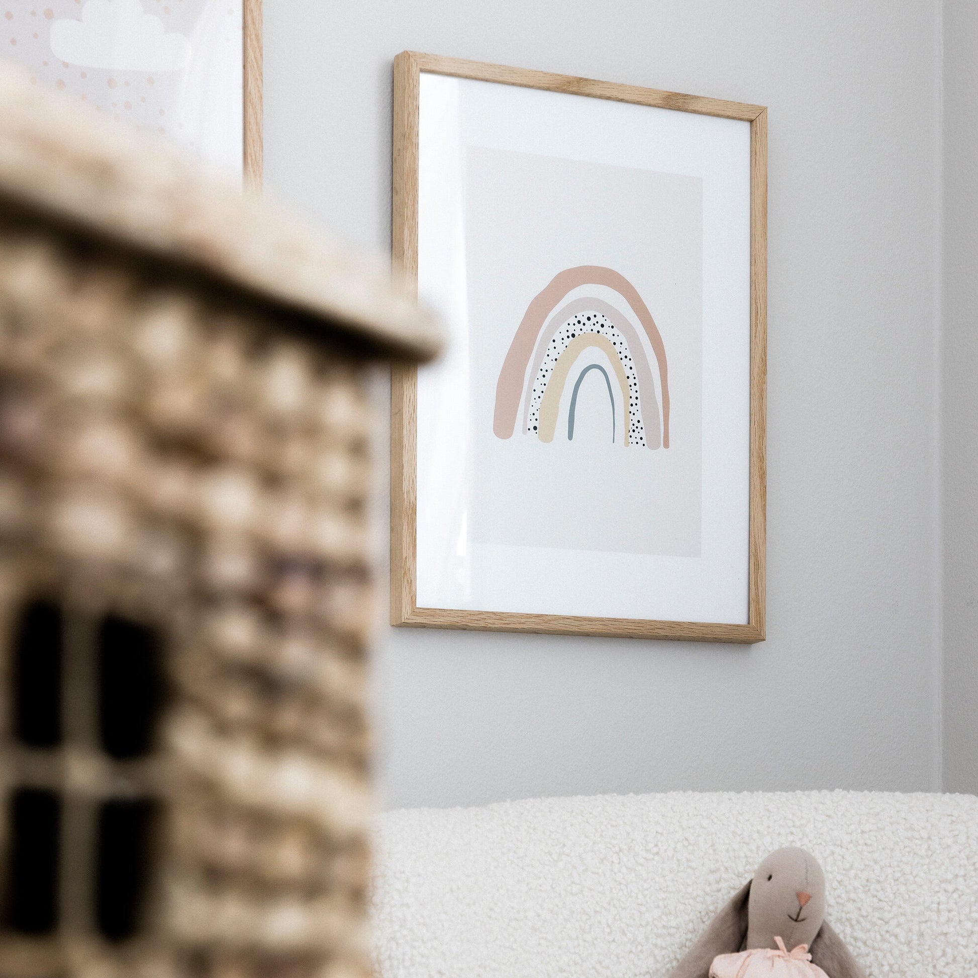 En stilren och lekfull poster med en grafisk regnbåge i mjuka, naturnära nyanser. De fina färgtonerna och prickiga detaljerna ger motivet ett lugnt och harmoniskt uttryck, perfekt för att skapa en mysig atmosfär i barnrummet. En uppskattad inredningsdetalj som även passar utmärkt som doppresent, födelsedagsgåva eller som en fin överraskning till den som väntar barn. Med sin tidlösa design blir denna regnbågsposter en älskad del av hemmets dekoration.