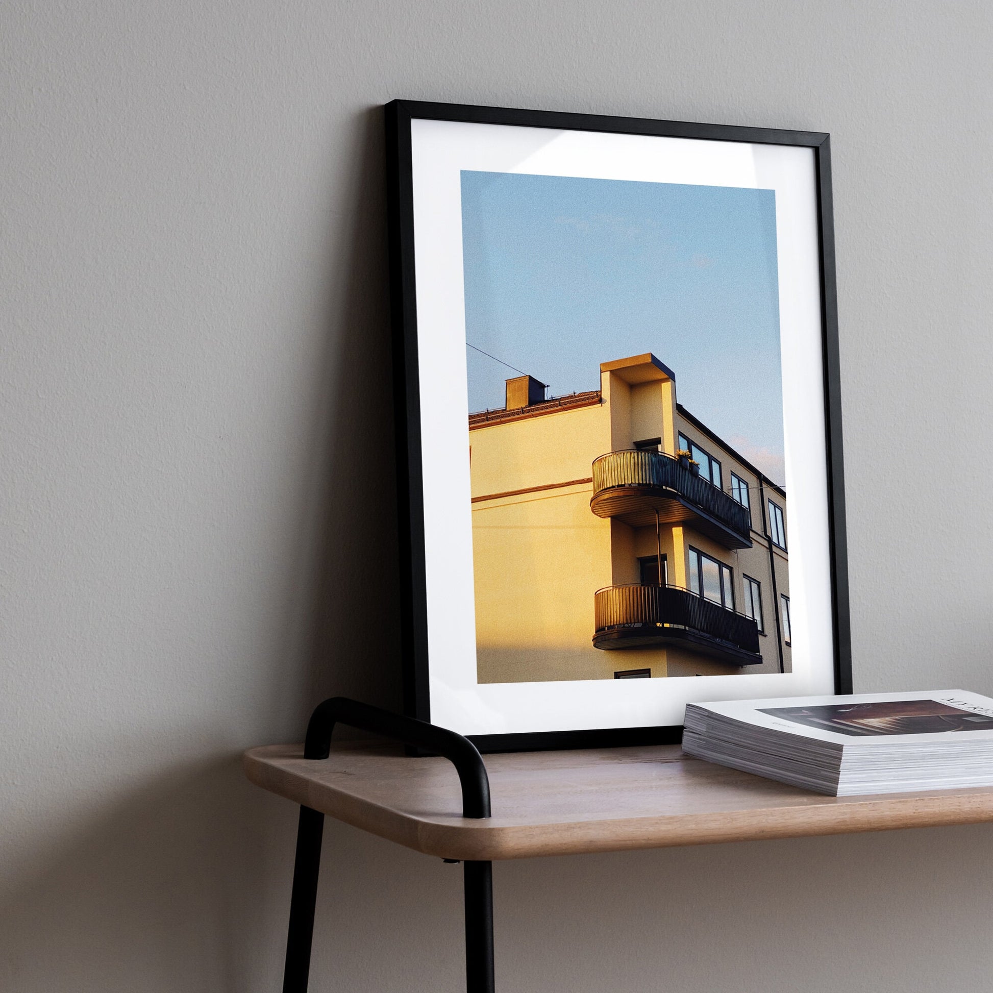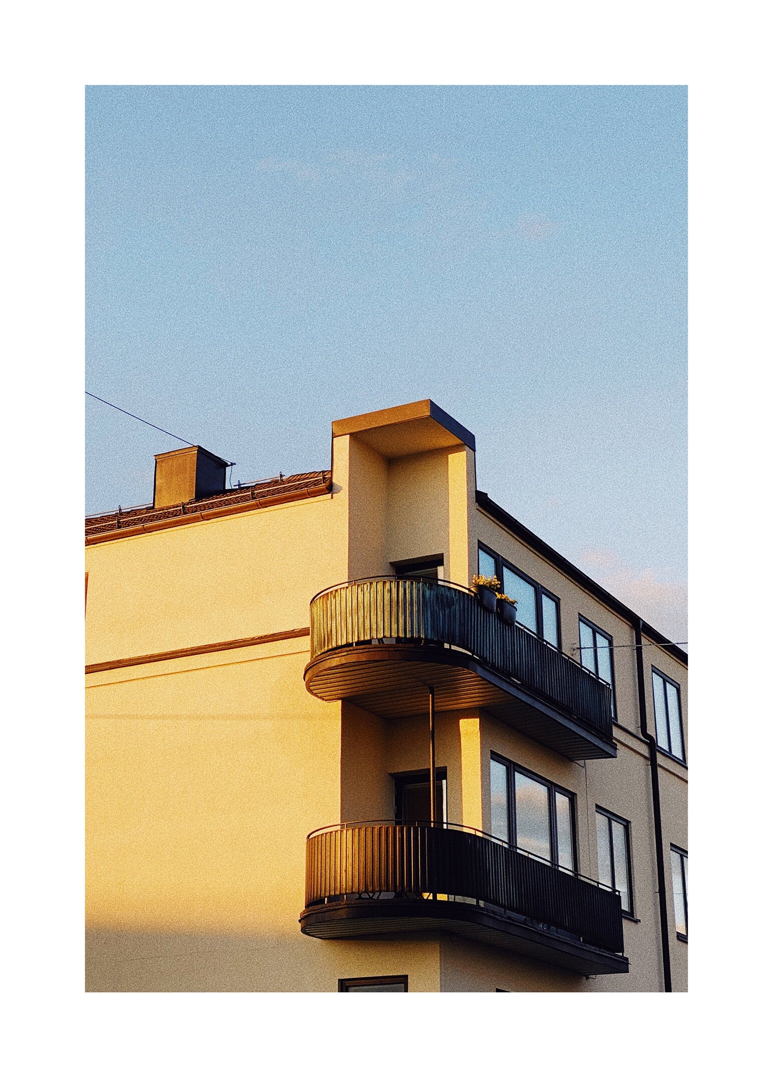 Retro balkong poster är en fotografisk hyllning till charmiga byggnadsdetaljer i vintagestil. Fångad i gyllene kvällsljus skapar detta motiv en känsla av nostalgi och värme. Perfekt för den som uppskattar klassiska designinslag i inredningen. Låt denna poster pryda dina väggar och ge rummet en tidlös och retroinspirerad atmosfär.