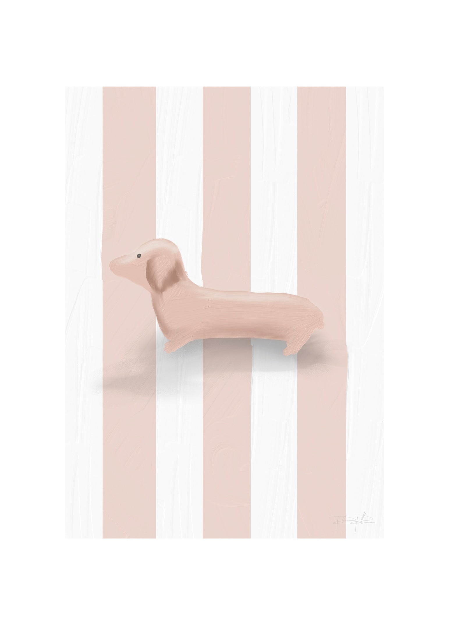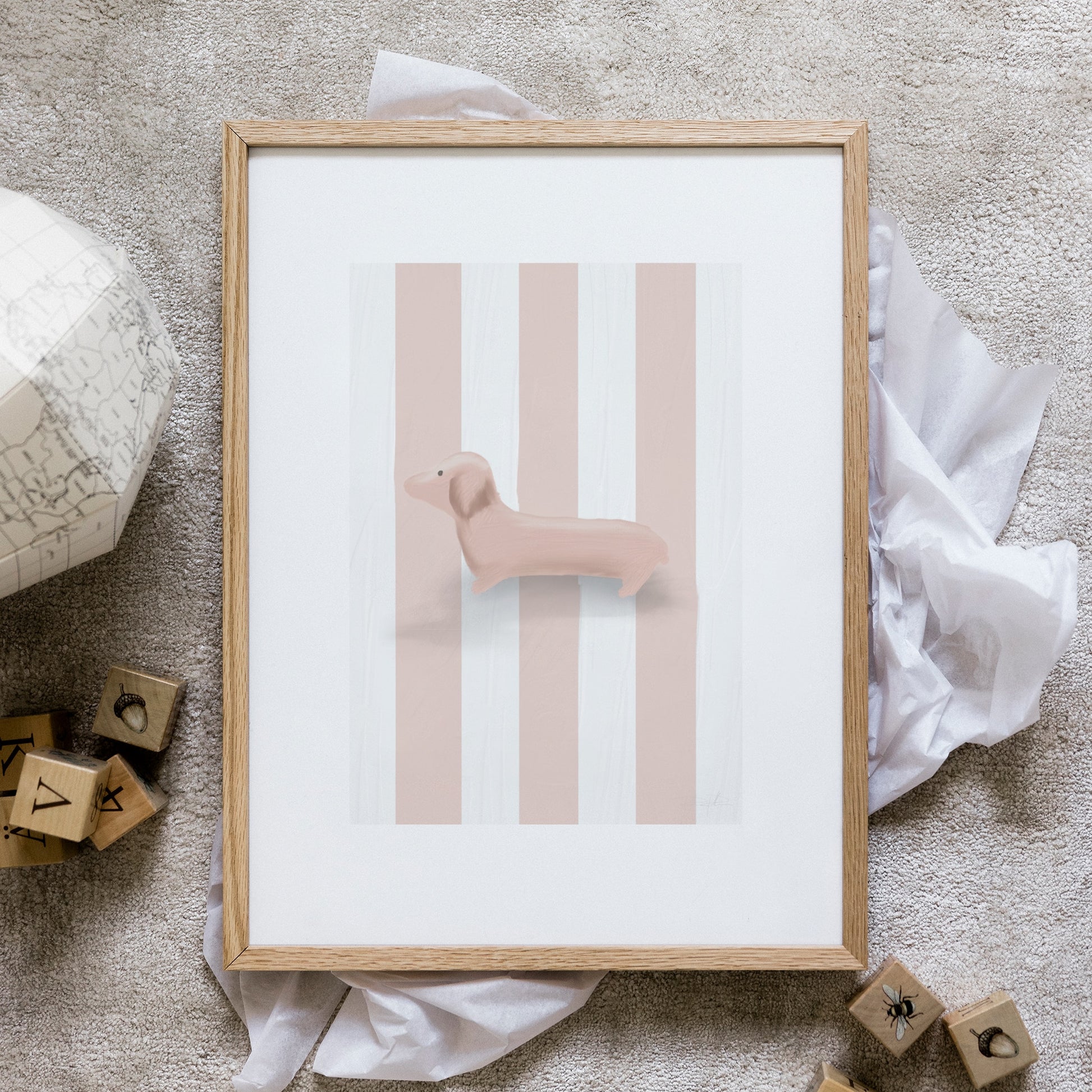 Ge ditt barns rum en söt och färgglad kompis med vår Rosa tax poster. Denna charmiga illustration visar en bedårande rosa tax mot en bakgrund av mjuka pastellfärgade ränder. Perfekt för att skapa en mysig och lekfull atmosfär i barnrummet.