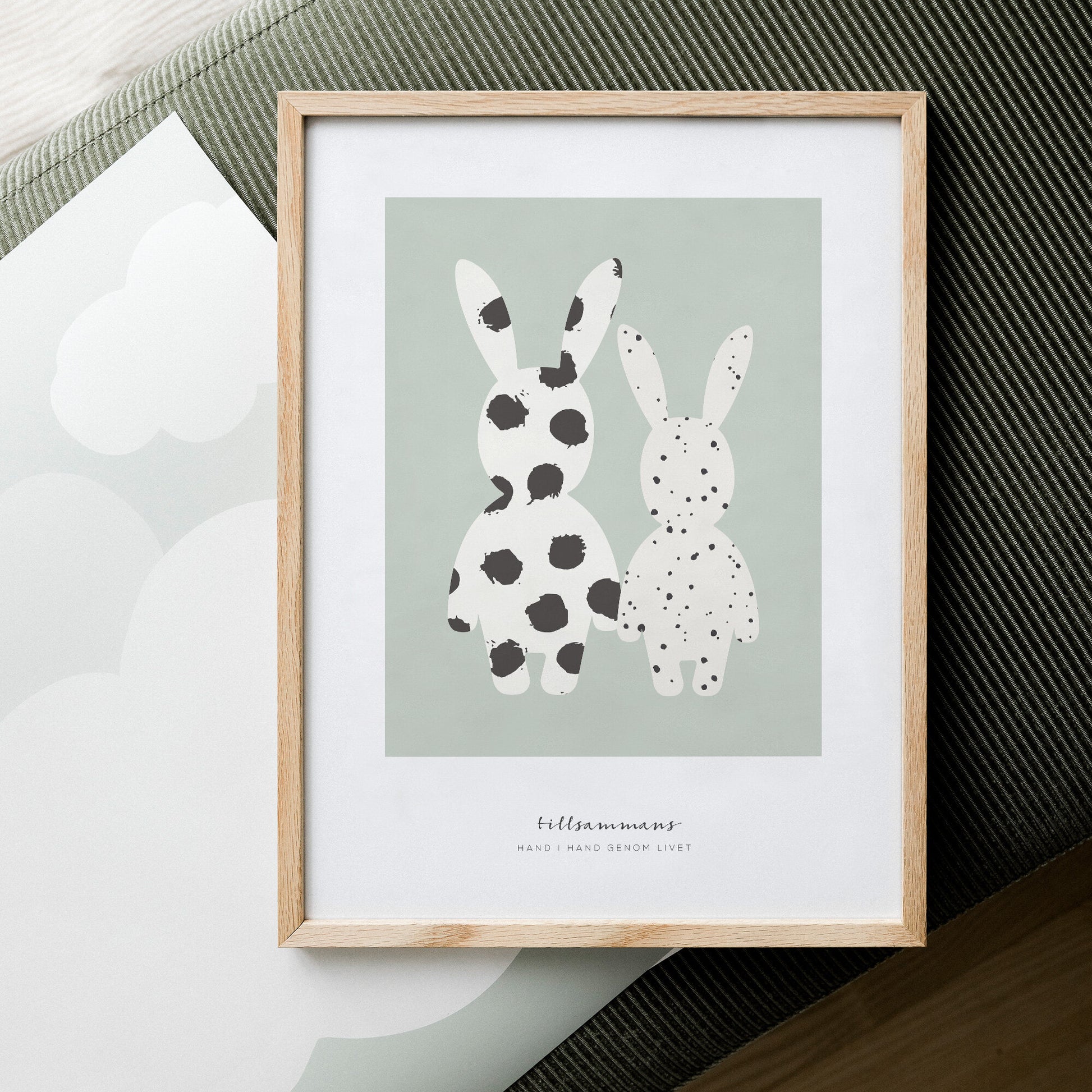 Alla behöver lite extra kärlek och trygghet i livet, stora som små. Små kaninkompisar fångar den varma känslan av samhörighet med sitt budskap: "Tillsammans, hand i hand genom livet." Ett stilrent motiv i lugna gröna toner som symboliserar vänskap och familjeband. Perfekt för barnrummet eller som en omtänksam gåva till ett syskonpar, en nyfödd eller någon du håller kär. Lika fin ensam som i en tavelvägg.