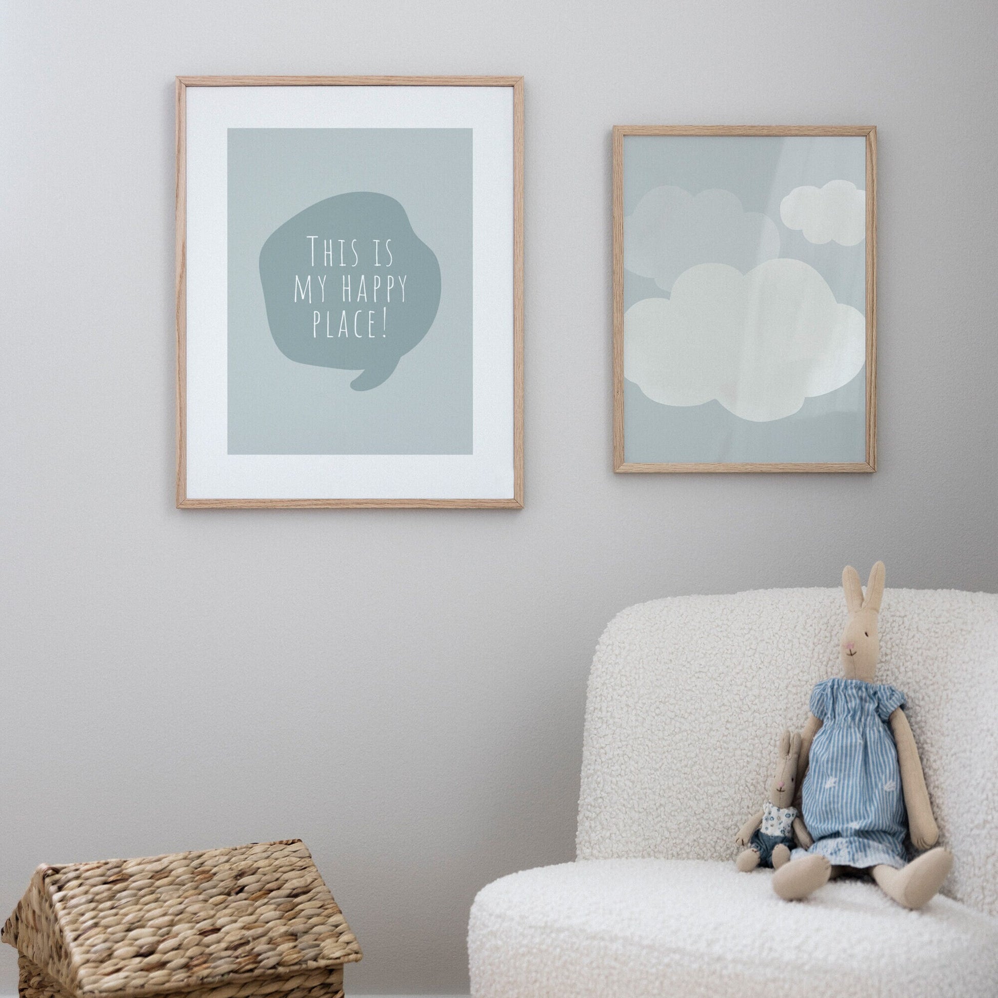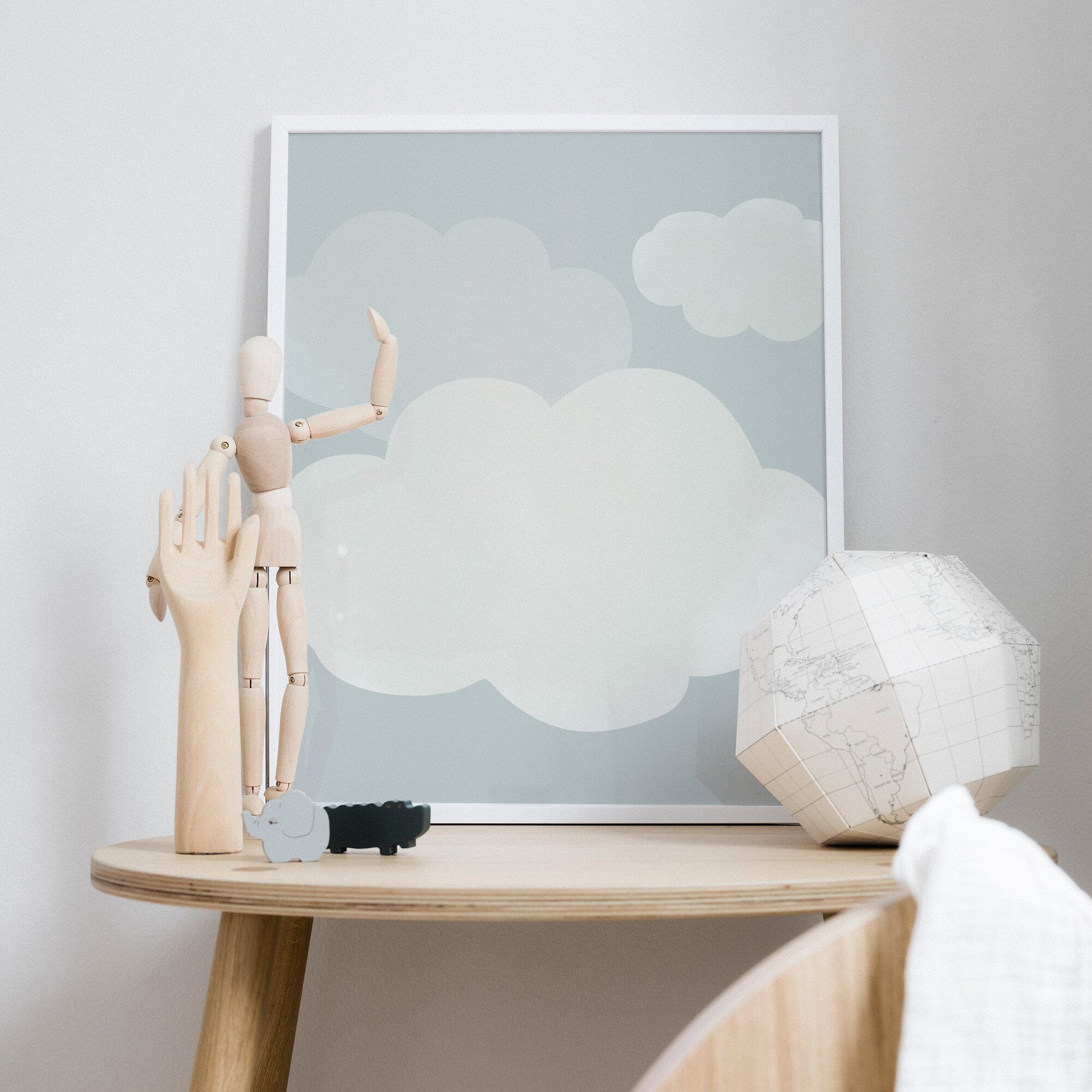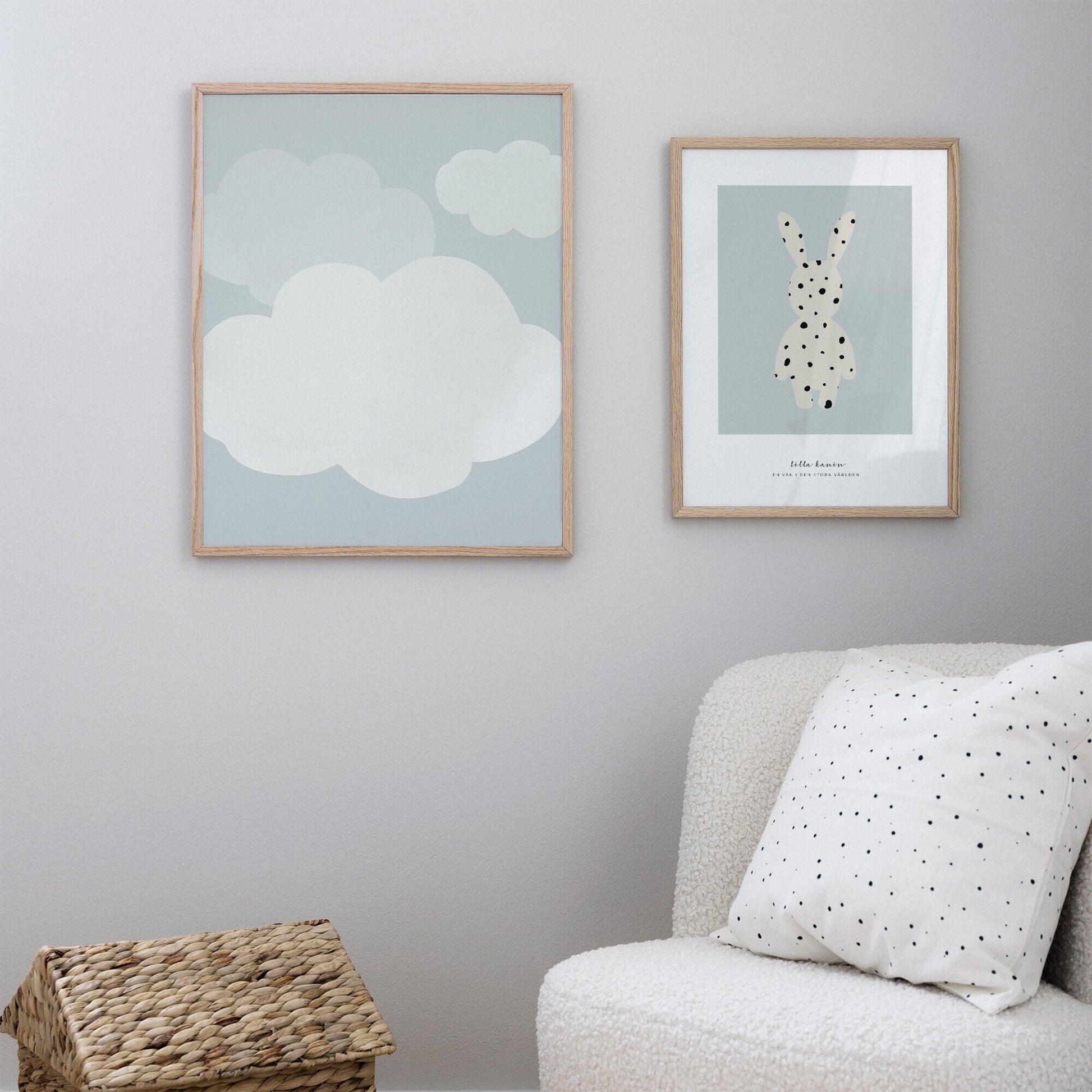 Små lätta moln poster illustrerar gulliga moln i en mjuk färgställning. Lätt att väva in i barnrummets tavelvägg eller placera precis ovanför barnsängen, och bjuda in till söta drömmar.
