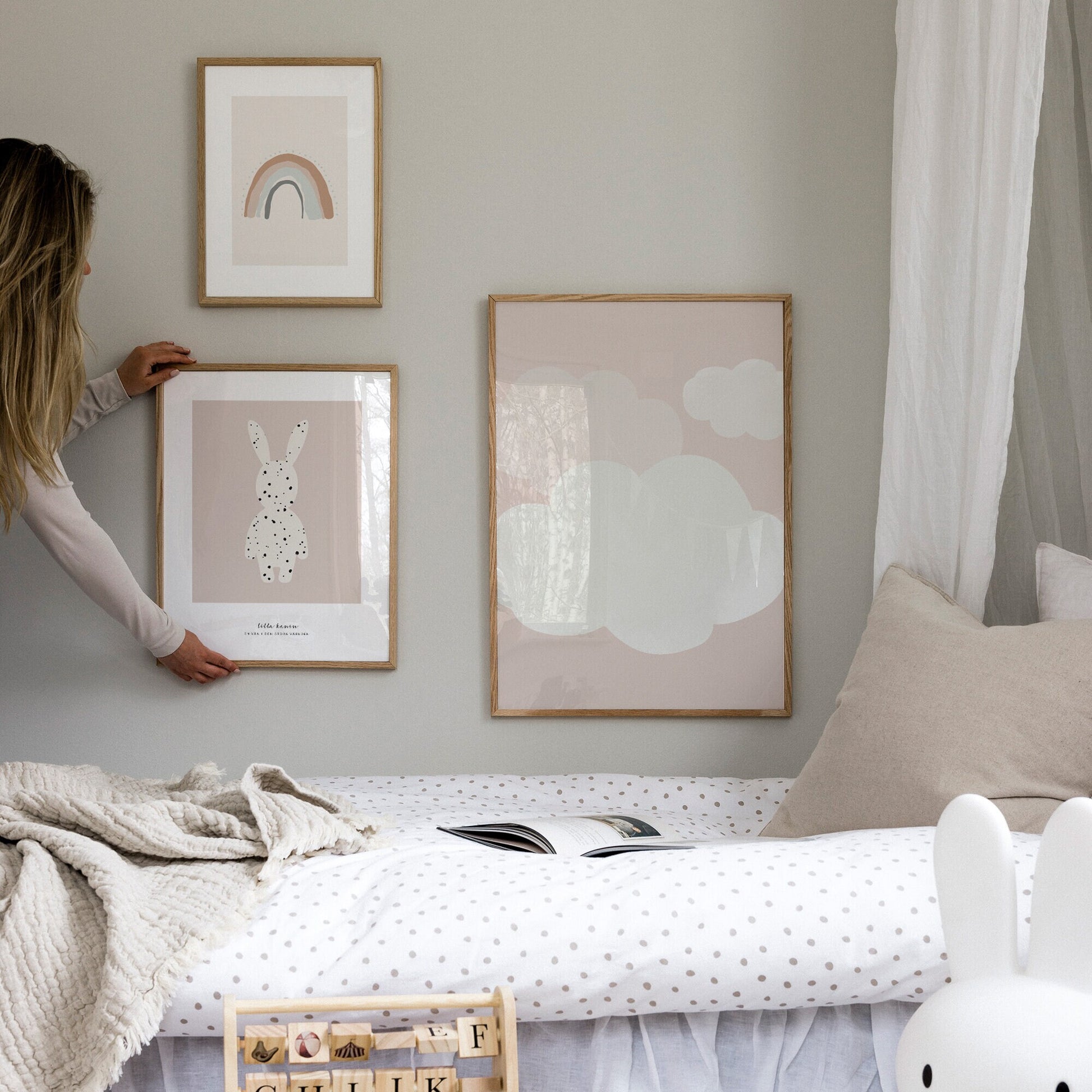 Små lätta moln poster illustrerar gulliga moln i en mjuk färgställning. Lätt att väva in i barnrummets tavelvägg eller placera precis ovanför barnsängen, och bjuda in till söta drömmar.