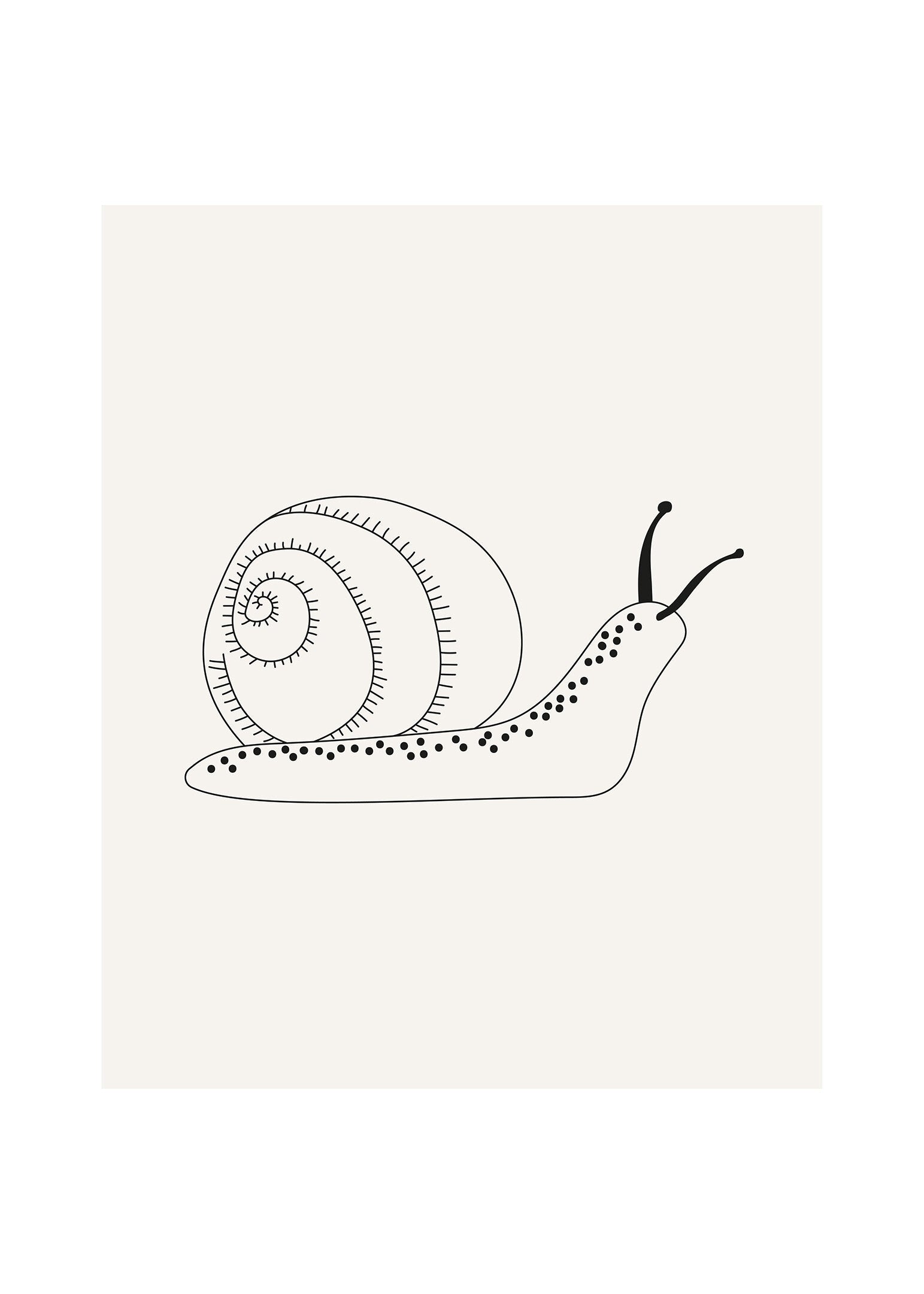 Poster med snigel på beige bakgrund, gullig i det minimalistiska barnrummet eller som ett avskalat inslag i en busig tavelvägg. Perfekt som present för den lilla som gärna nynnar till ”Lilla snigel”.