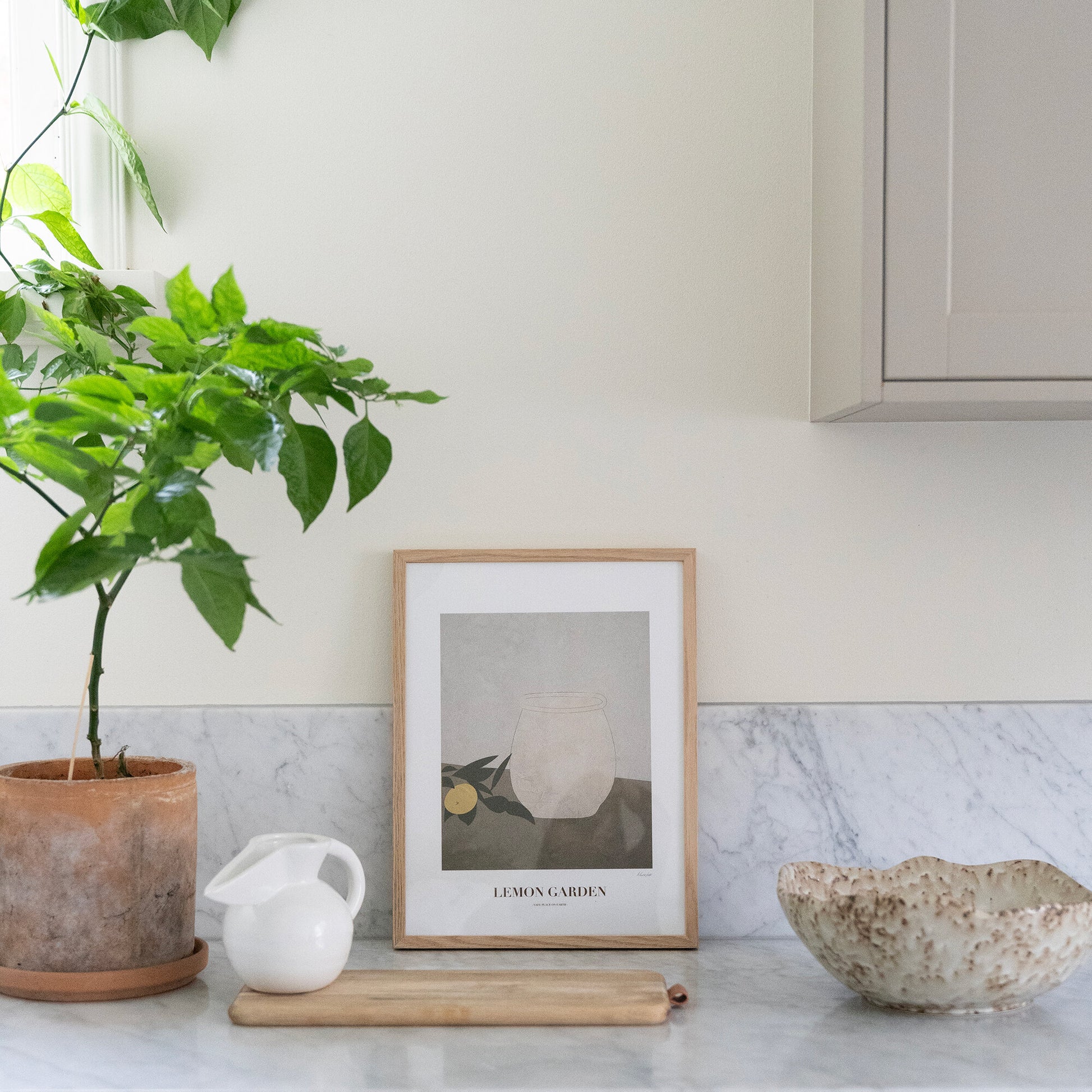 En stilren poster med ett harmoniskt stilleben av en citron och en rustik kruka. De mjuka, jordnära tonerna och den subtila akvarellkänslan ger motivet en tidlös och lugn estetik. Perfekt som kökstavla eller som en del av en tavelvägg i matsalen.