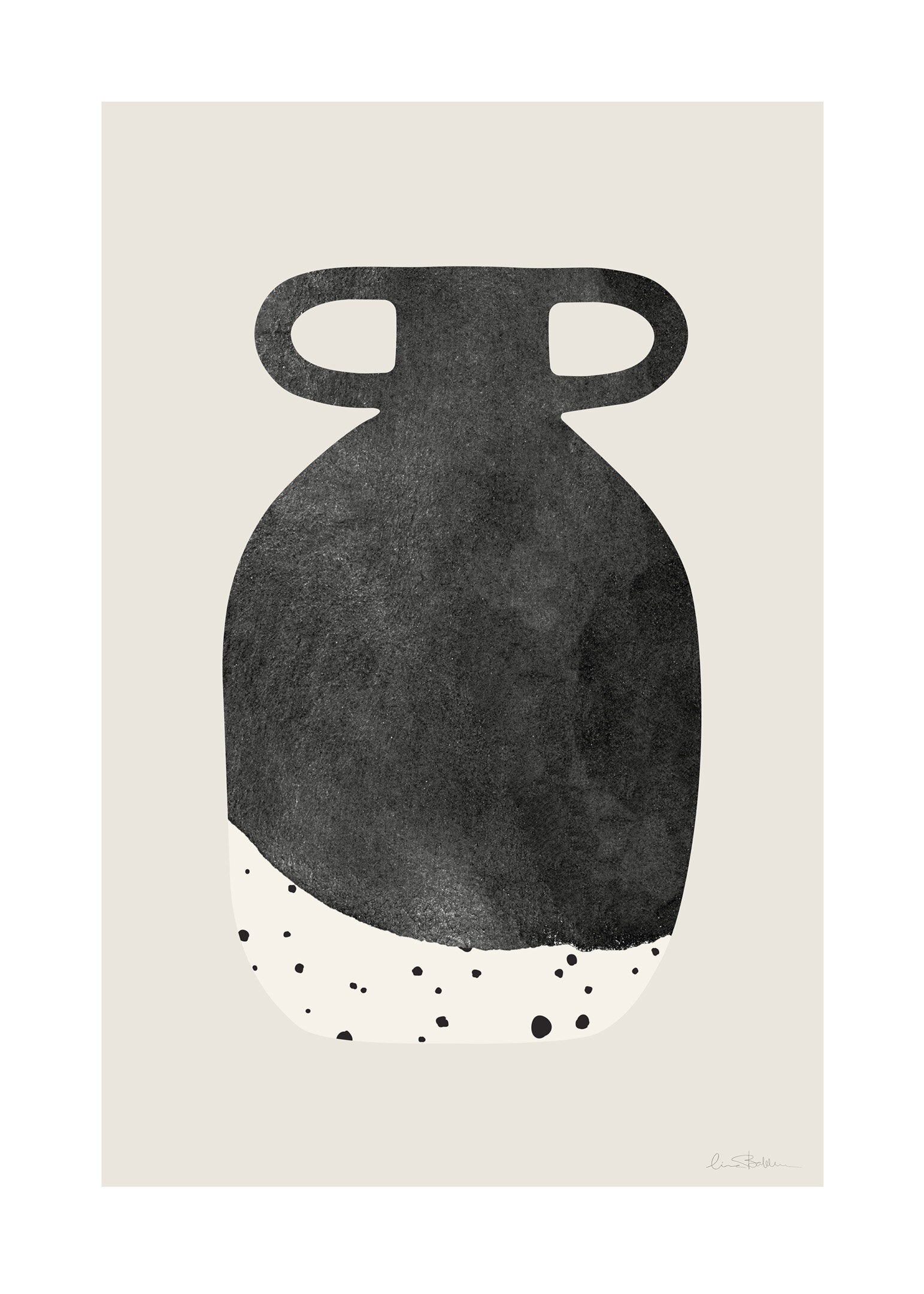 En grafisk poster med ett stiliserat motiv av en vas i mjuka, jordnära toner. Vasen har en djup, mörk nyans som övergår i ett organiskt prickmönster längst ner, vilket ger en subtil men effektfull kontrast. Det avskalade uttrycket gör att motivet passar både i en minimalistisk, skandinavisk inredningsstil och i mer eklektiska miljöer. Perfekt som en del av en tavelvägg eller för att skapa en harmonisk punkt på egen hand.