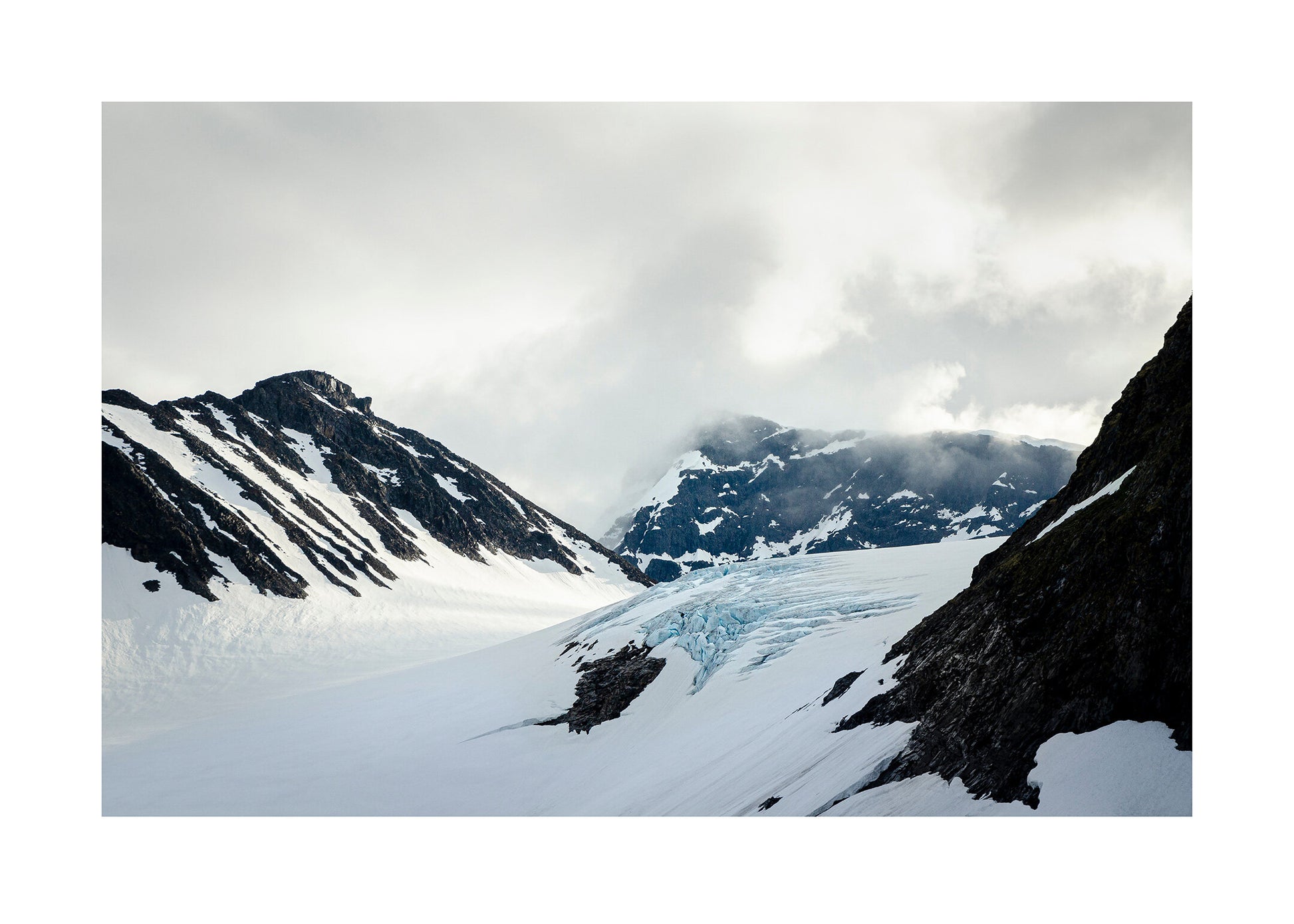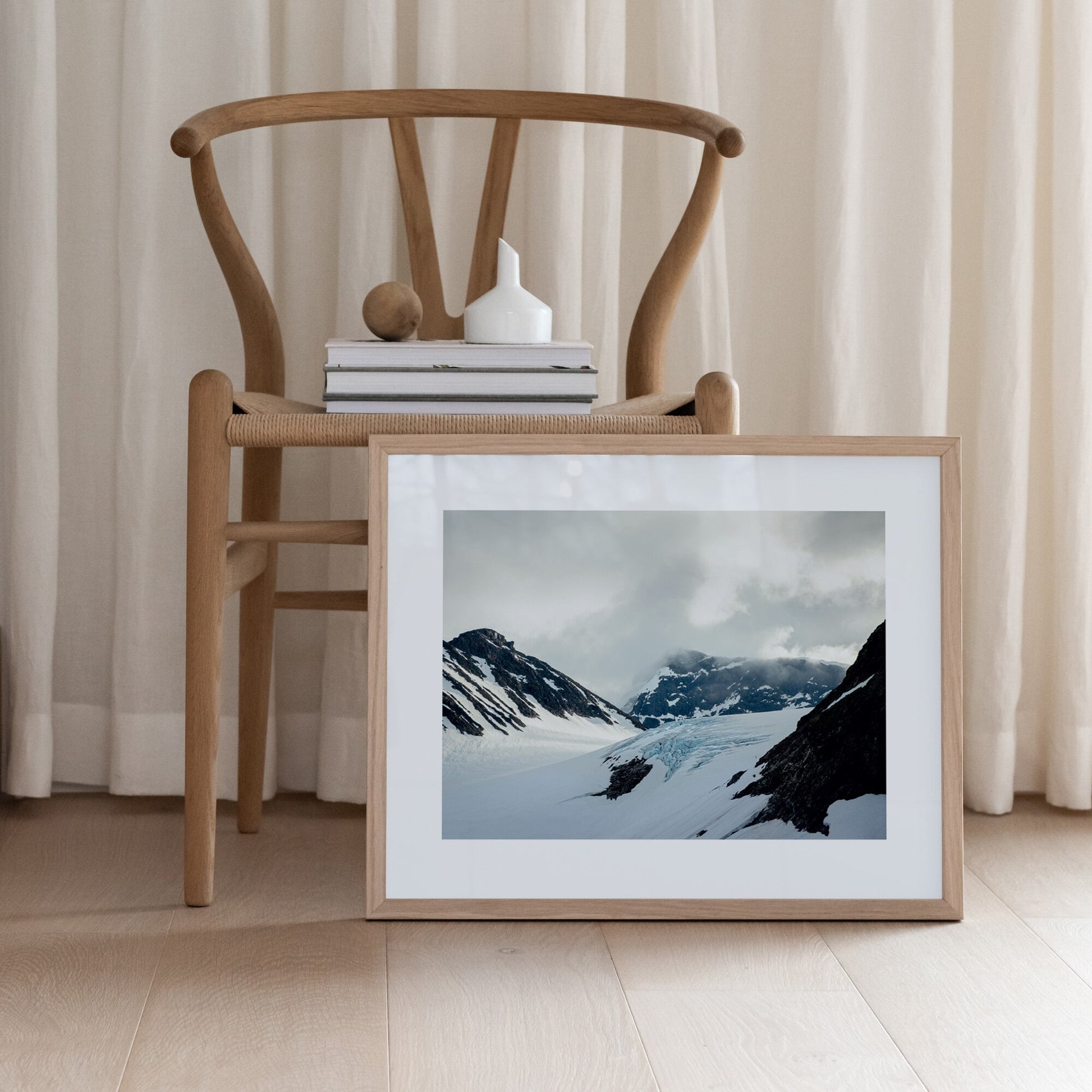 Upptäck Tarfaladalen, en poster med snöklädda fjäll och rogivande nordisk natur. Perfekt fotokonst för att skapa en harmonisk och inspirerande atmosfär i ditt hem.