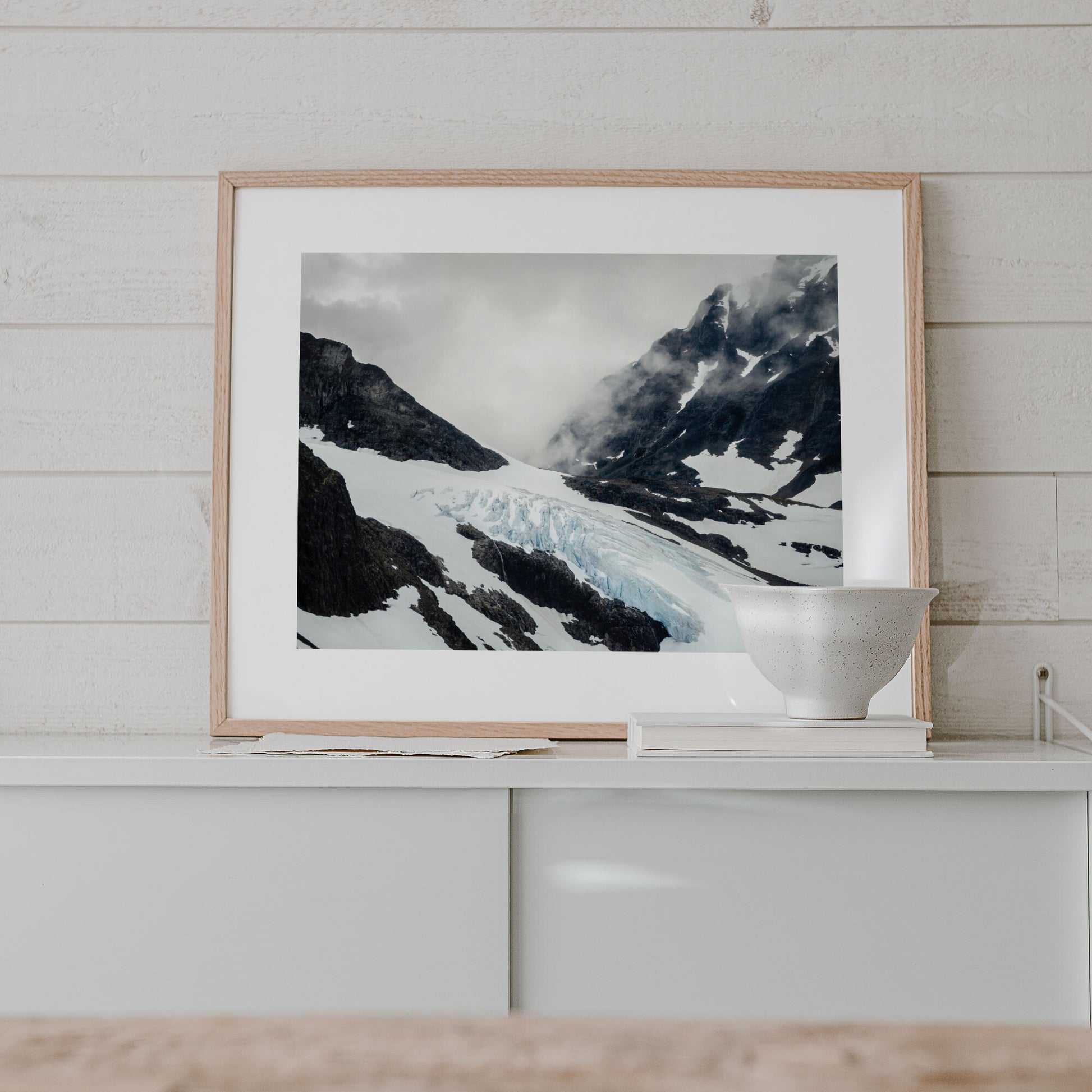 Tarfaladalen poster är ett storslaget fotografi som fångar den dramatiska skönheten i Tarfaladalen, belägen nedanför Sveriges högsta berg, Kebnekaise. Med snöklädda bergssidor, glaciärer och moln som sveper över topparna förmedlar bilden en känsla av både kraft och lugn. Detta fotografi är ett perfekt val för naturälskare som vill addera nordisk vildmarkskänsla till sitt hem eller kontor. Ett tidlöst konstverk som passar utmärkt i såväl moderna som klassiska inredningar.