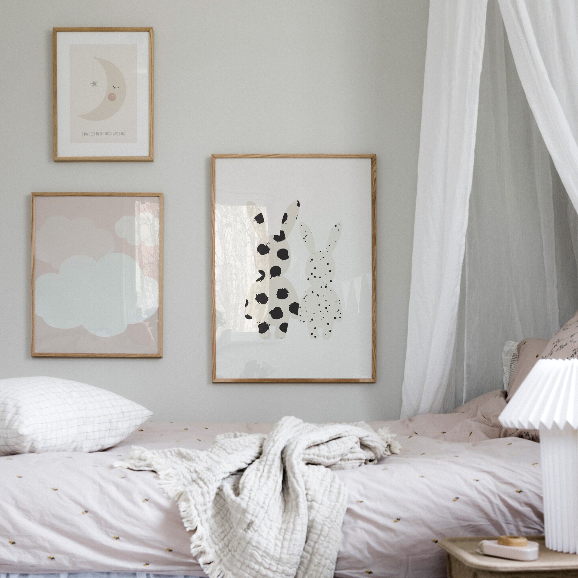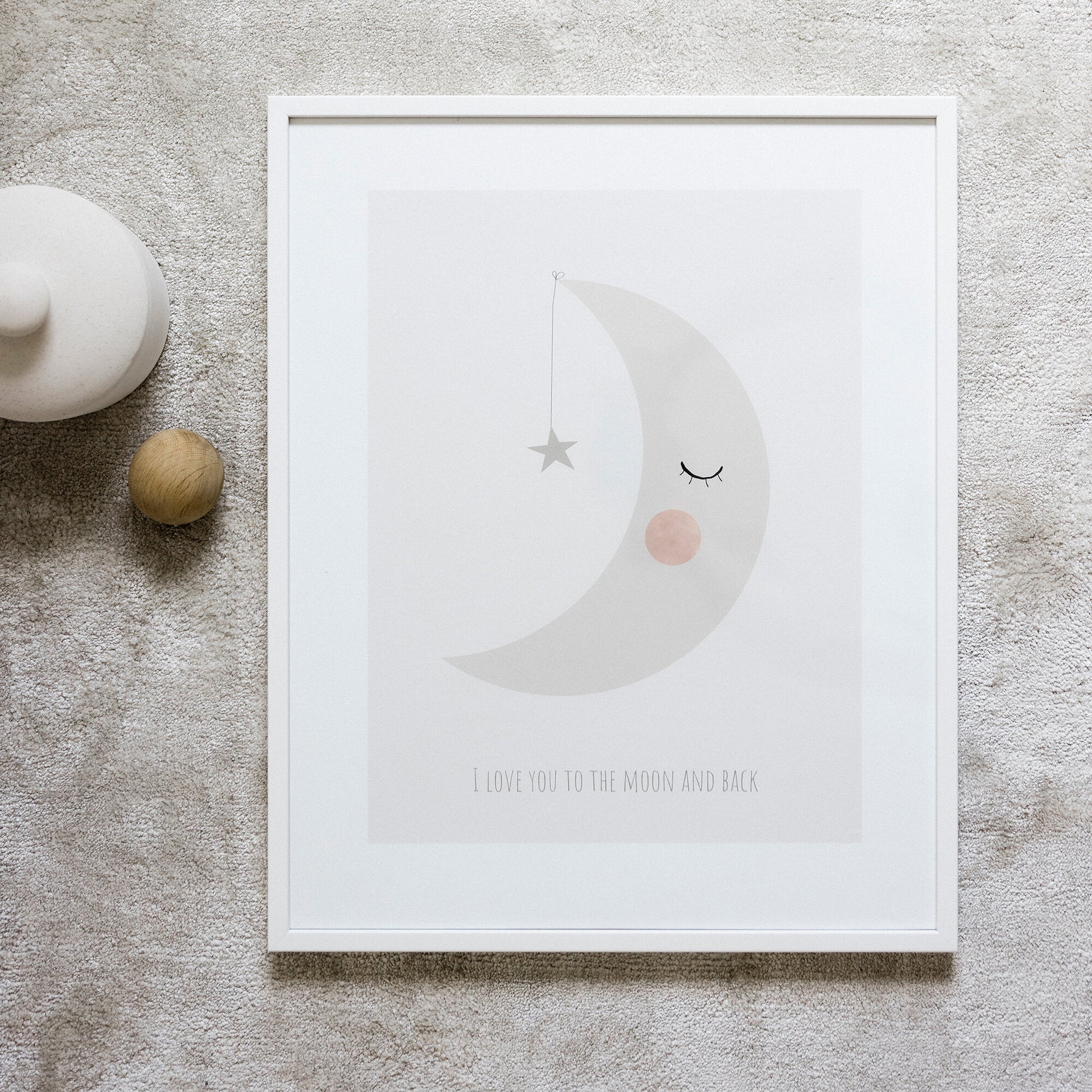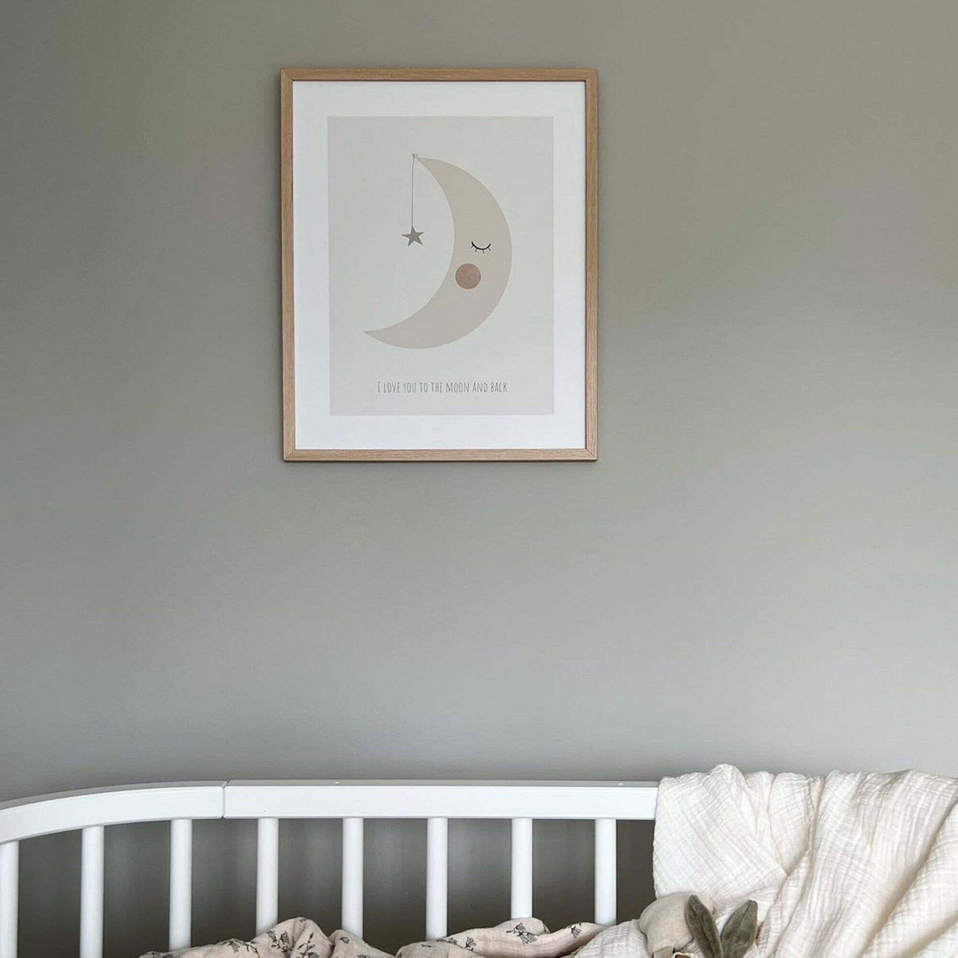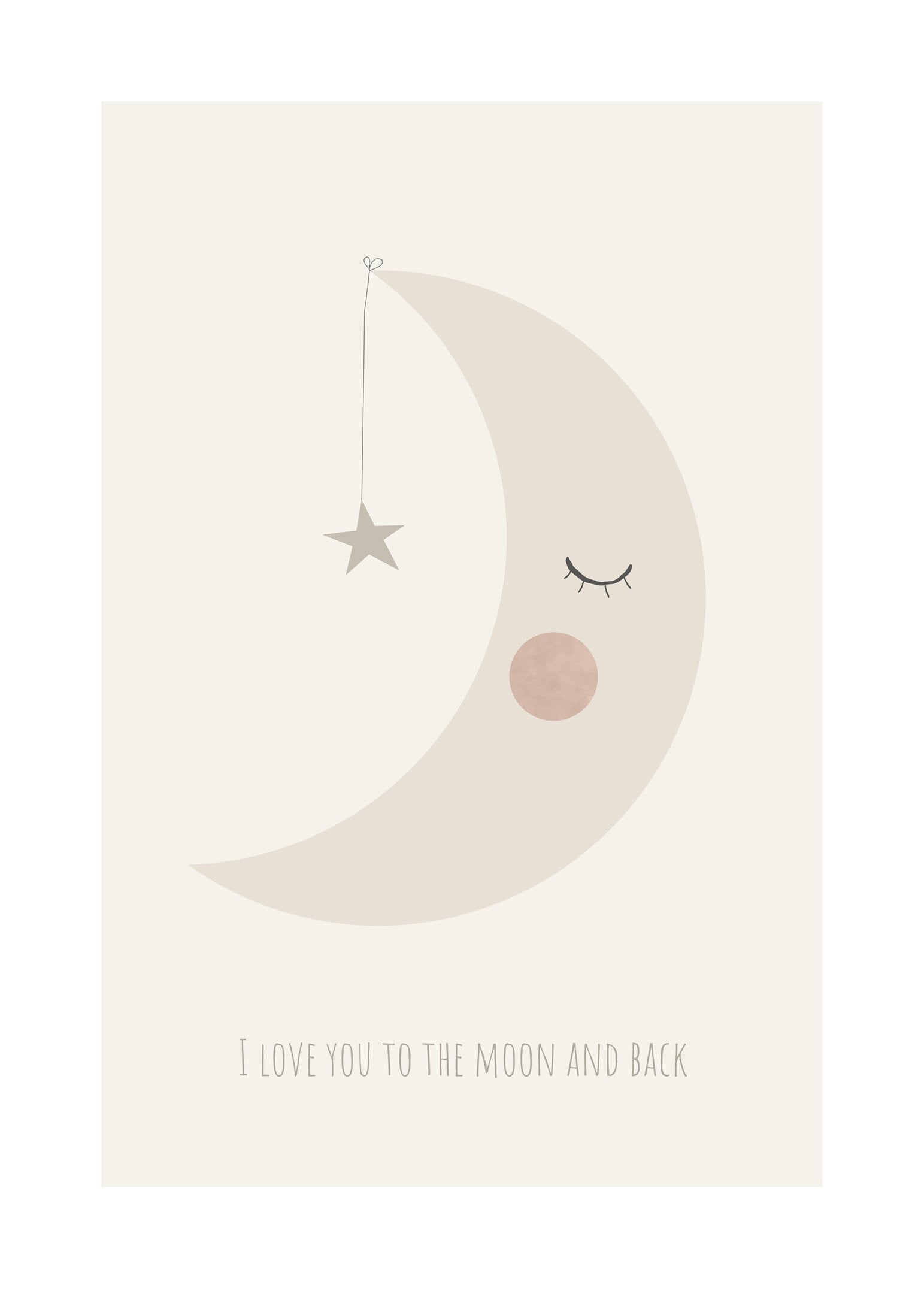 En lugnande och söt poster för barnrummet med en vilande måne och en stjärna, tillsammans med den kärleksfulla frasen I love you to the moon and back. De mjuka färgerna skapar en trygg och harmonisk känsla, perfekt ovanför sängen eller mysiga hörnan i rummet. En uppskattad gåva till nyfödda, dop eller födelsedag.