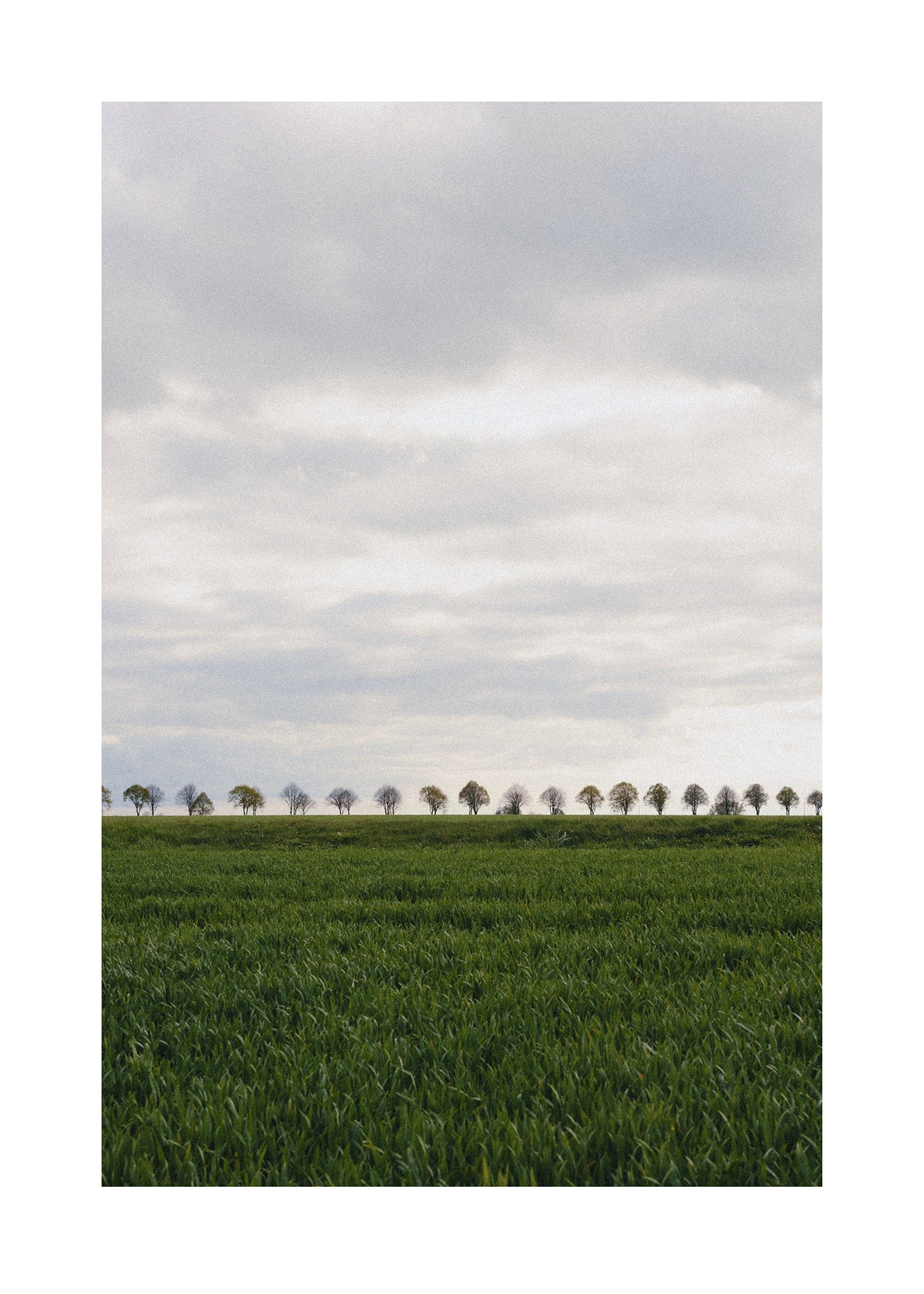 Upptäck naturens harmoniska precision med Trädsymmetri fotoposter. En rad träd skapar en stilren linje mot en vidsträckt äng, inramad av en mjukt melankolisk himmel. Ett motiv som förmedlar lugn, balans och en subtil elegans – perfekt för den som uppskattar minimalistisk naturfotografi.