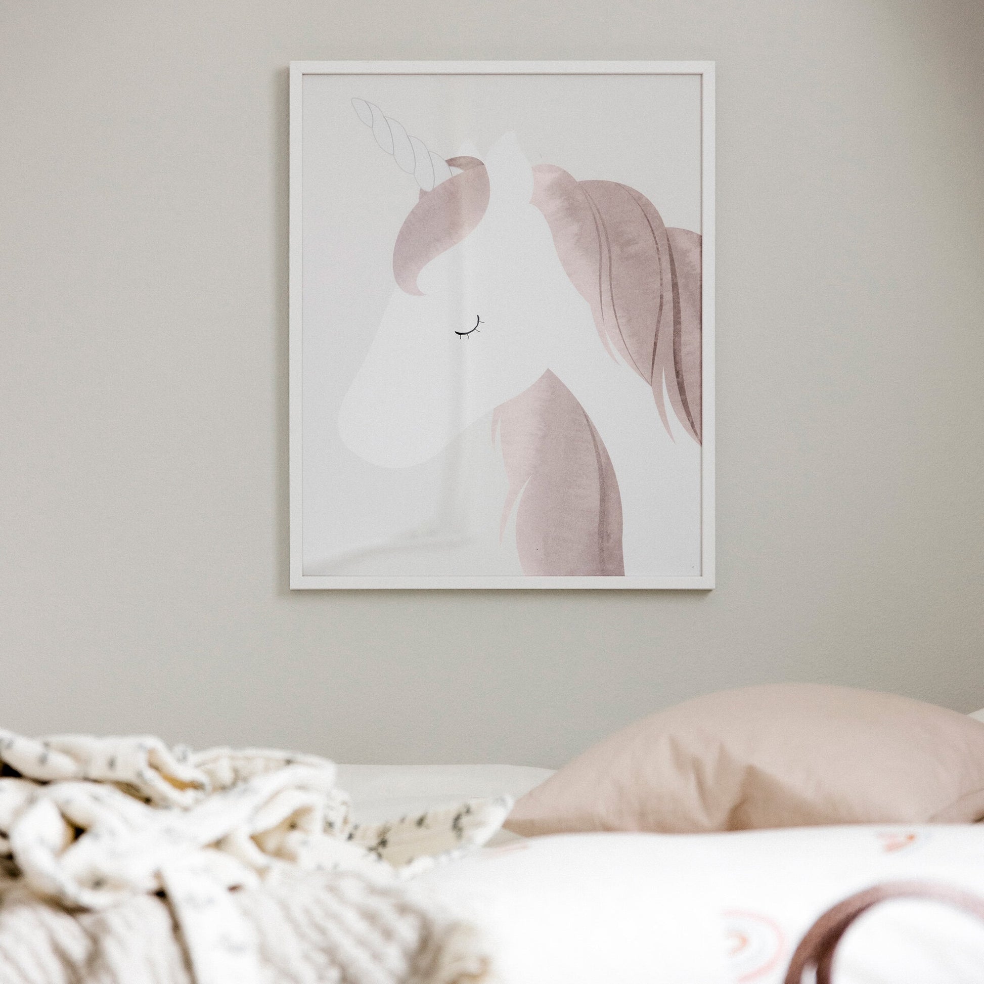 Unicorn poster illustrerar en drömlik enhörning för barnrummet, i mjukaste nyanser av beige, rosa och nude. Så fin att matcha till våra andra barnposters i par eller i tavelvägg!