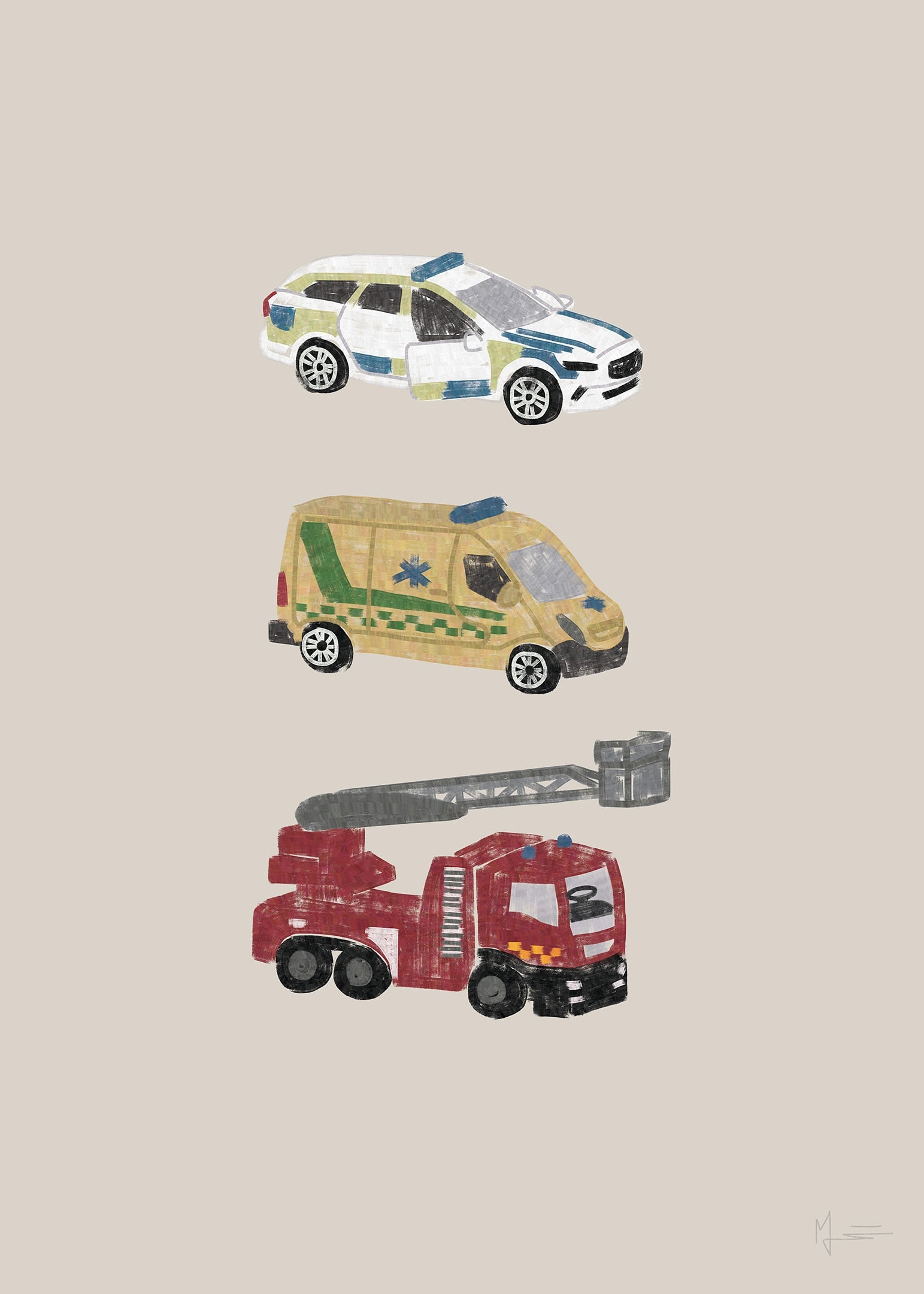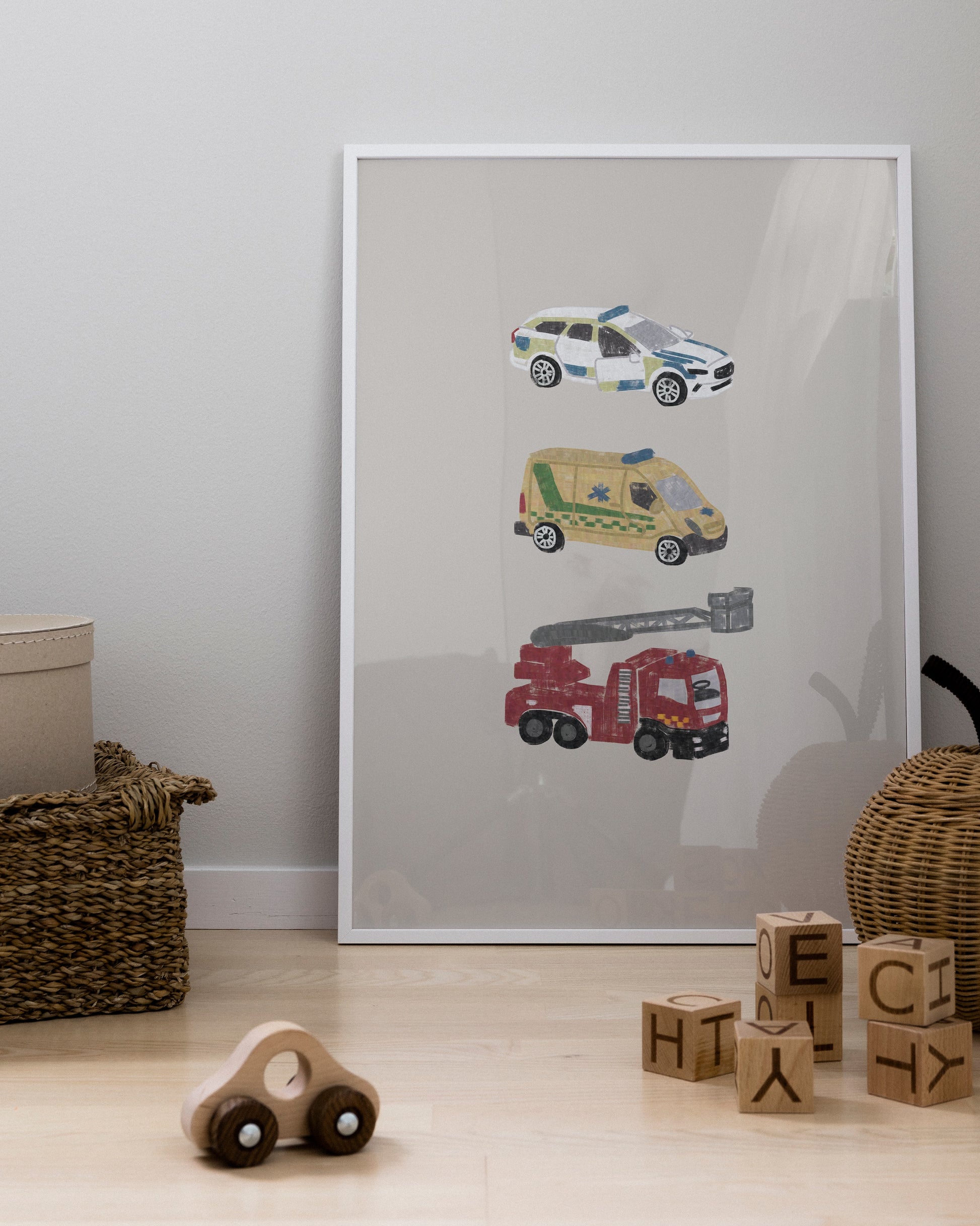 Fyll barnrummet med spänning och äventyr med vår Utryckningsfordon poster! Motivet visar tre detaljerade utryckningsfordon – en brandbil, en ambulans och en polisbil – som inspirerar till lek och fantasi. Den charmiga designen passar perfekt för små fordonsfantaster och skapar en dynamisk atmosfär i pojkrum eller lekrum. En dekorativ och pedagogisk tavla som fångar barns fascination för fordon och utryckning.