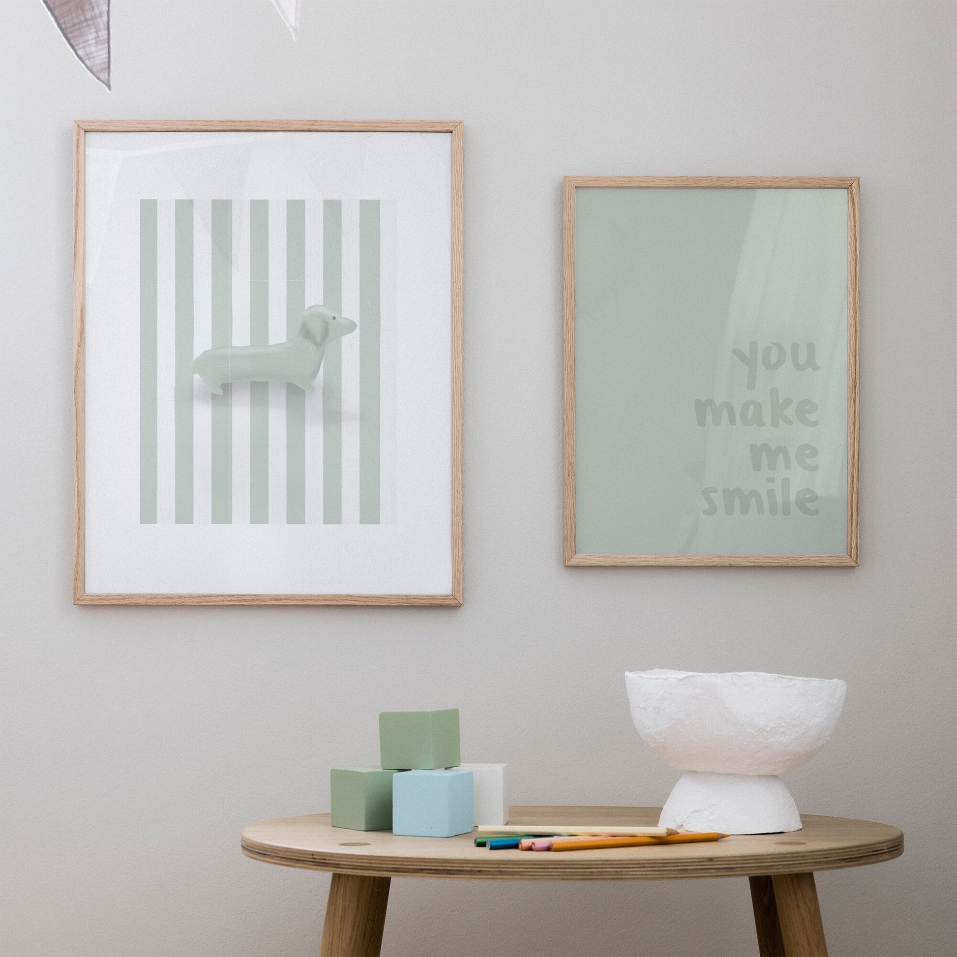 Sprid glädje i barnrummet med postern You make me smile – en mjukt grön bakgrund med kärleksfull text som påminner om de små ögonblicken av lycka. Perfekt att kombinera med andra motiv som moln, regnbågar eller stjärnor för att skapa en harmonisk tavelvägg. En fin detalj för barnets rum eller som en omtänksam gåva till någon du tycker om.
